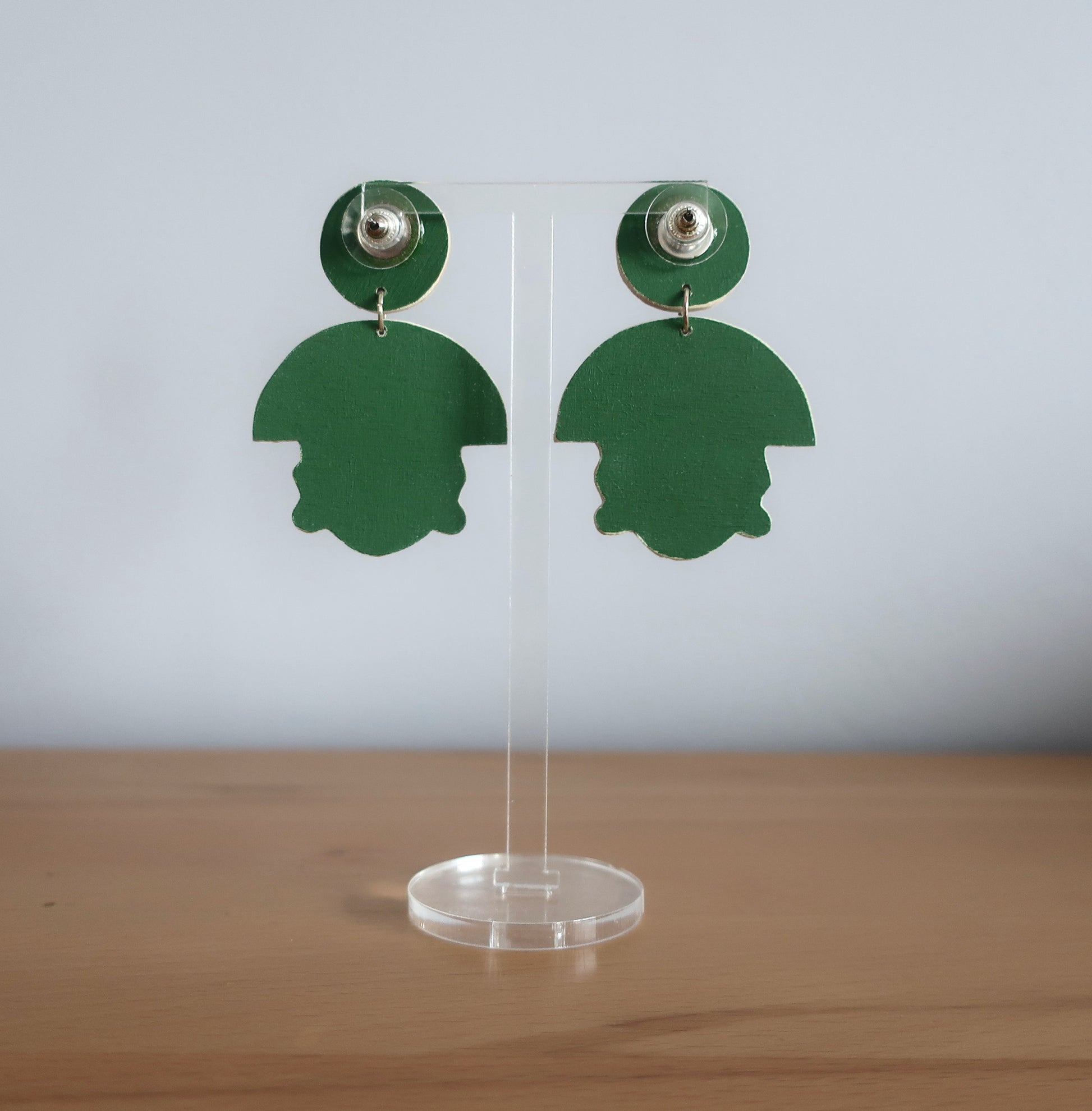 Für diese Ohrringe habe ich eine Zeichnung am Computer erstellt, die ich anschließend manuell auf Birkenholz übertragen und dann mit einer Dekupiersäge ausgesägt habe. Um die Haltbarkeit zu verbessern wurde eine Schicht matter Lack aufgetragen.