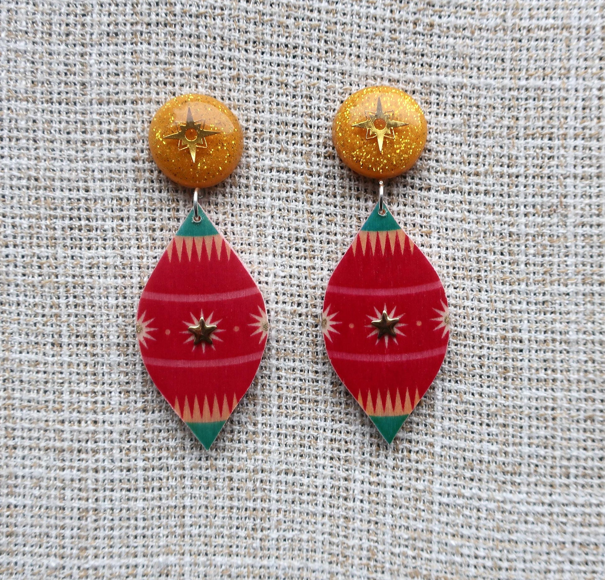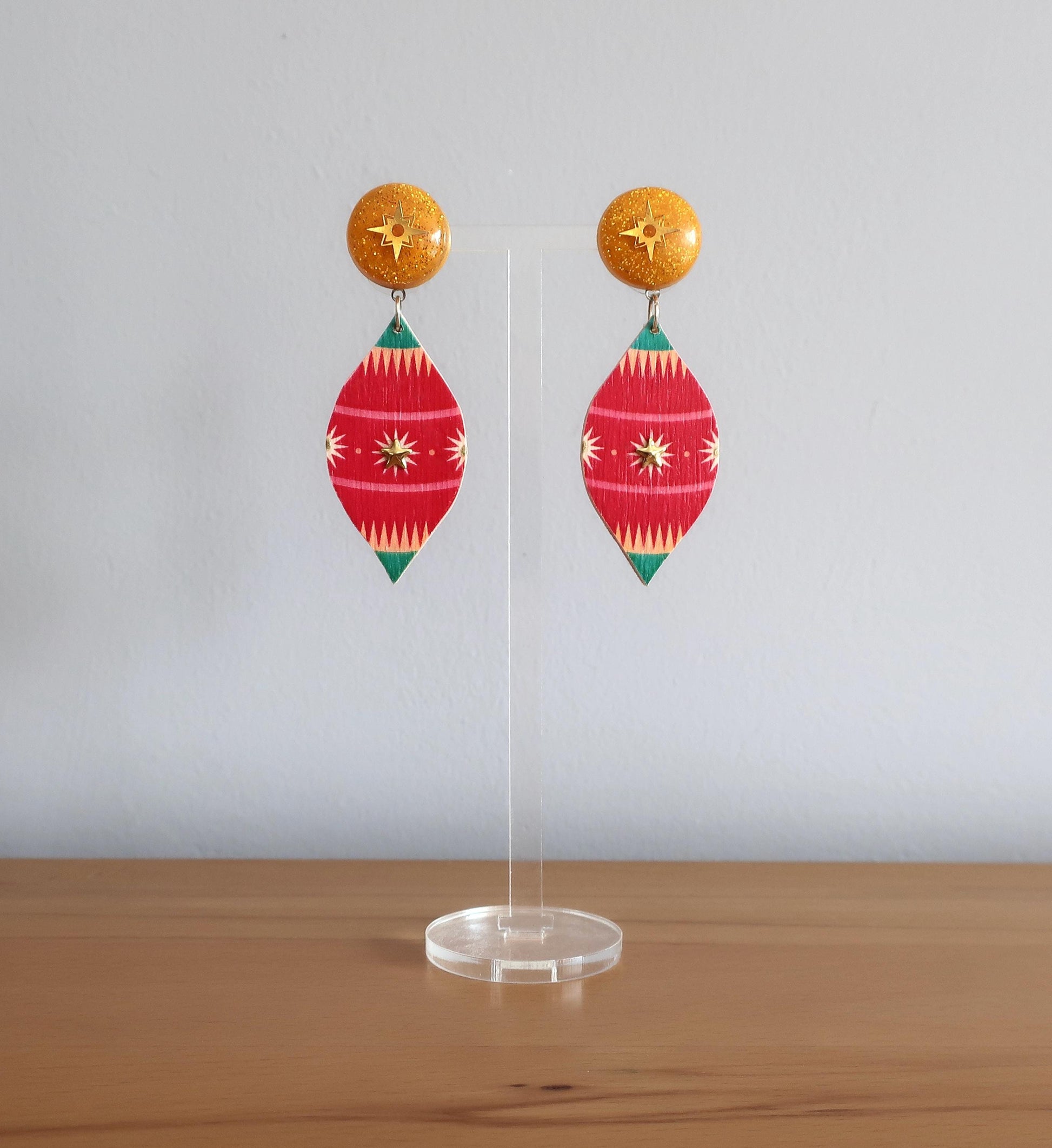 Materialien: Birkensperrholz, Epoxidharz, Sterncabochon, sternförmige Nieten, Edelstahlstecker, Binderinge