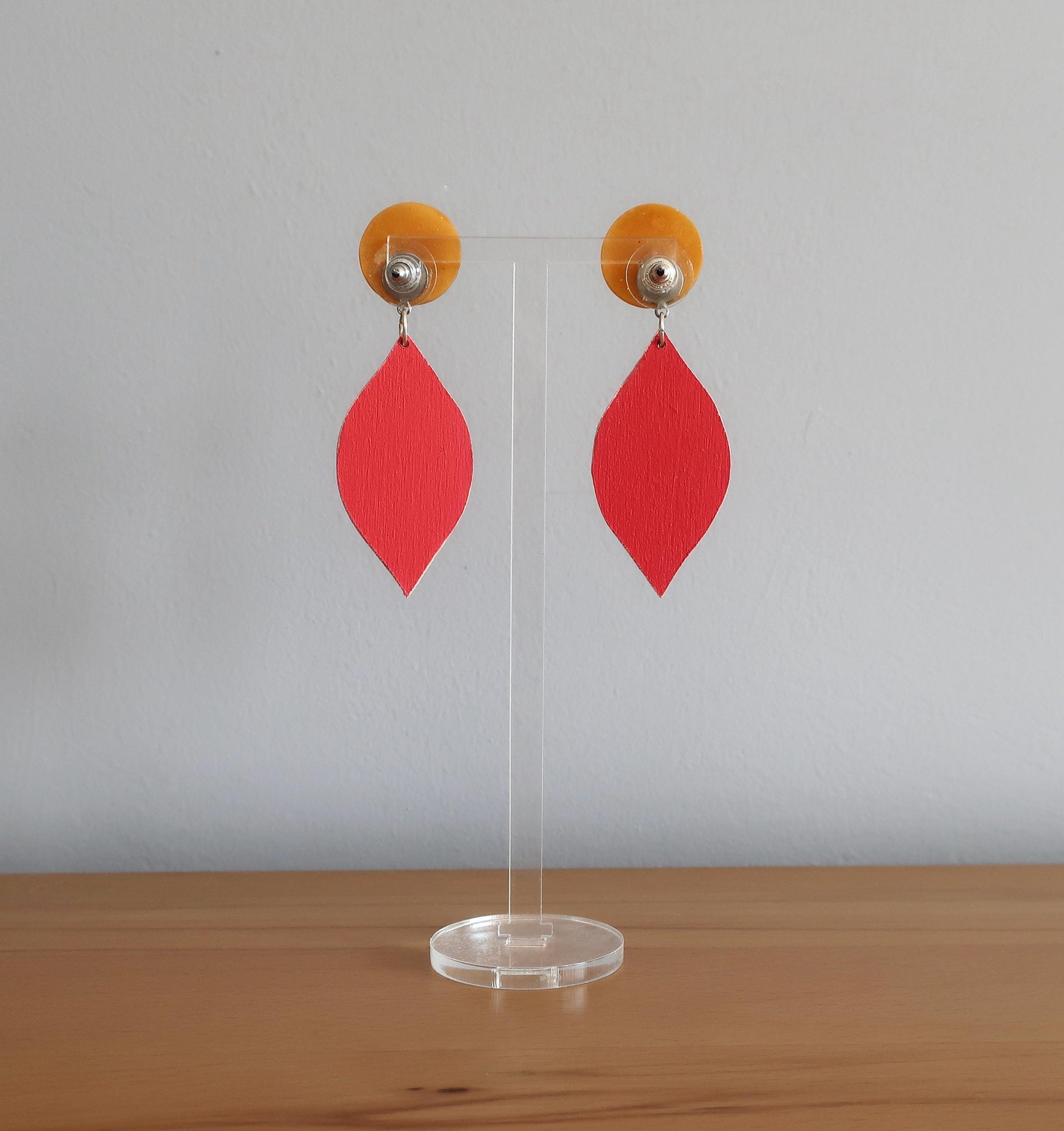 Für diese Ohrringe habe ich eine Zeichnung am Computer erstellt, die ich anschließend manuell auf Birkenholz übertragen und dann mit einer Dekupiersäge ausgesägt habe. Um die Haltbarkeit zu verbessern wurde eine Schicht matter Lack aufgetragen.