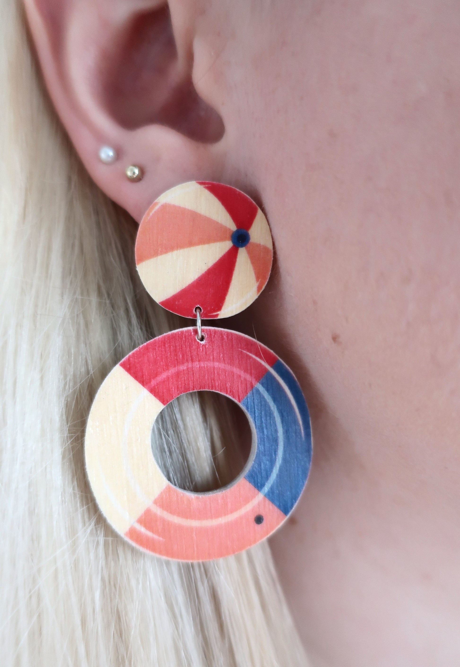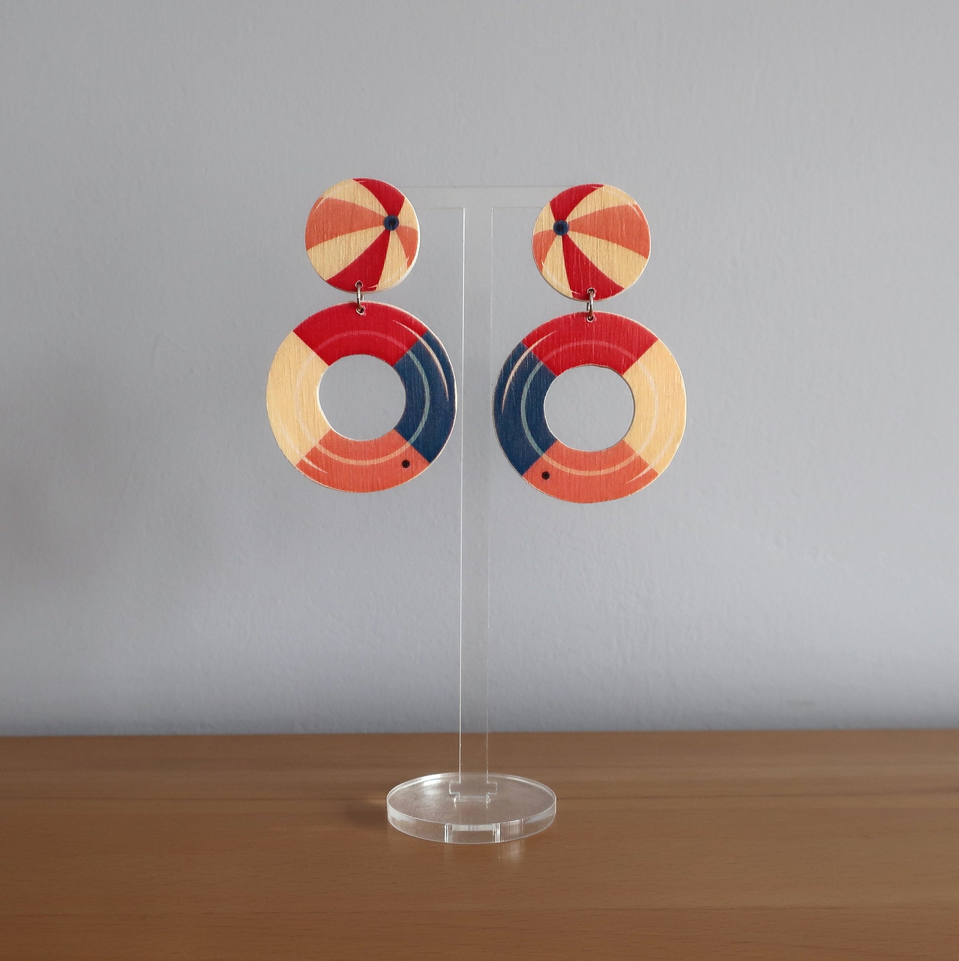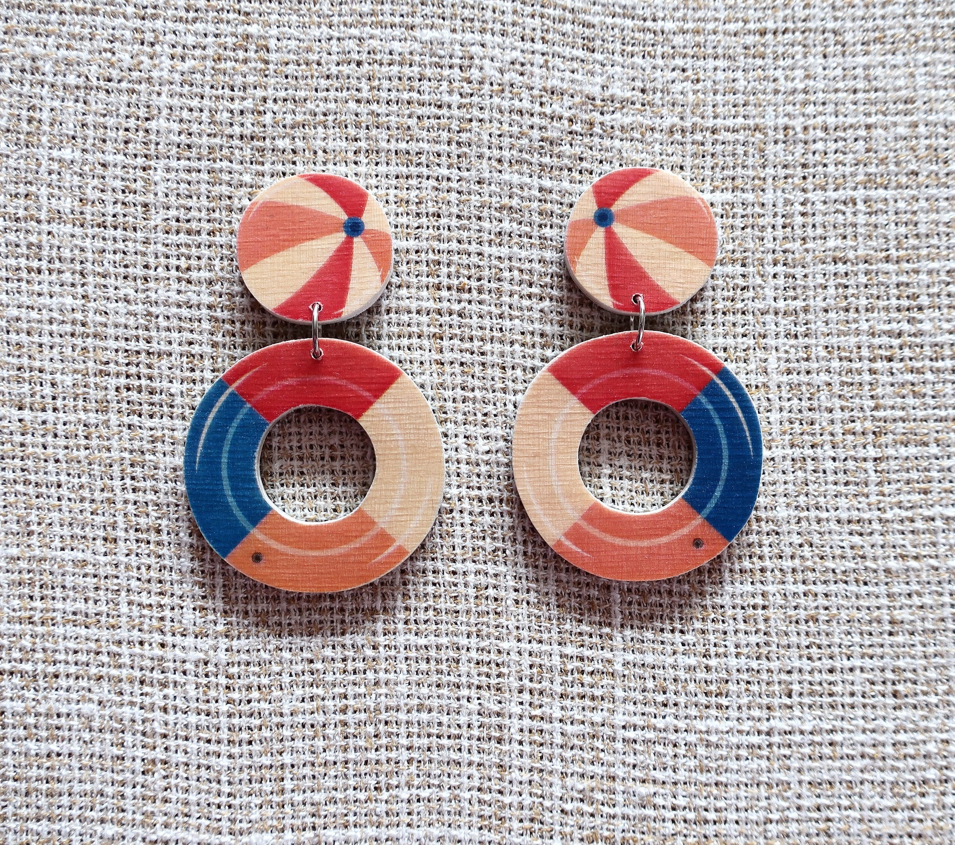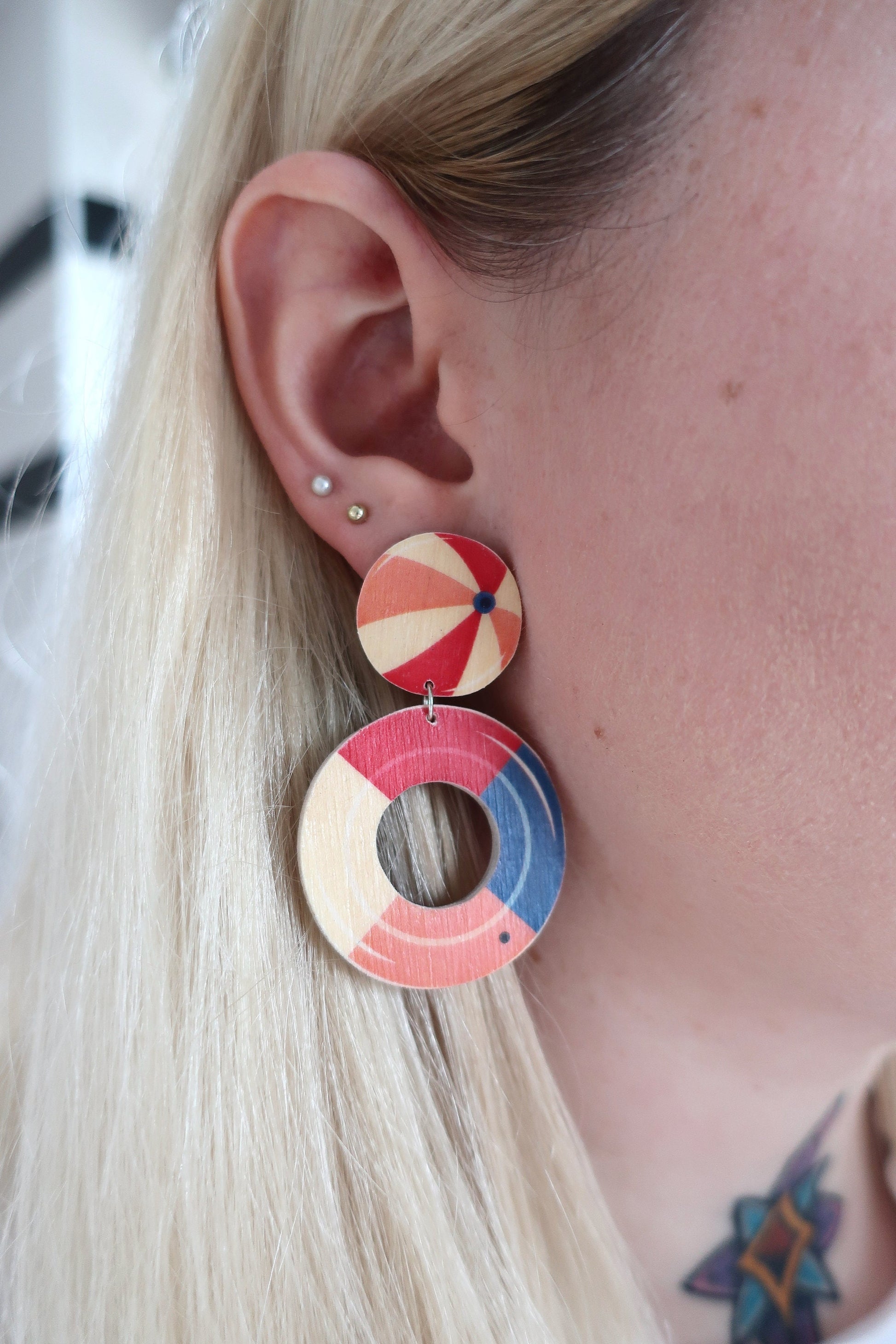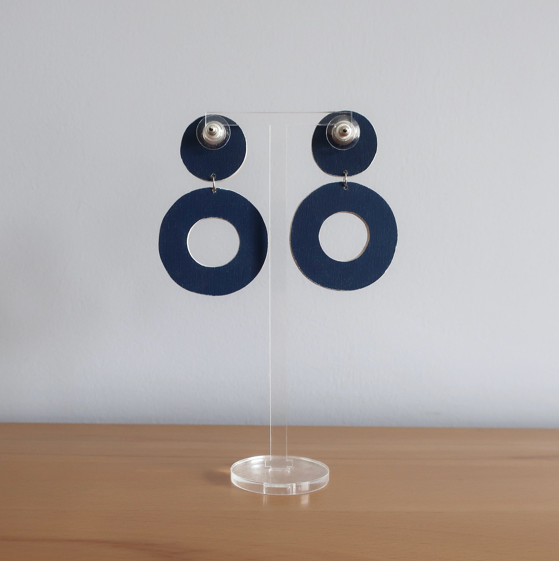 Für diese Ohrringe habe ich eine Zeichnung am Computer erstellt, die ich anschließend manuell auf Birkenholz übertragen und dann mit einer Dekupiersäge ausgesägt habe. Um die Haltbarkeit zu verbessern wurde eine Schicht matter Lack aufgetragen.
