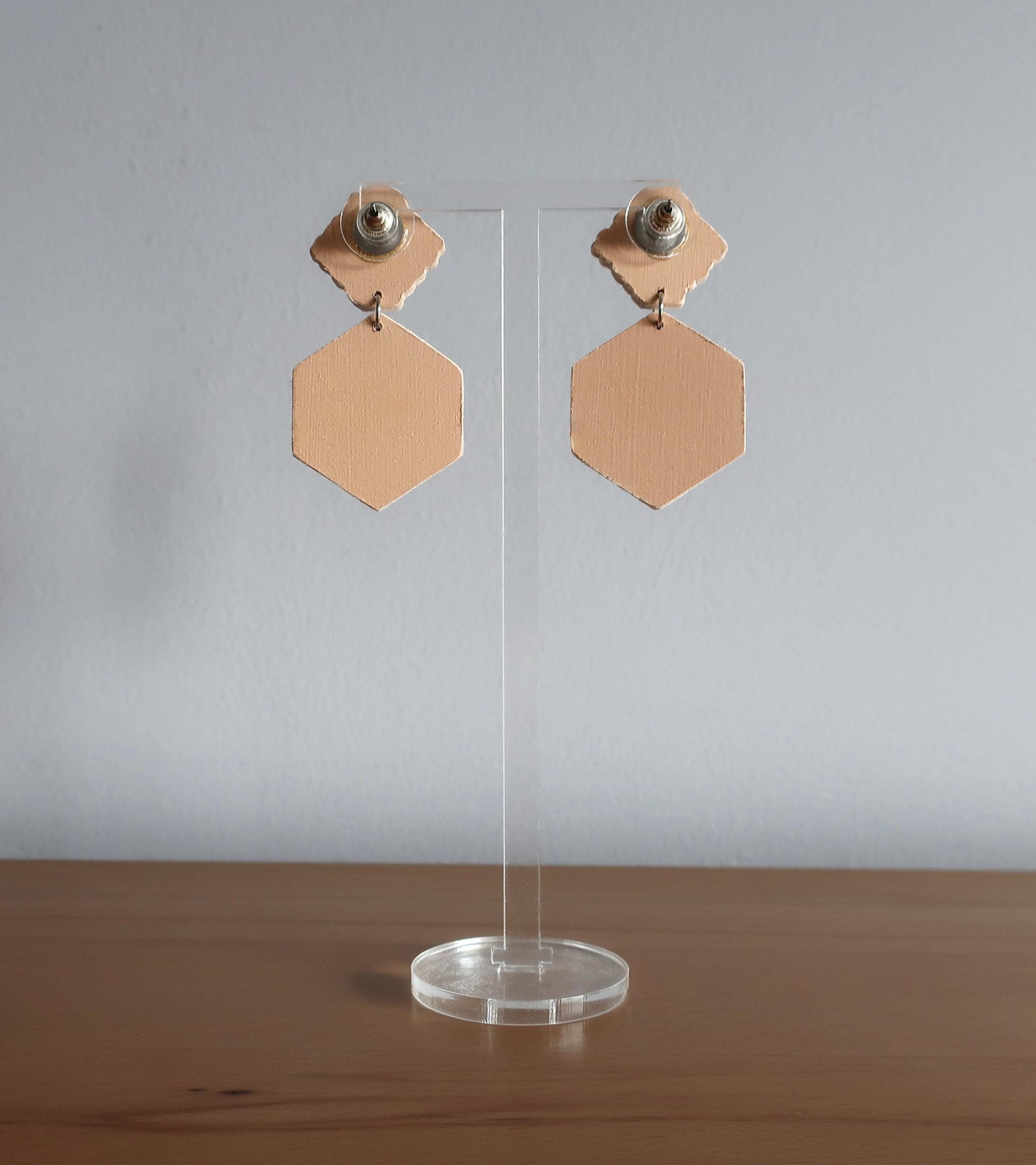 Für diese Ohrringe habe ich eine Zeichnung am Computer erstellt, die ich anschließend manuell auf Birkenholz übertragen und dann mit einer Dekupiersäge ausgesägt habe. Um die Haltbarkeit zu verbessern wurde eine Schicht matter Lack aufgetragen.