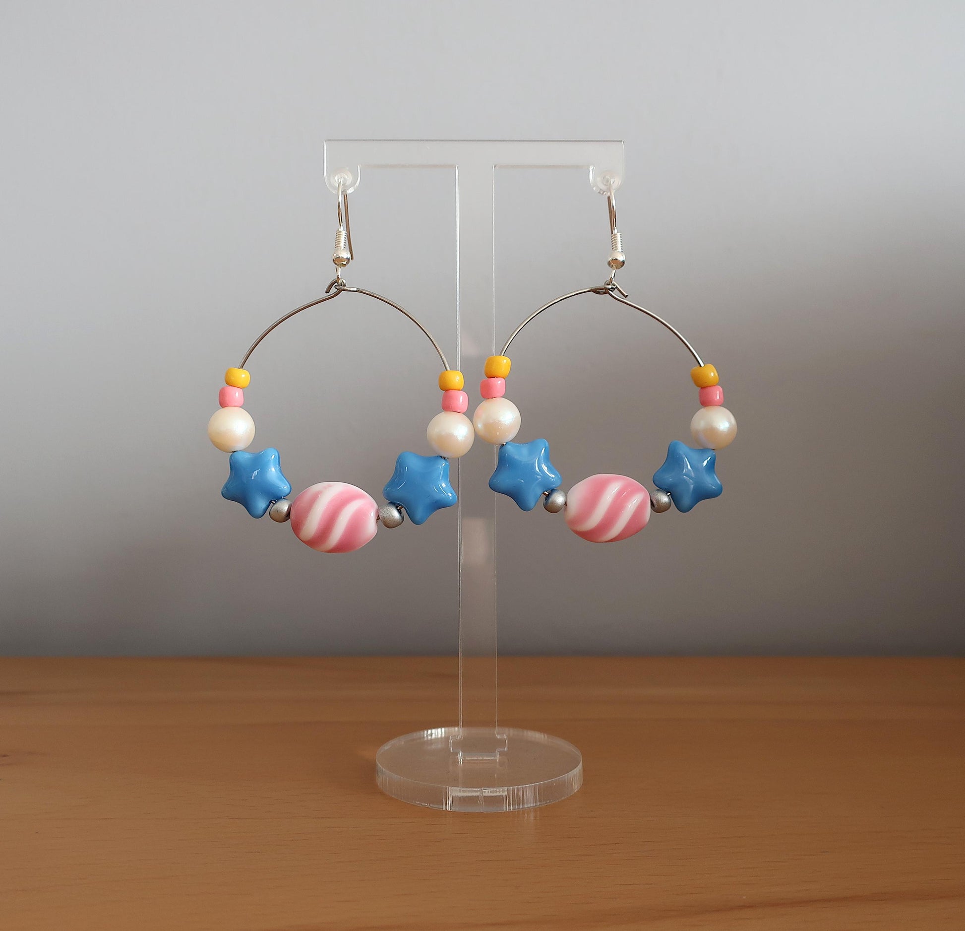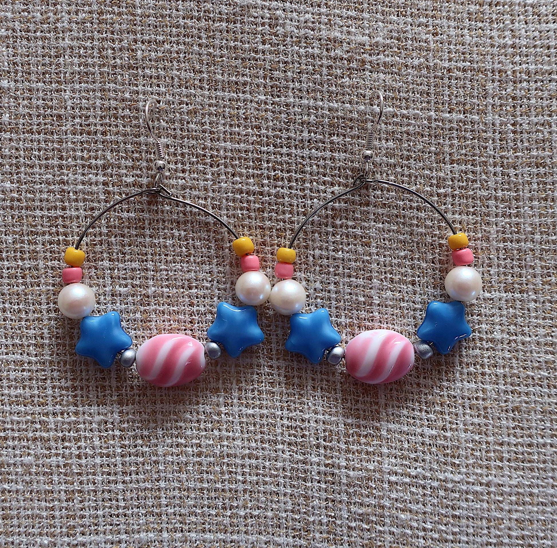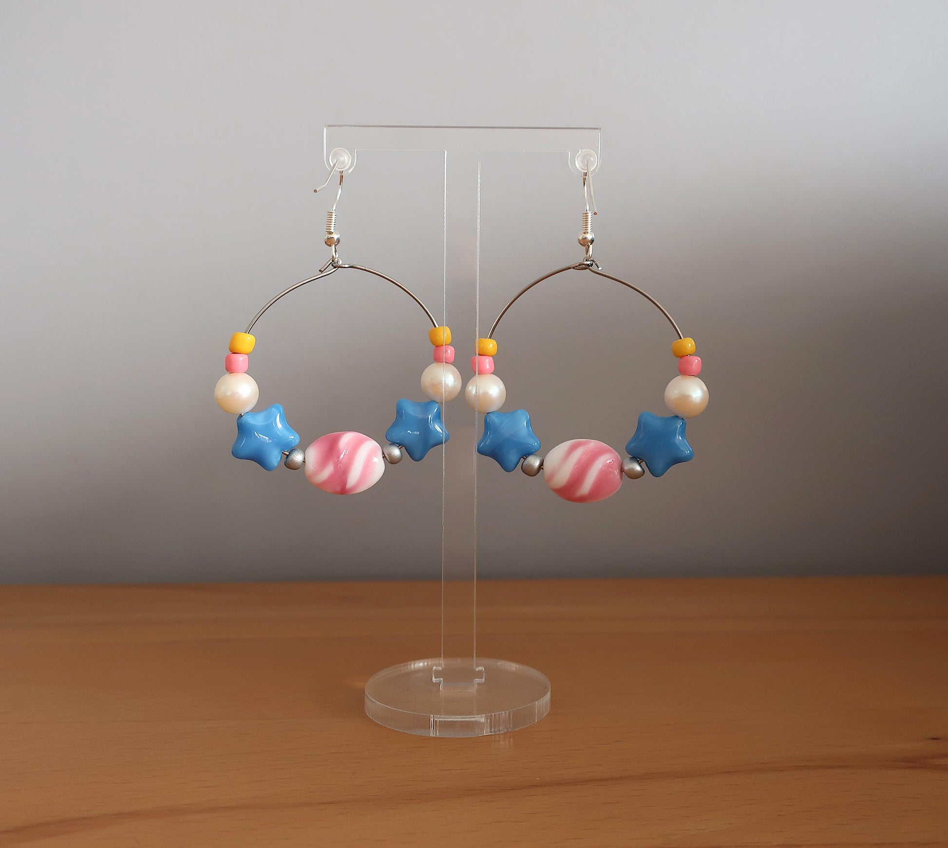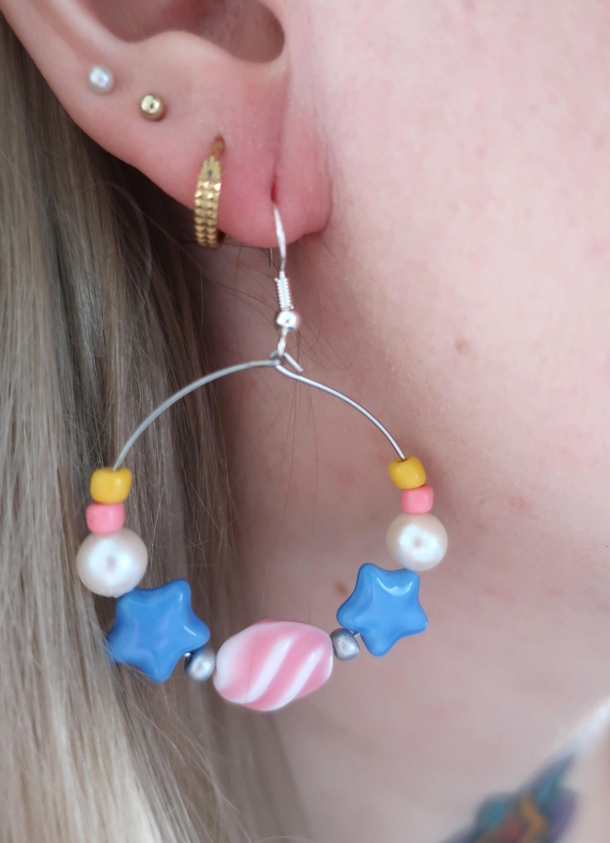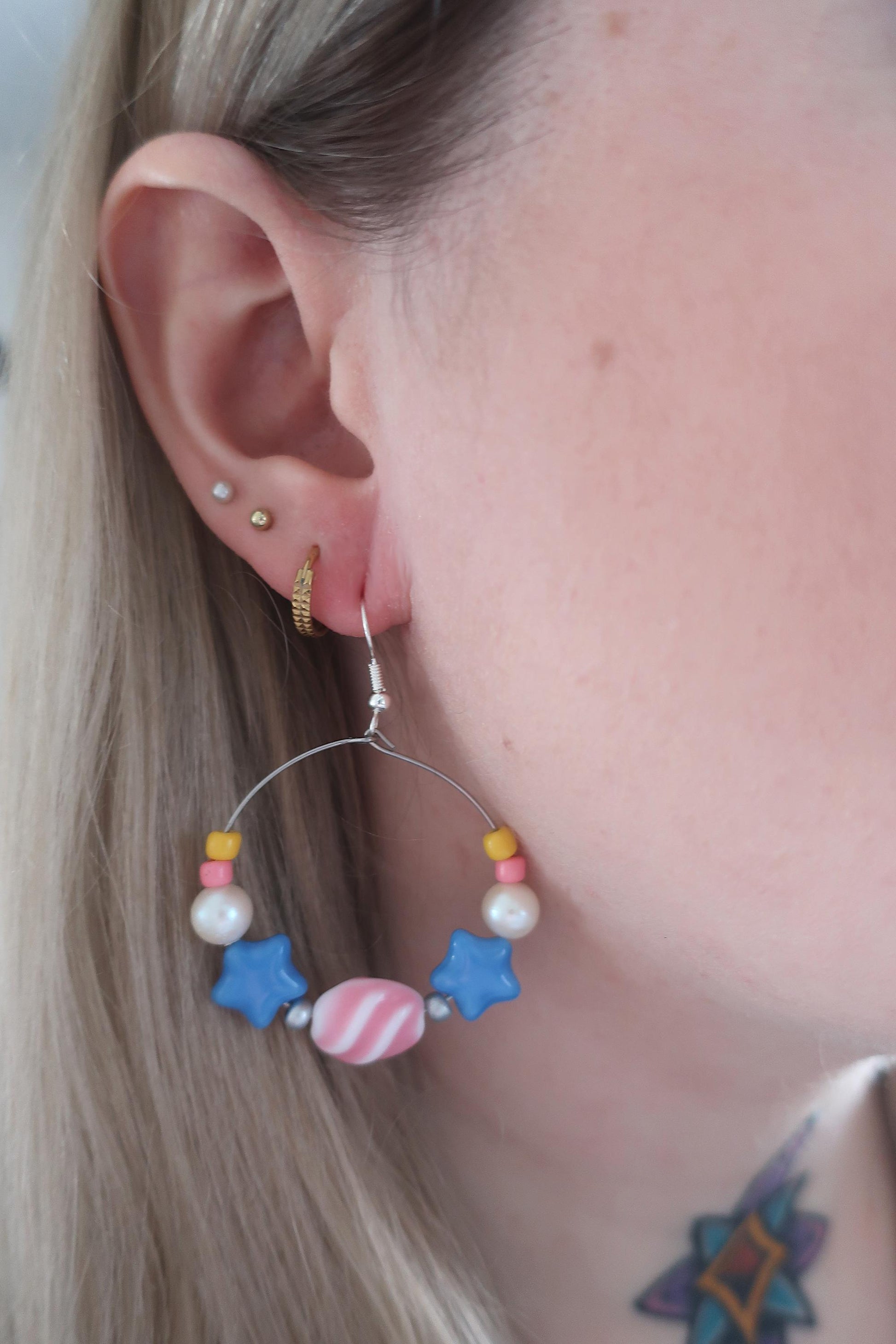 Materialien: Glasperlen, Plastikperlen, Edelstahlcreolen, Messinghaken