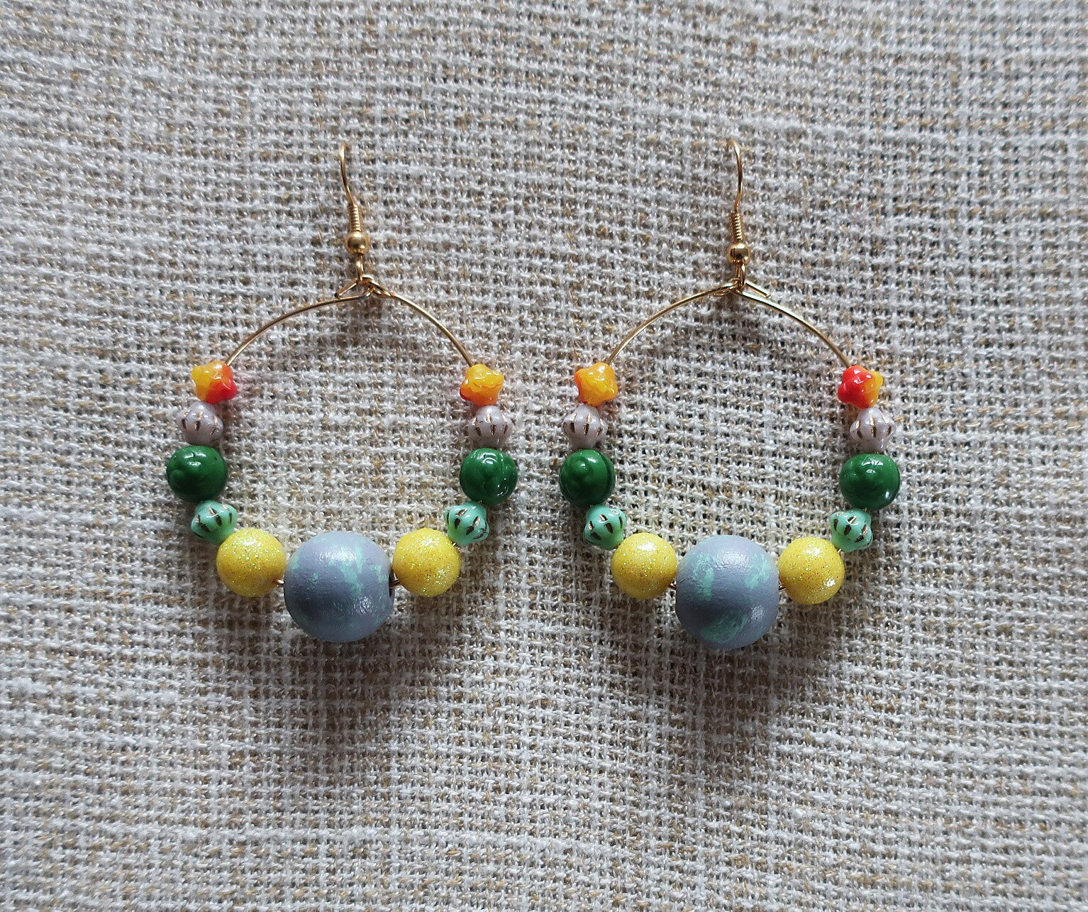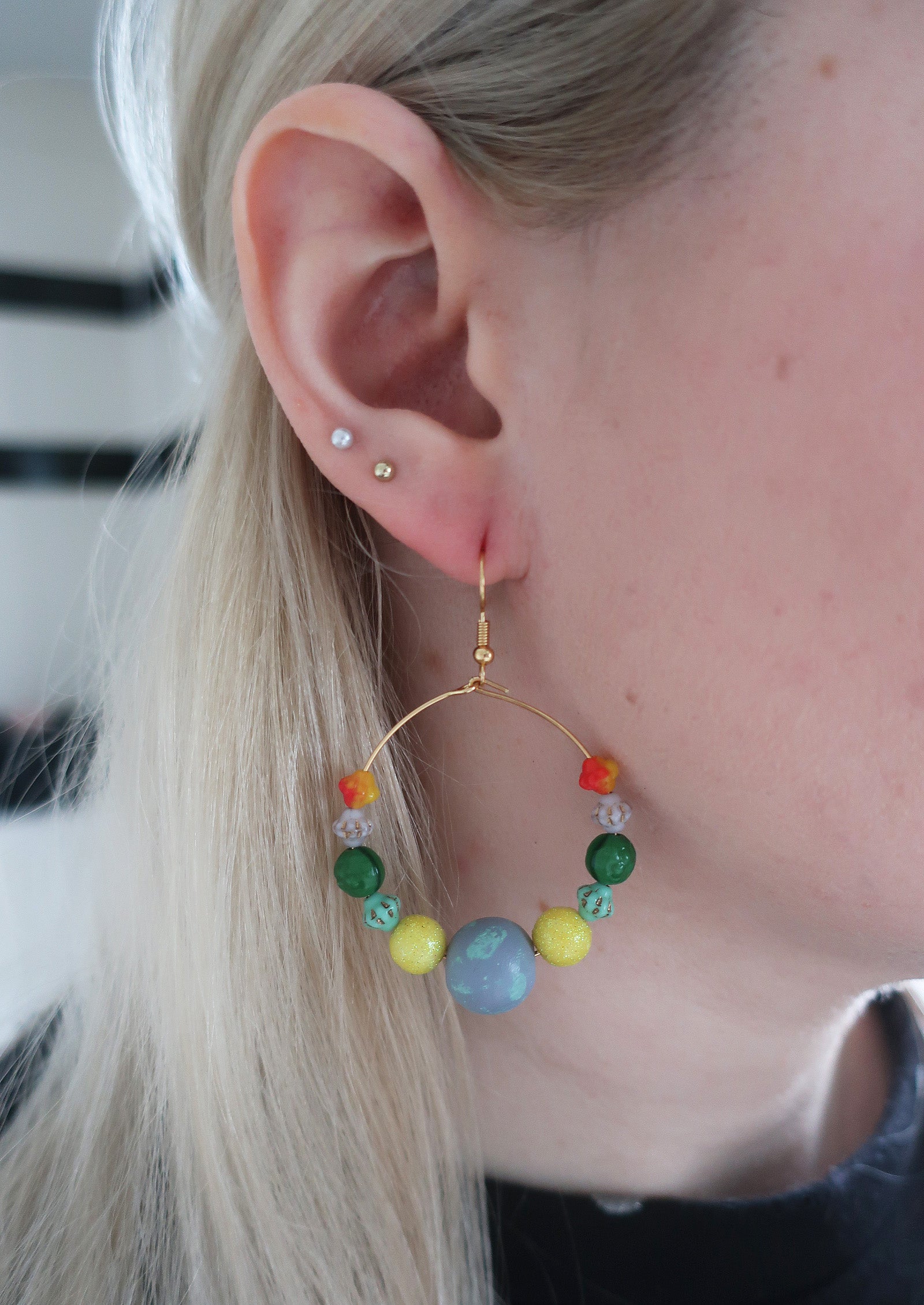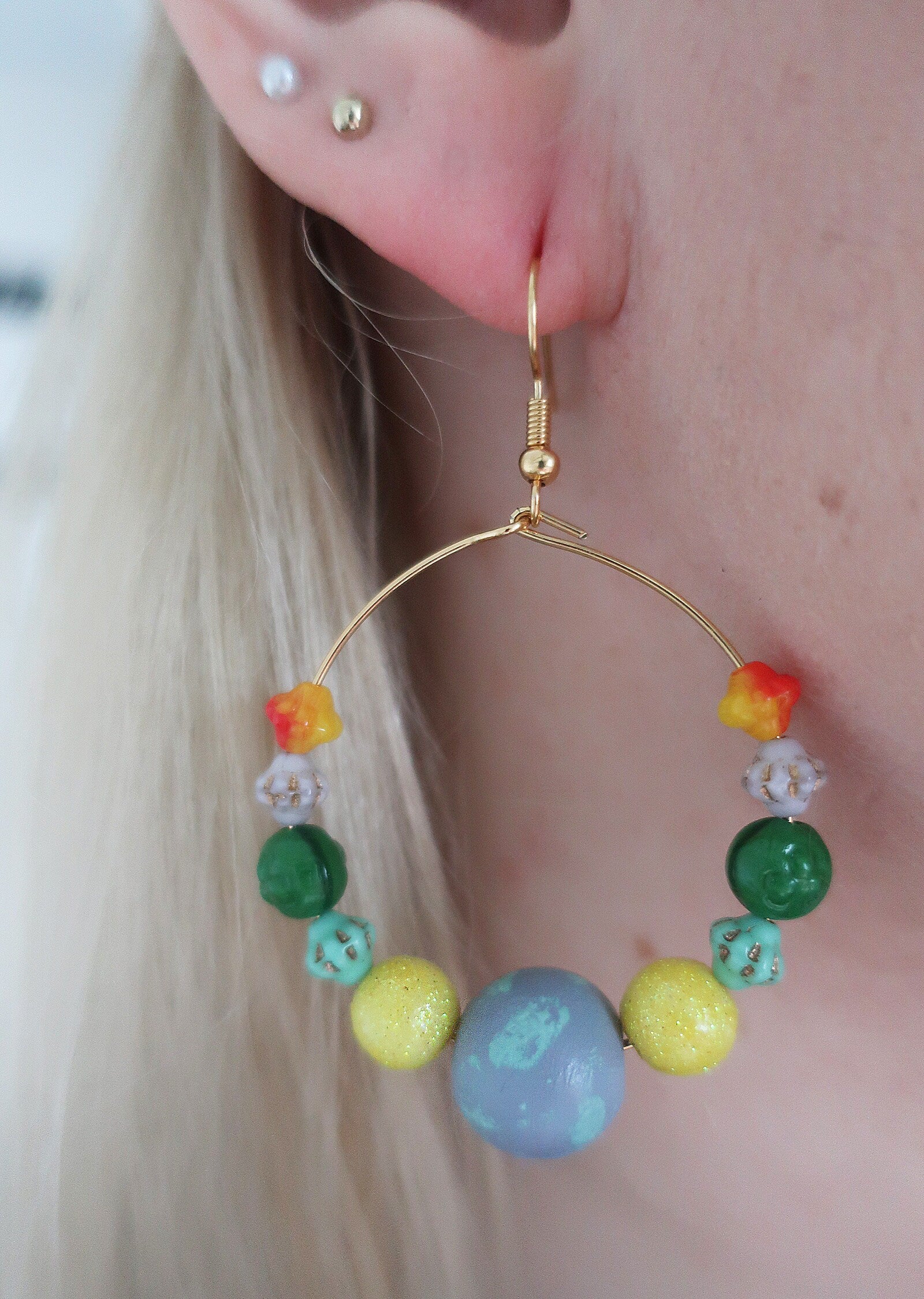 Für diese Ohrringe habe ich verschiedene Perlen auf goldfarbene Edelstahlcreolen aufgefädelt.