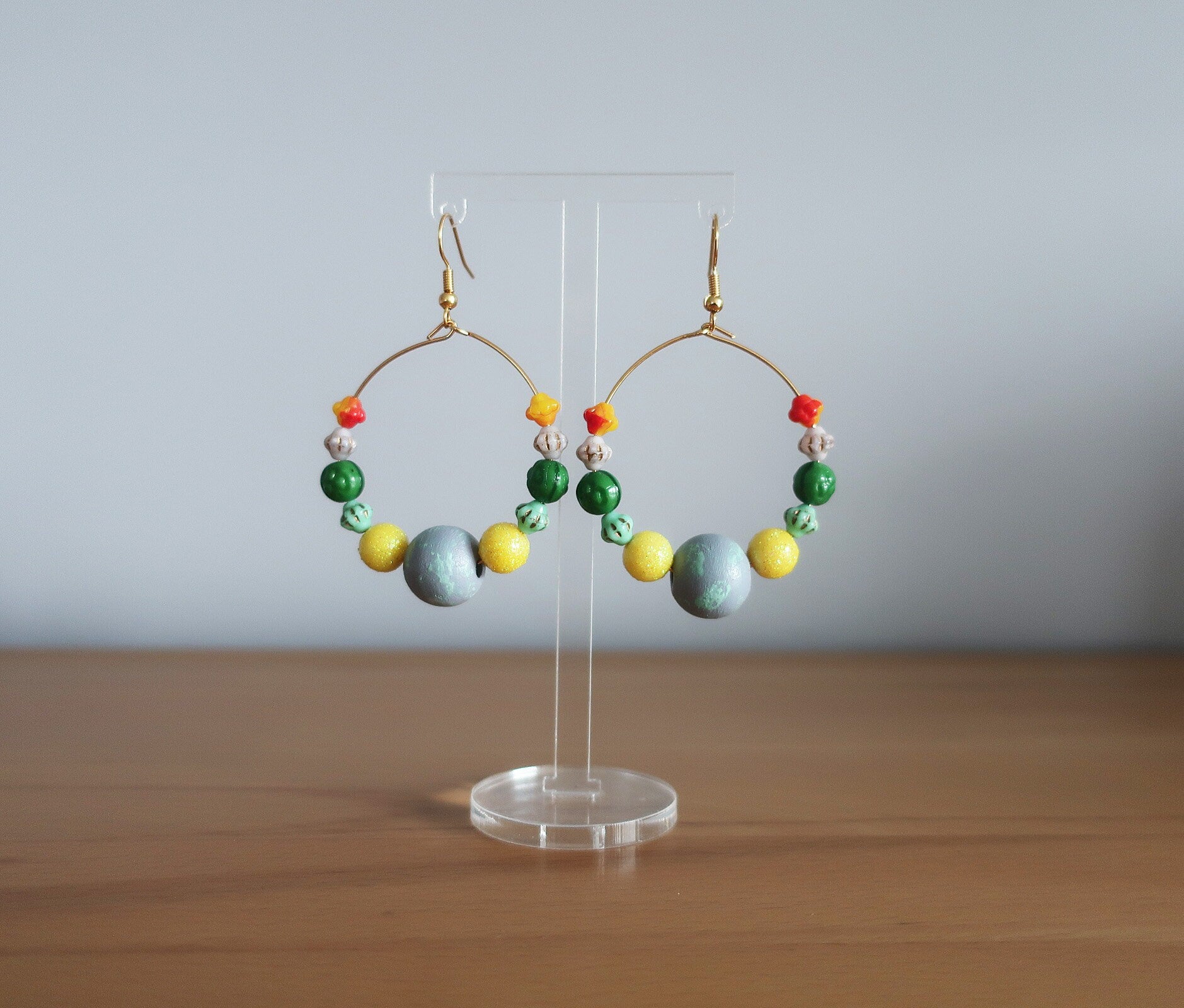 Materialien: Holzperlen, Glasperlen, Plastikperlen, Edelstahlcreolen, Messinghaken