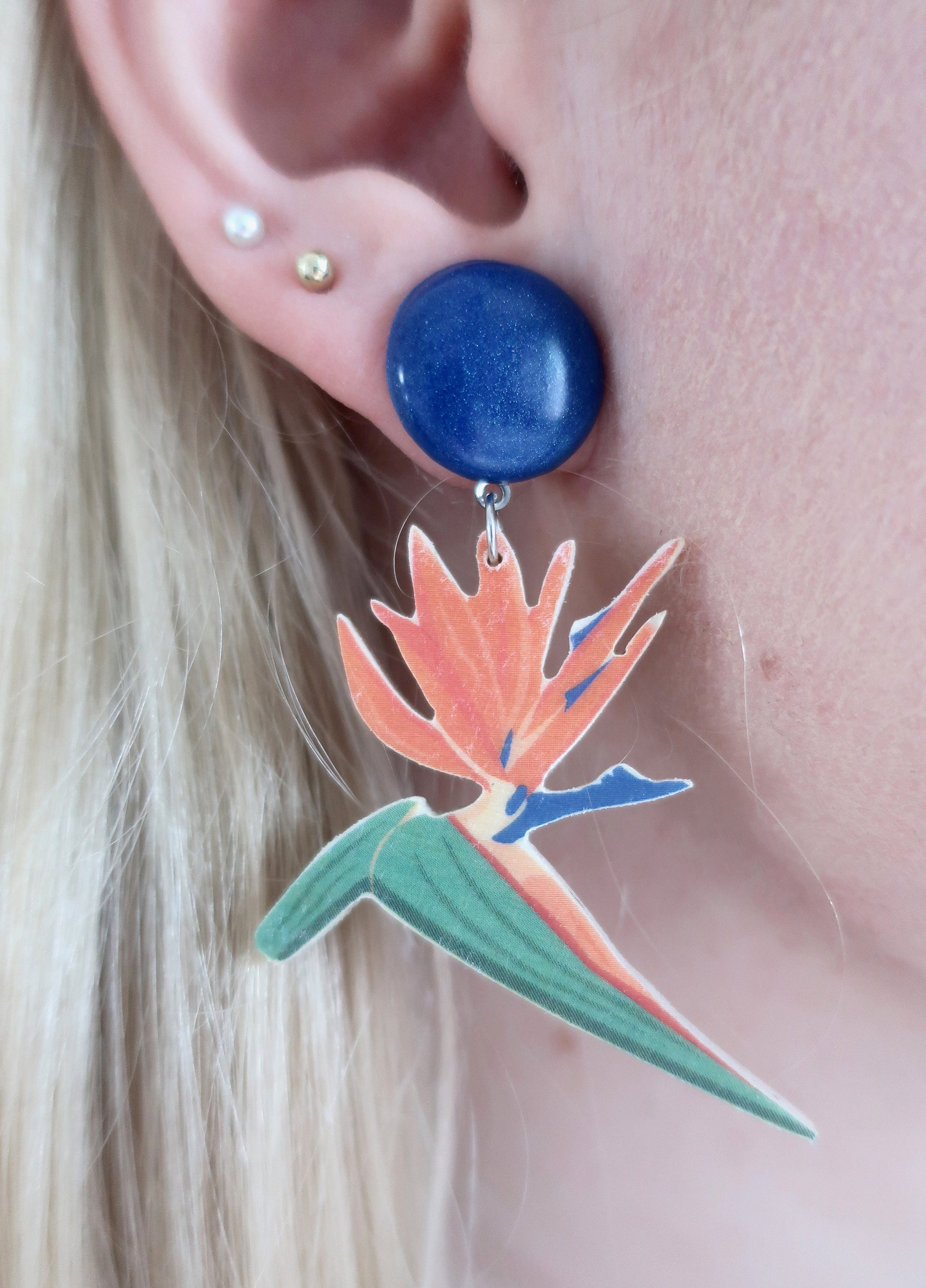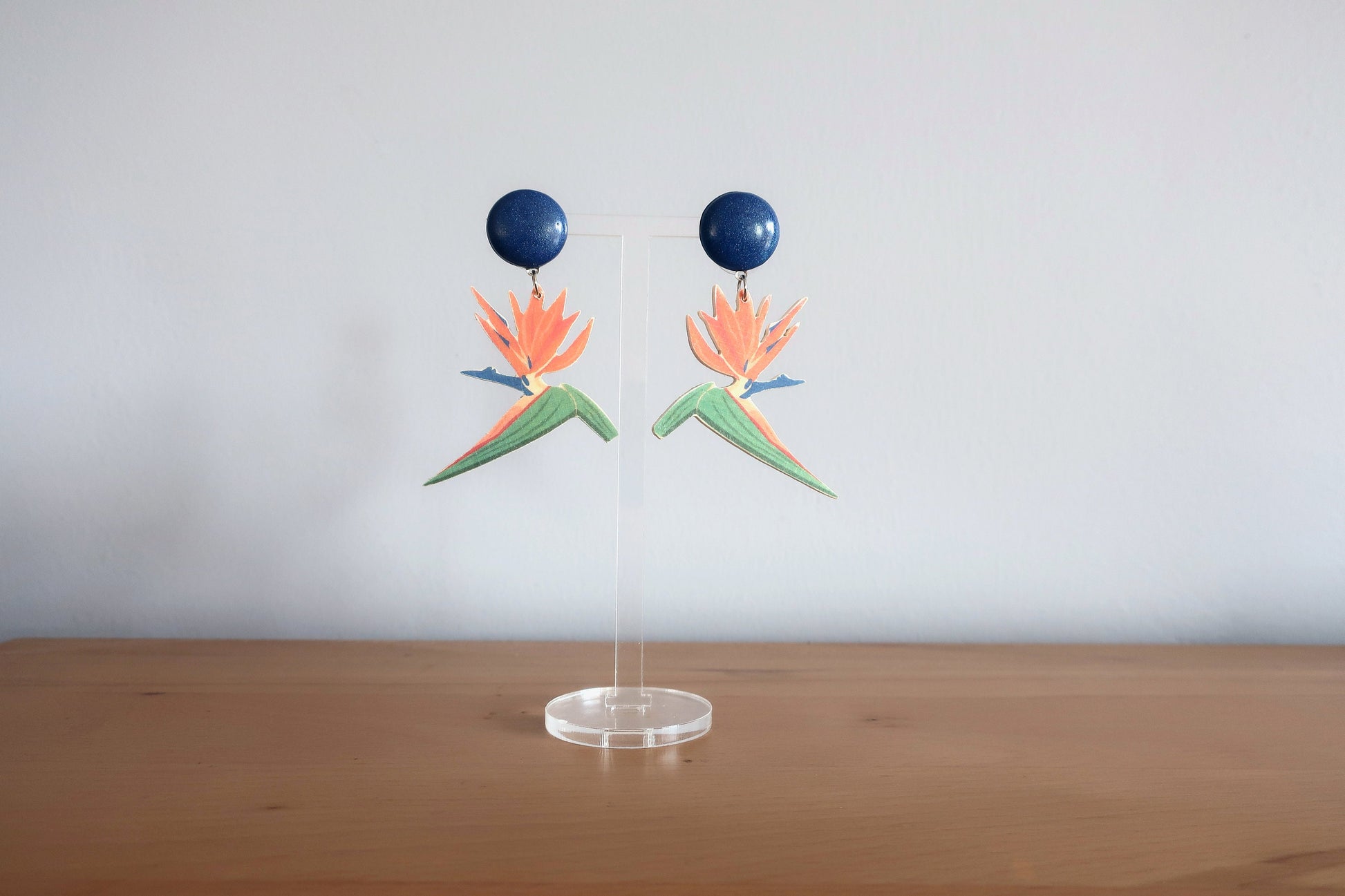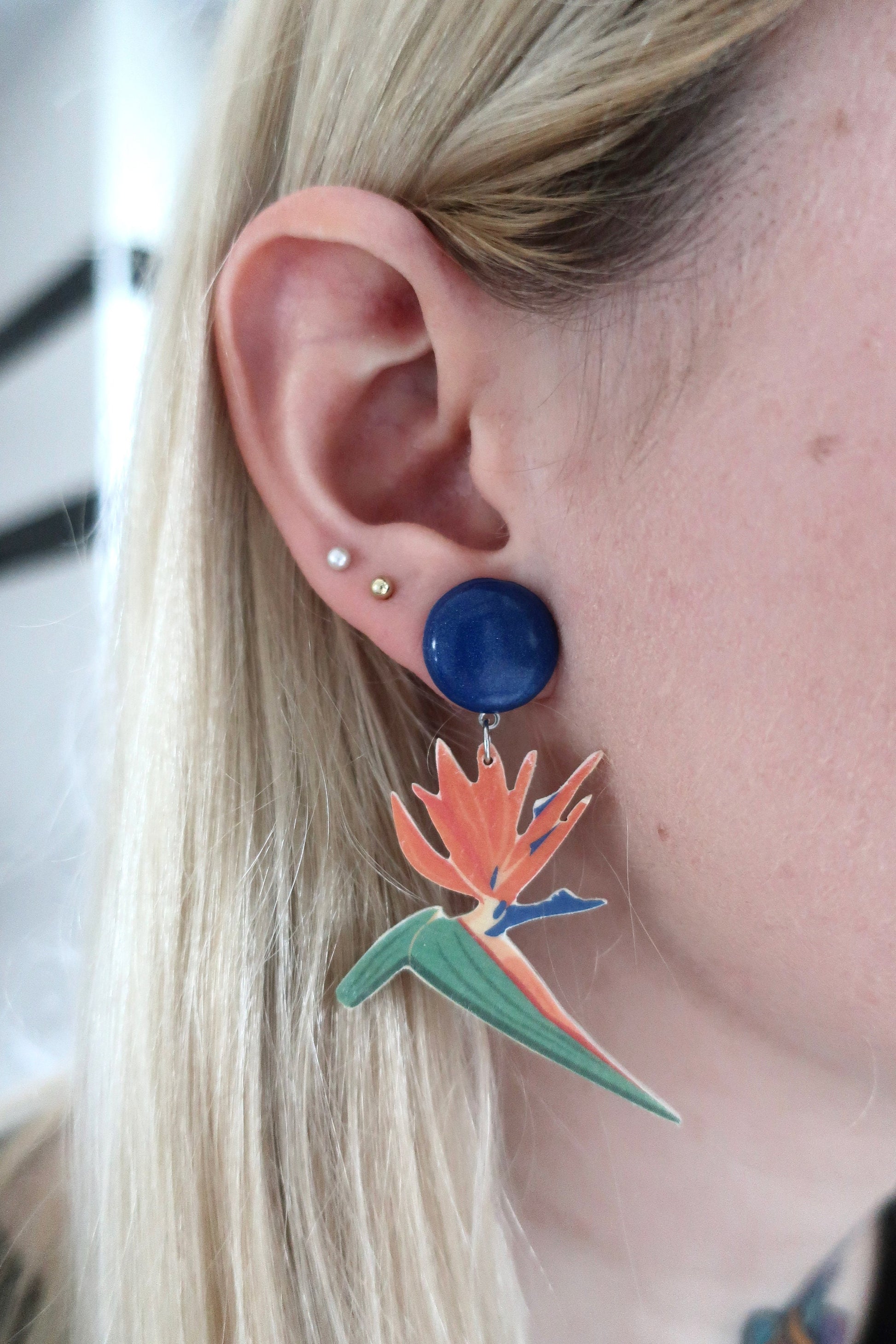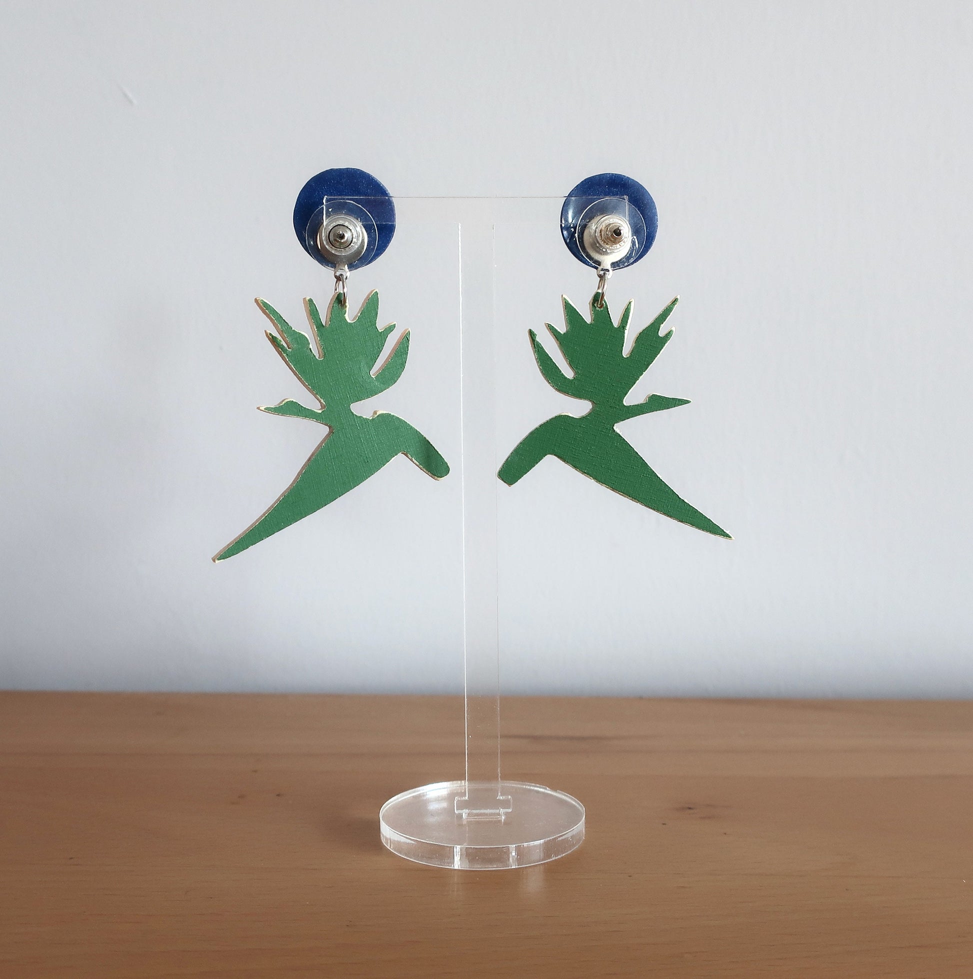 Für diese Ohrringe habe ich eine Zeichnung am Computer erstellt, die ich anschließend manuell auf Birkenholz übertragen und dann mit einer Dekupiersäge ausgesägt habe. Um die Haltbarkeit zu verbessern wurde eine Schicht matter Lack aufgetragen.