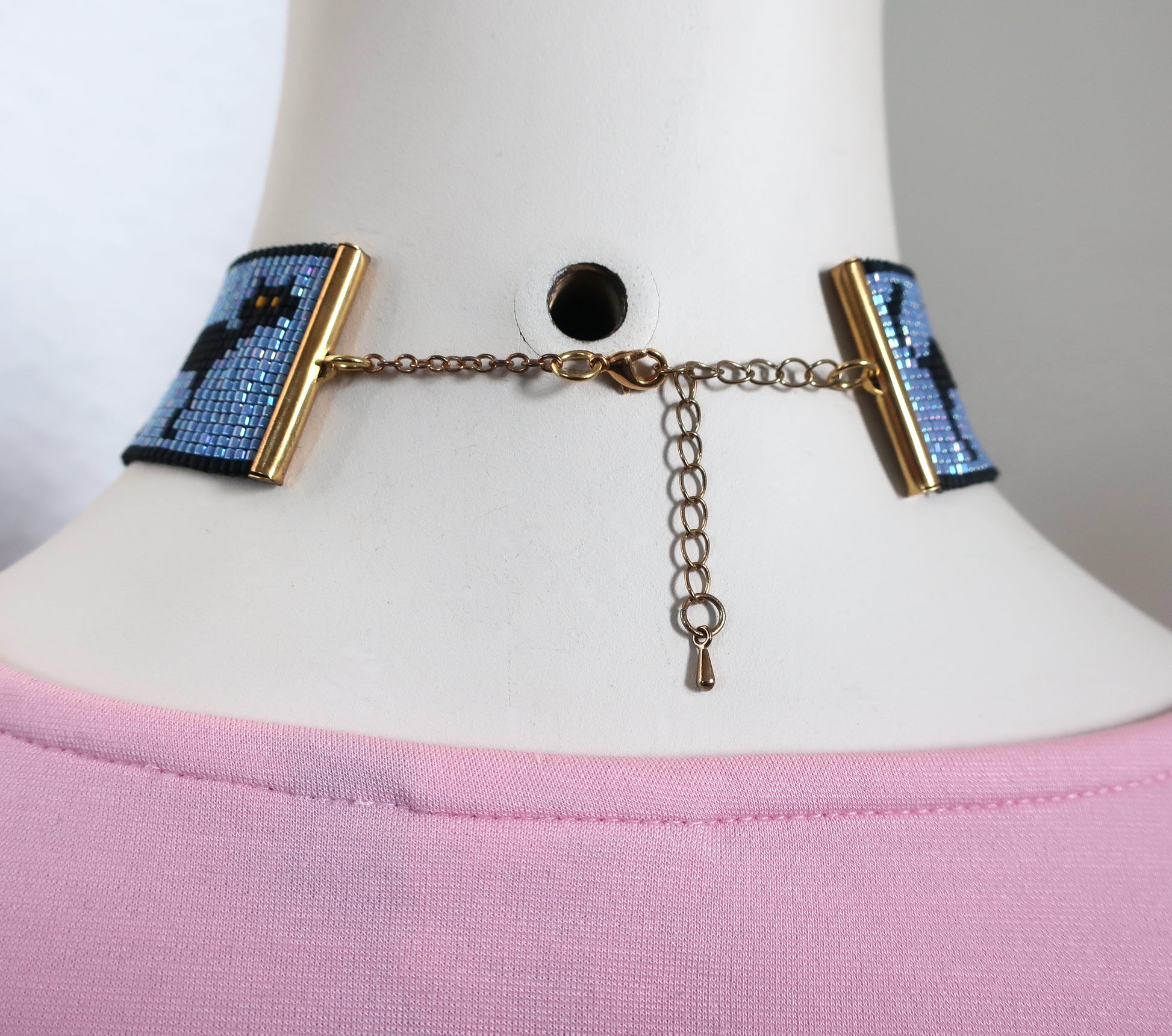 Der mit Perlen besetzte Bereich ist inklusive Röhrenenden ungefähr 29 cm lang. Die komplette Länge des Chokers inclusive Kettchen mit Karabinerhaken und Verschlussring beträgt ungefähr 33,5 cm. Sie kann mit der Verlängerungskette auf ungefähr 39.5 cm erweitert werden.