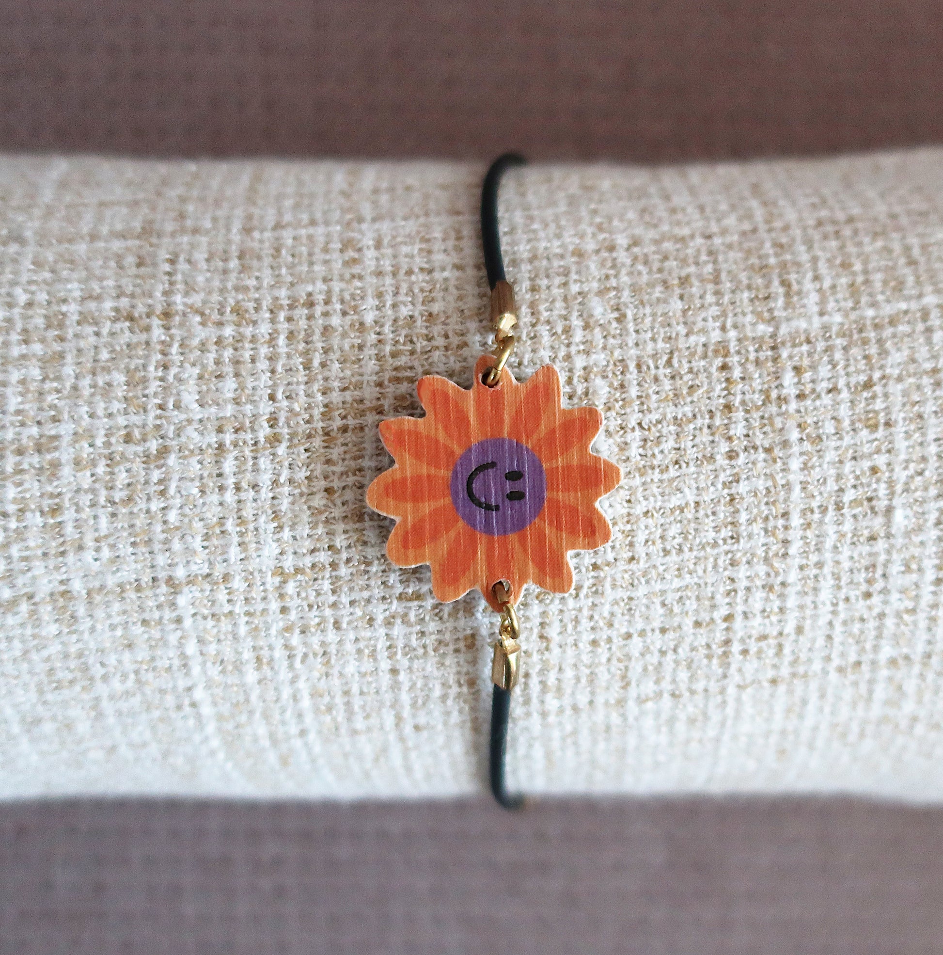 Schwarzes Kautschukarmband mit Smileyblumen-Charm