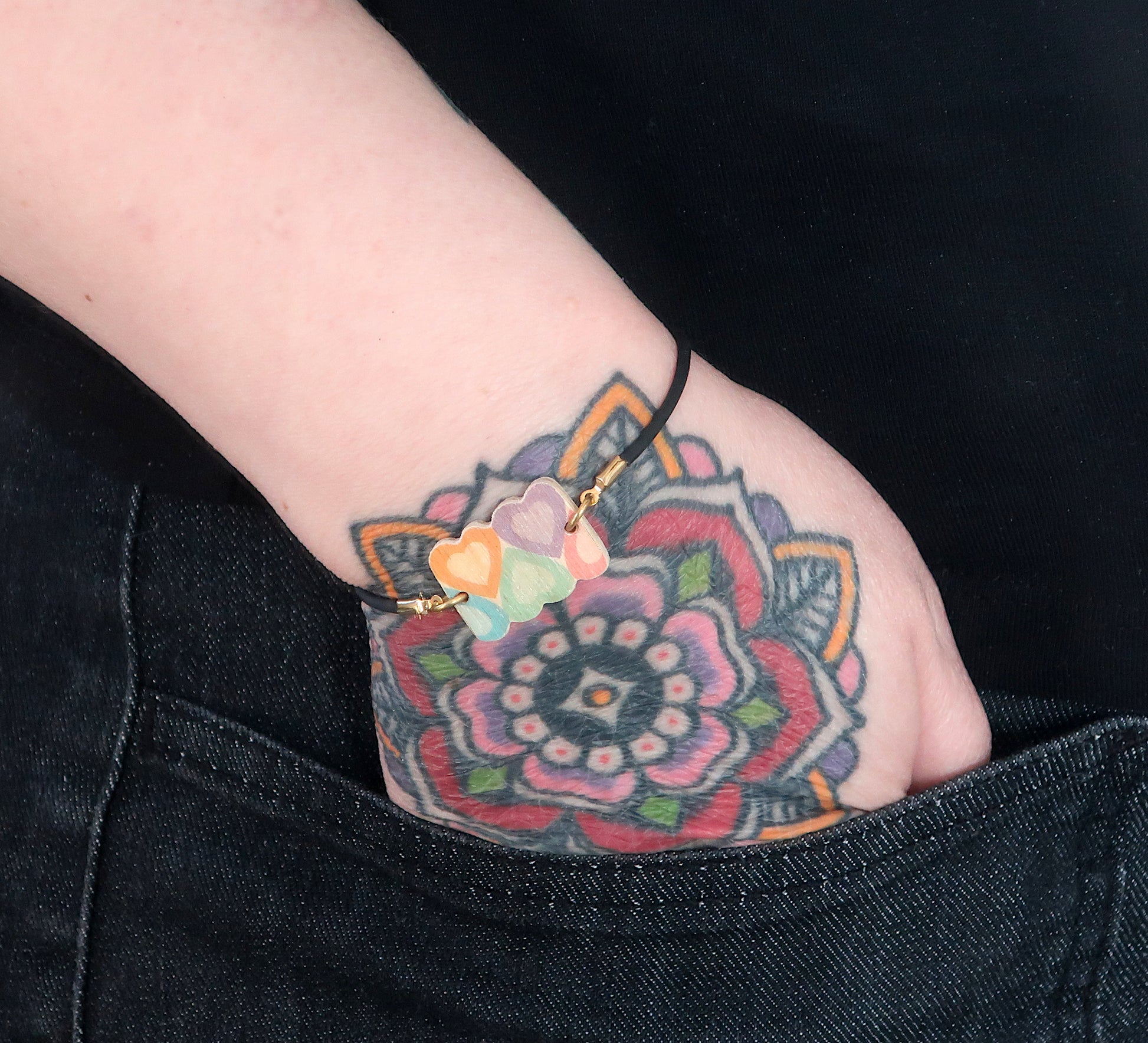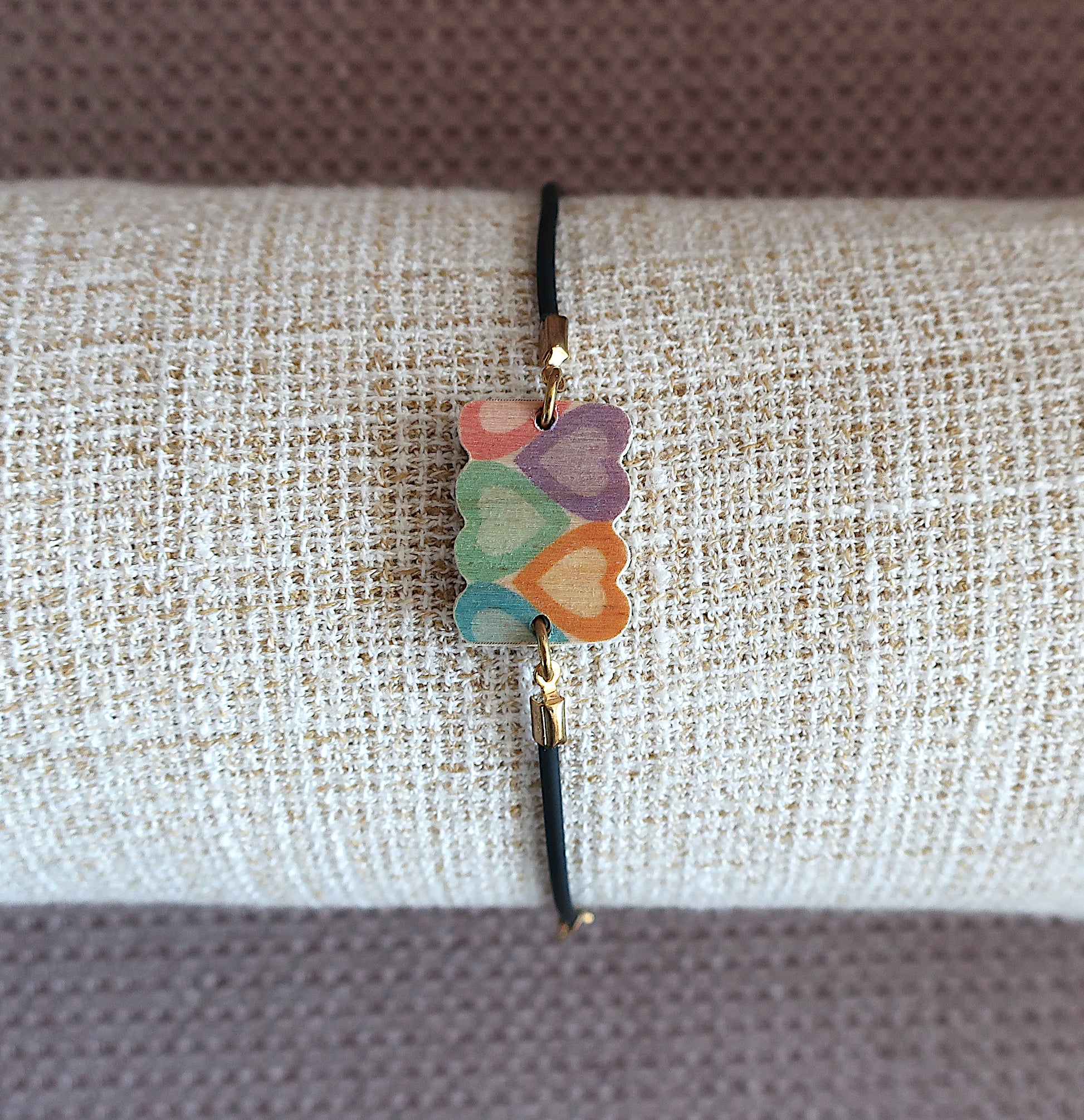 Für dieses Armband habe ich einen handgefertigten Holzcharm an einem schwarzen Kautschukband befestigt. Das Armband hat goldfarbene Klemmen, Binderinge und einen Karabinerverschluss. Das Kautschukband ist ungefähr 2 mm breit. Das Armband ist einschließlich des Karabiners und des Verschlussrings ungefähr 16,5 cm lang. Es hat eine 5,5 cm lange Verlängerungskette, mit der das Armband auf ungefähr 22 cm verlängert werden kann, um es in der Größe anpassbar zu machen. Wenn ihr die Verlängerungskette nicht braucht oder mögt, könnt ihr sie einfach mit einer Bastelzange entfernen.