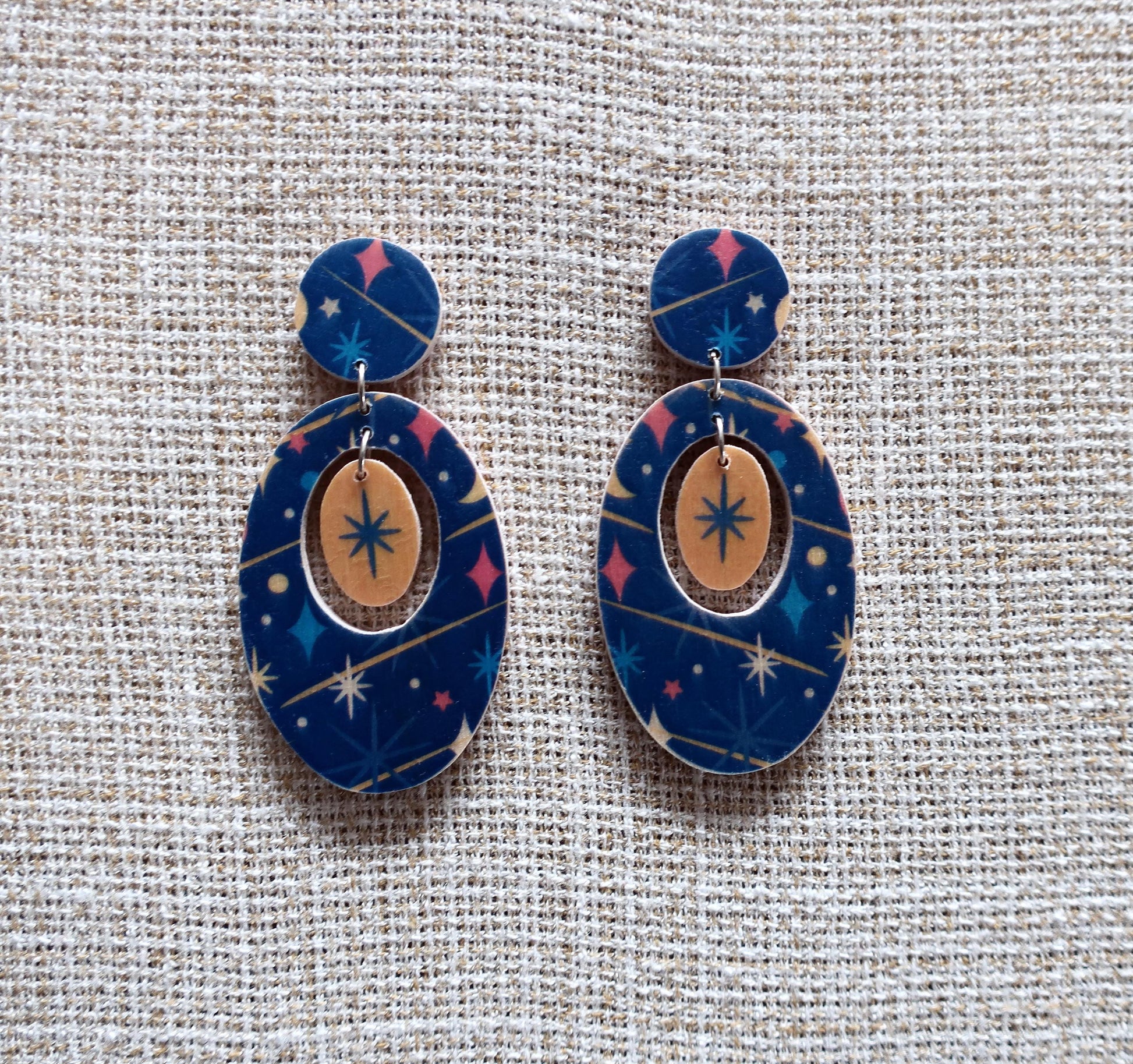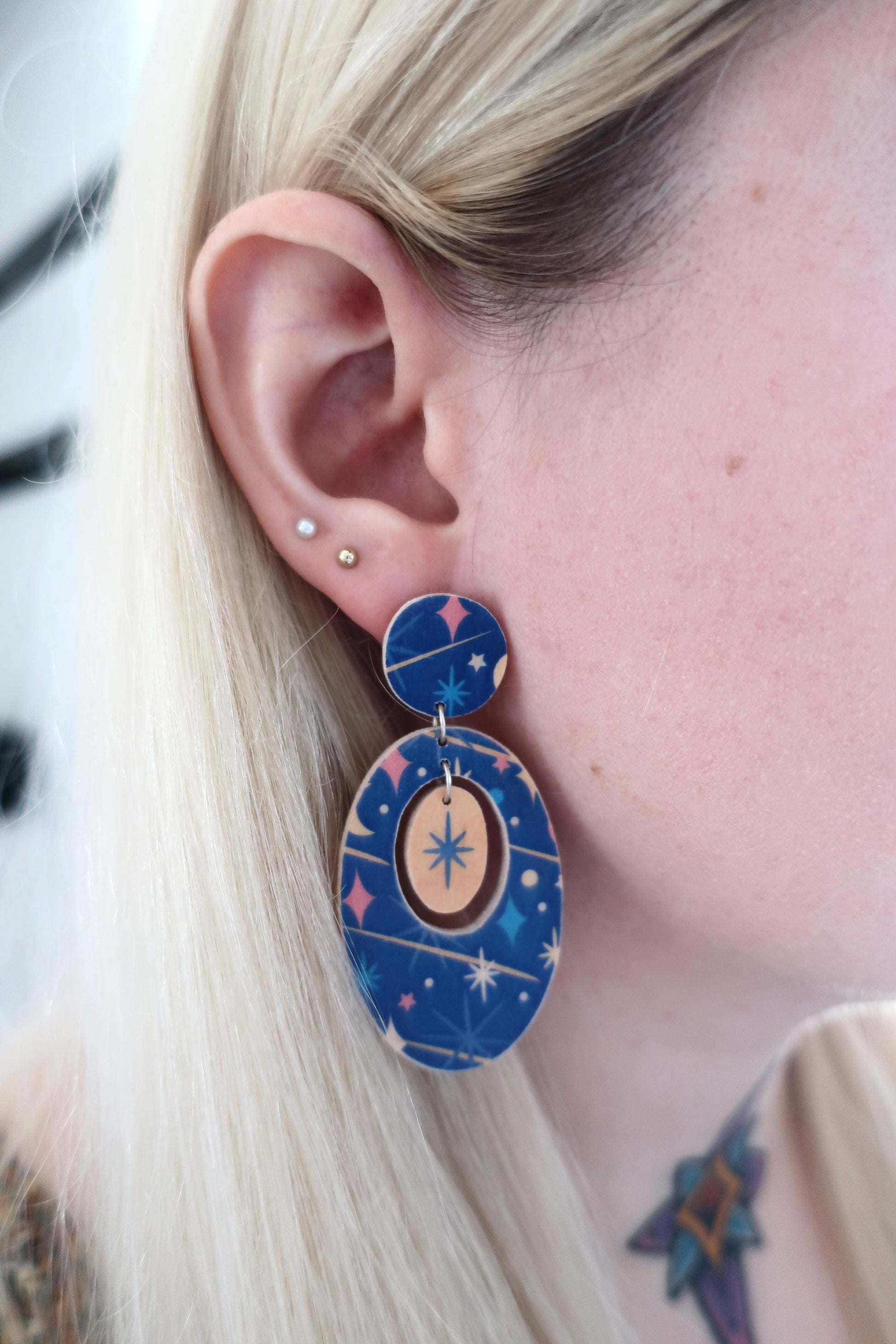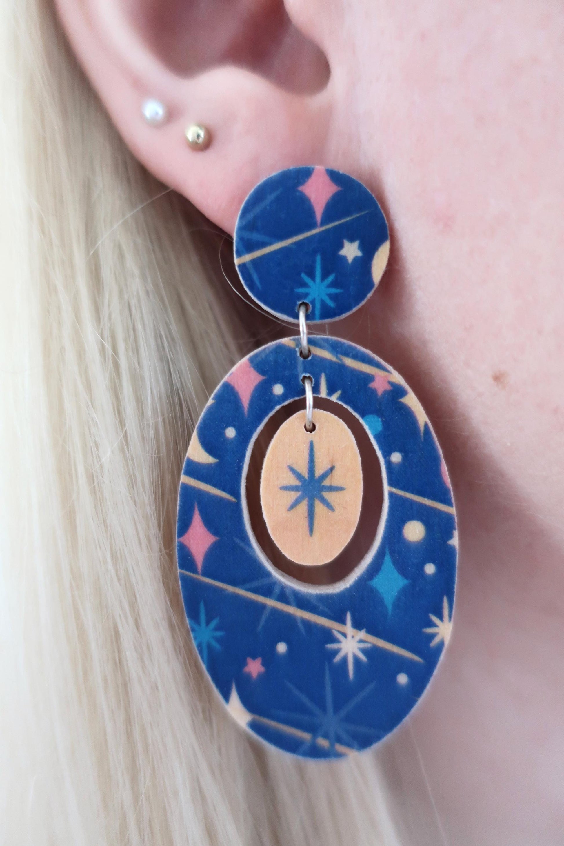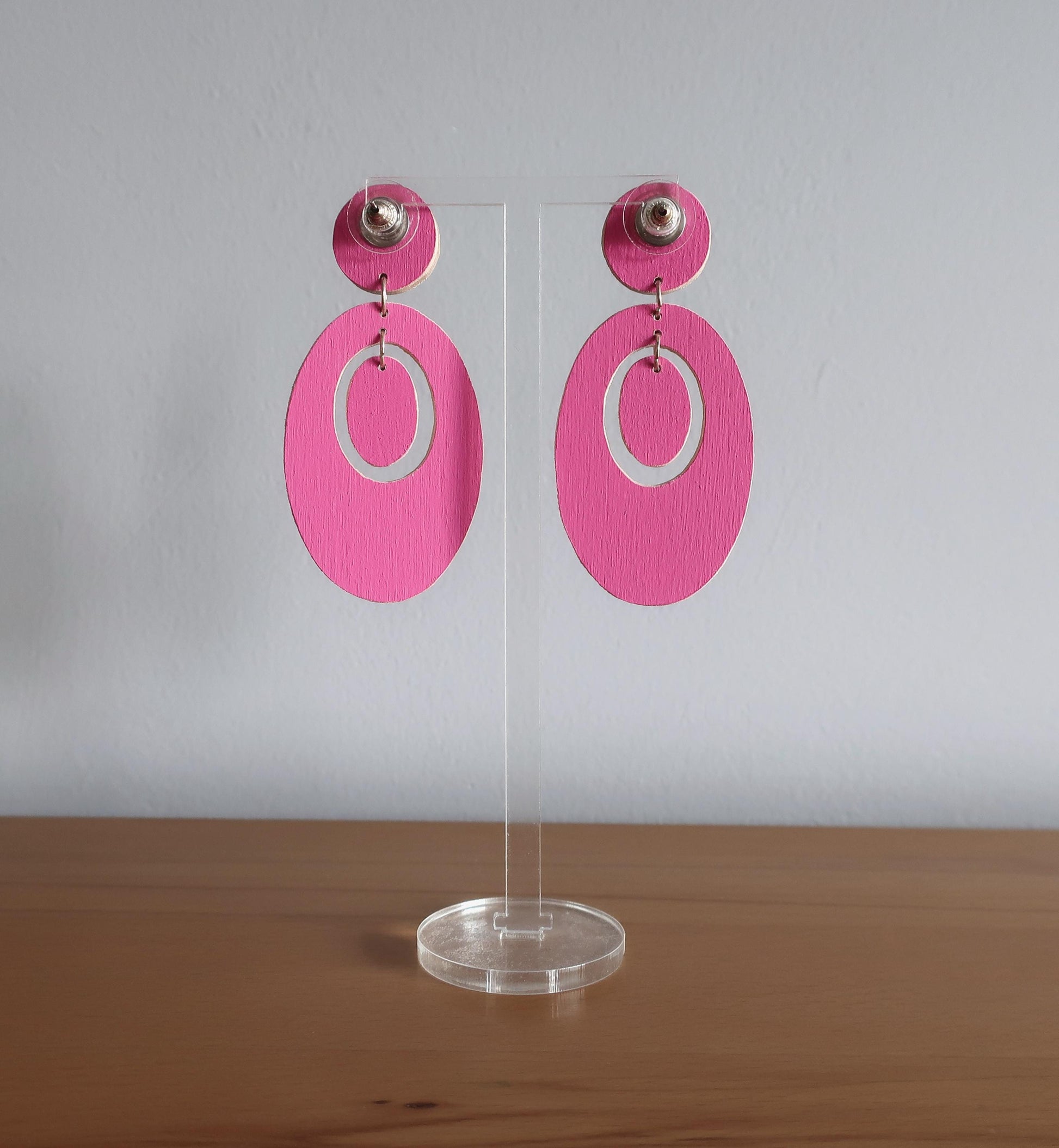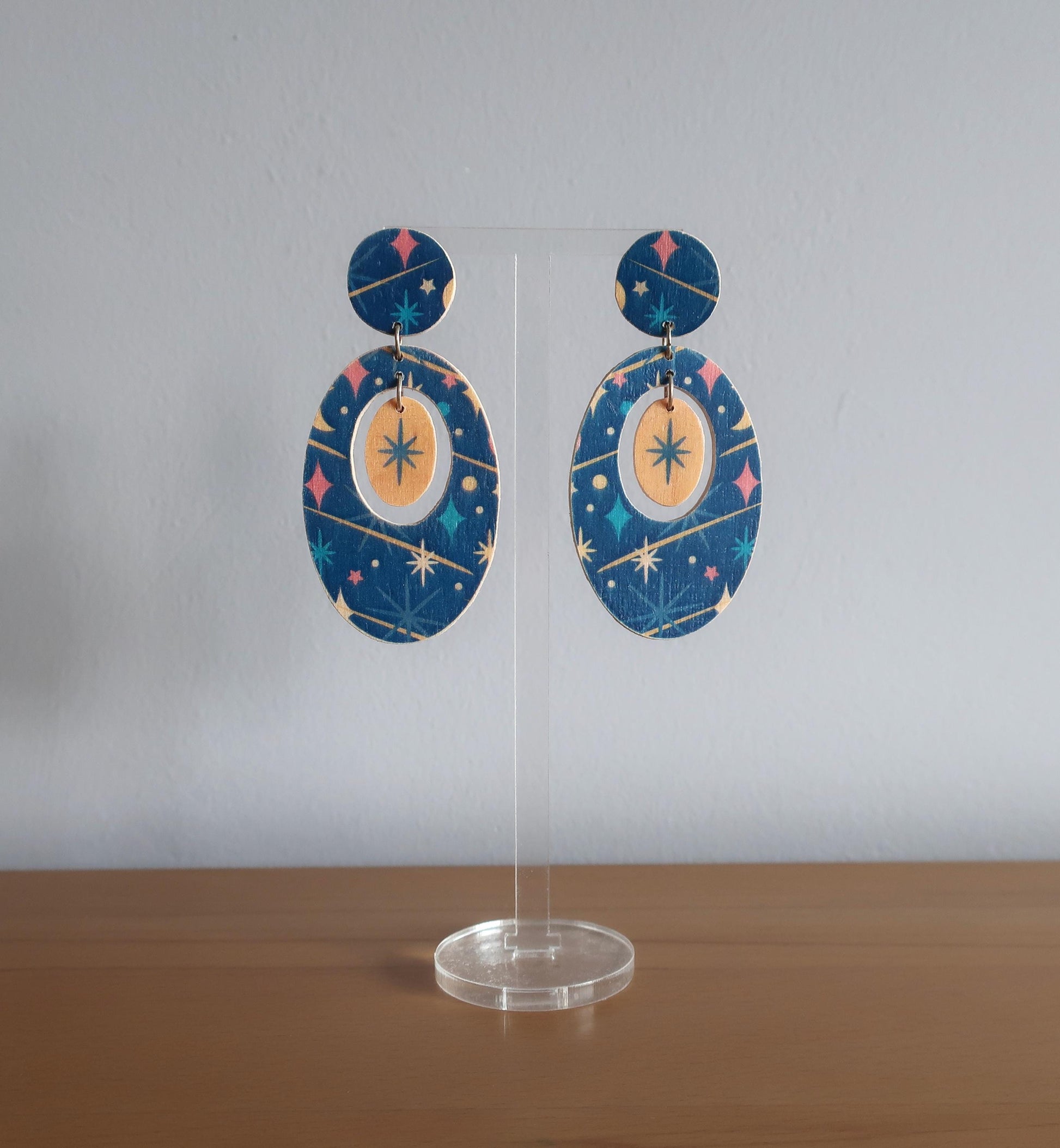 Für diese Ohrringe habe ich eine Zeichnung am Computer erstellt, die ich anschließend manuell auf Birkenholz übertragen und dann mit einer Dekupiersäge ausgesägt habe. Um die Haltbarkeit zu verbessern wurde eine Schicht matter Lack aufgetragen.