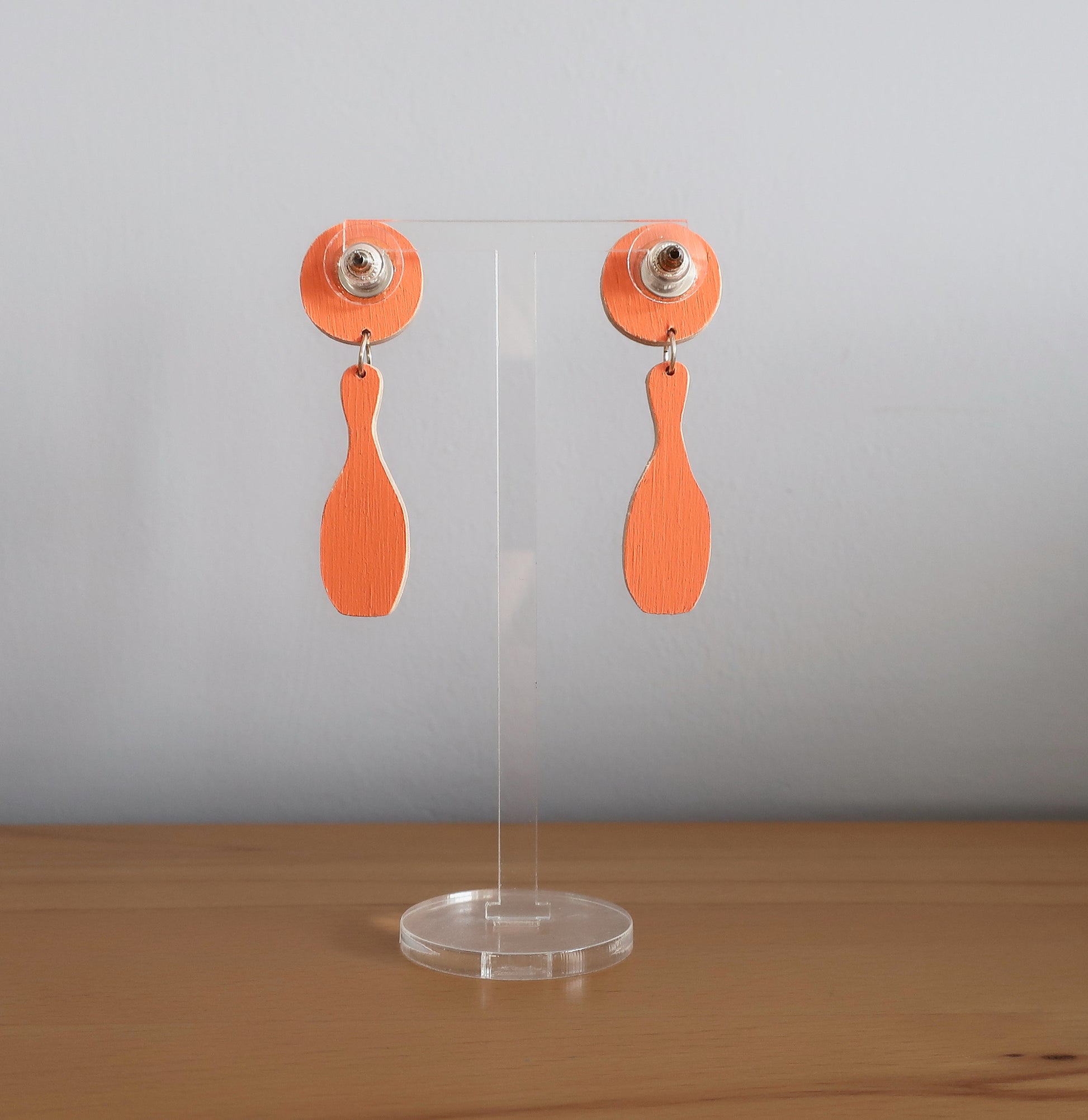 Für diese Ohrringe habe ich eine Zeichnung am Computer erstellt, die ich anschließend manuell auf Birkenholz übertragen und dann mit einer Dekupiersäge ausgesägt habe. Um die Haltbarkeit zu verbessern wurde eine Schicht matter Lack aufgetragen.