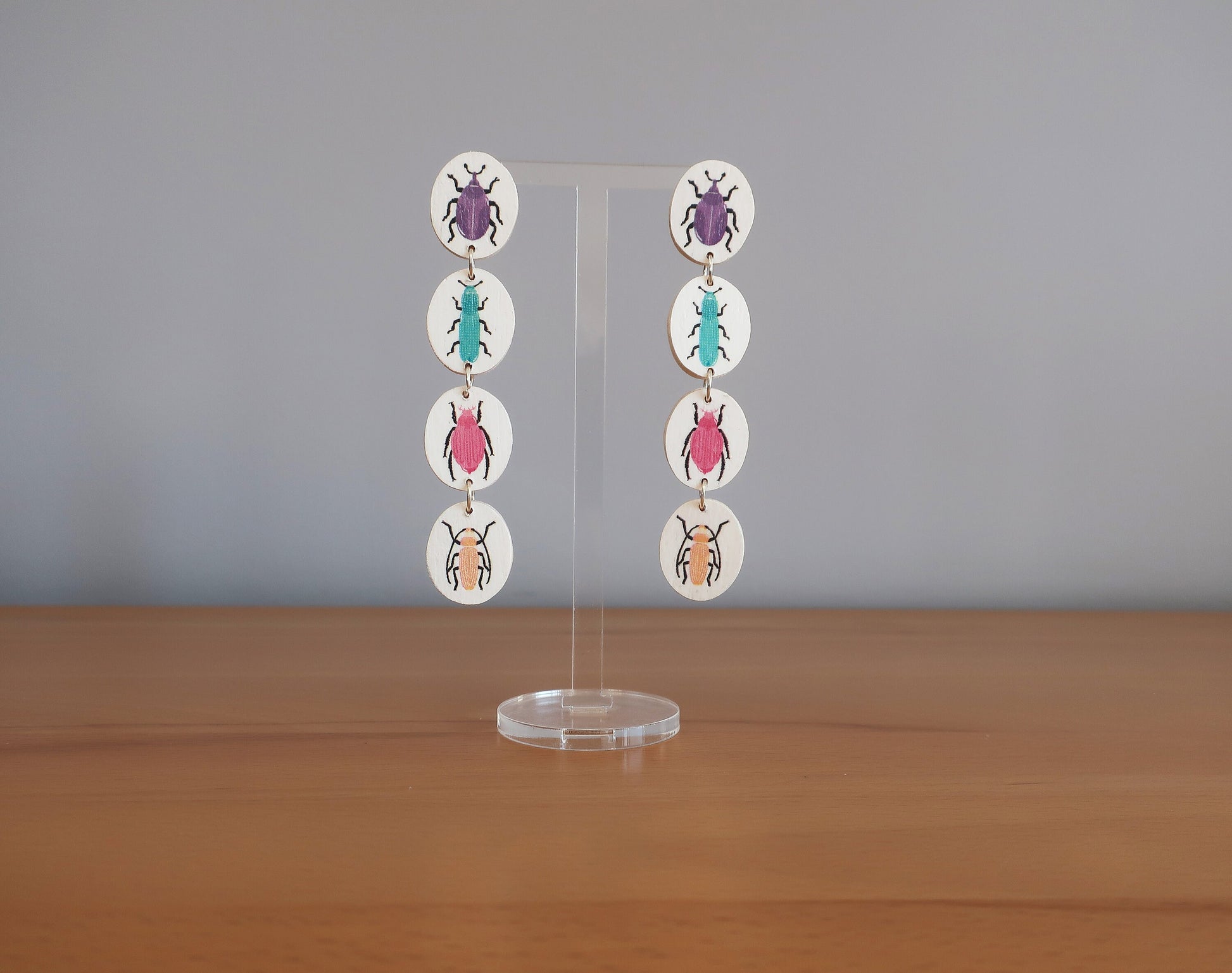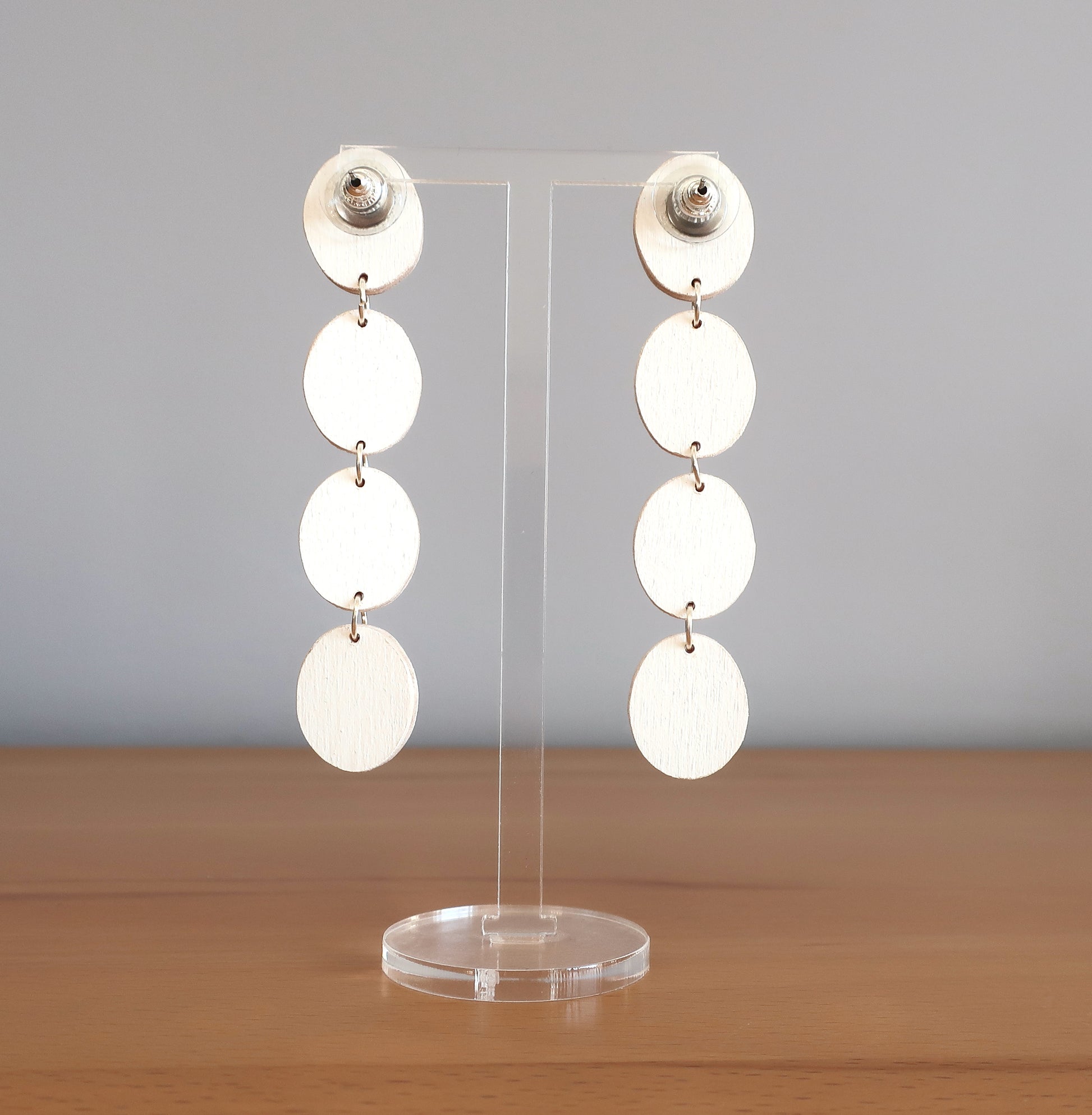 Für diese Ohrringe habe ich eine Zeichnung am Computer erstellt, die ich anschließend manuell auf Birkenholz übertragen und dann mit einer Dekupiersäge ausgesägt habe. Um die Haltbarkeit zu verbessern wurde eine Schicht matter Lack aufgetragen.