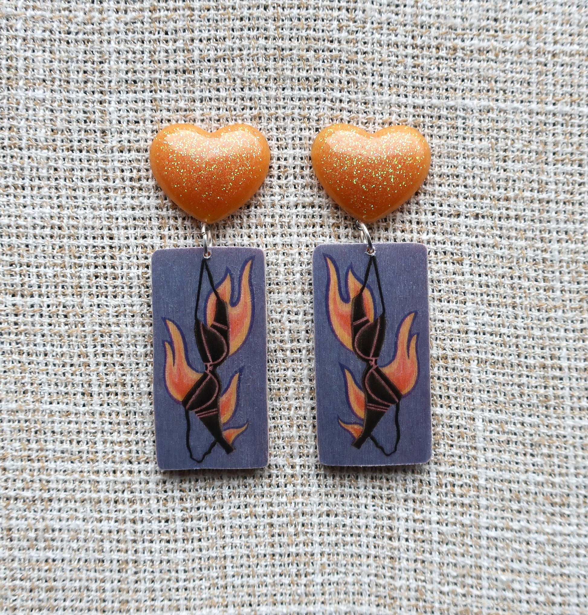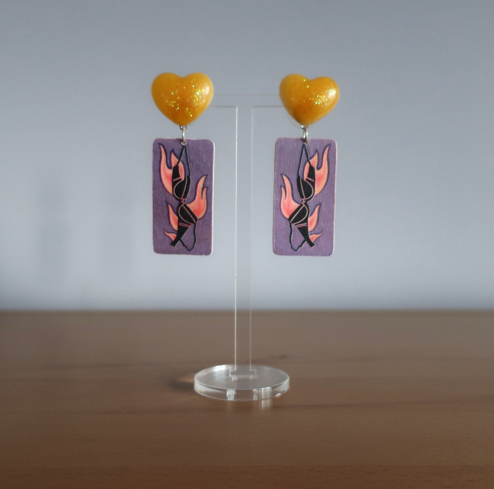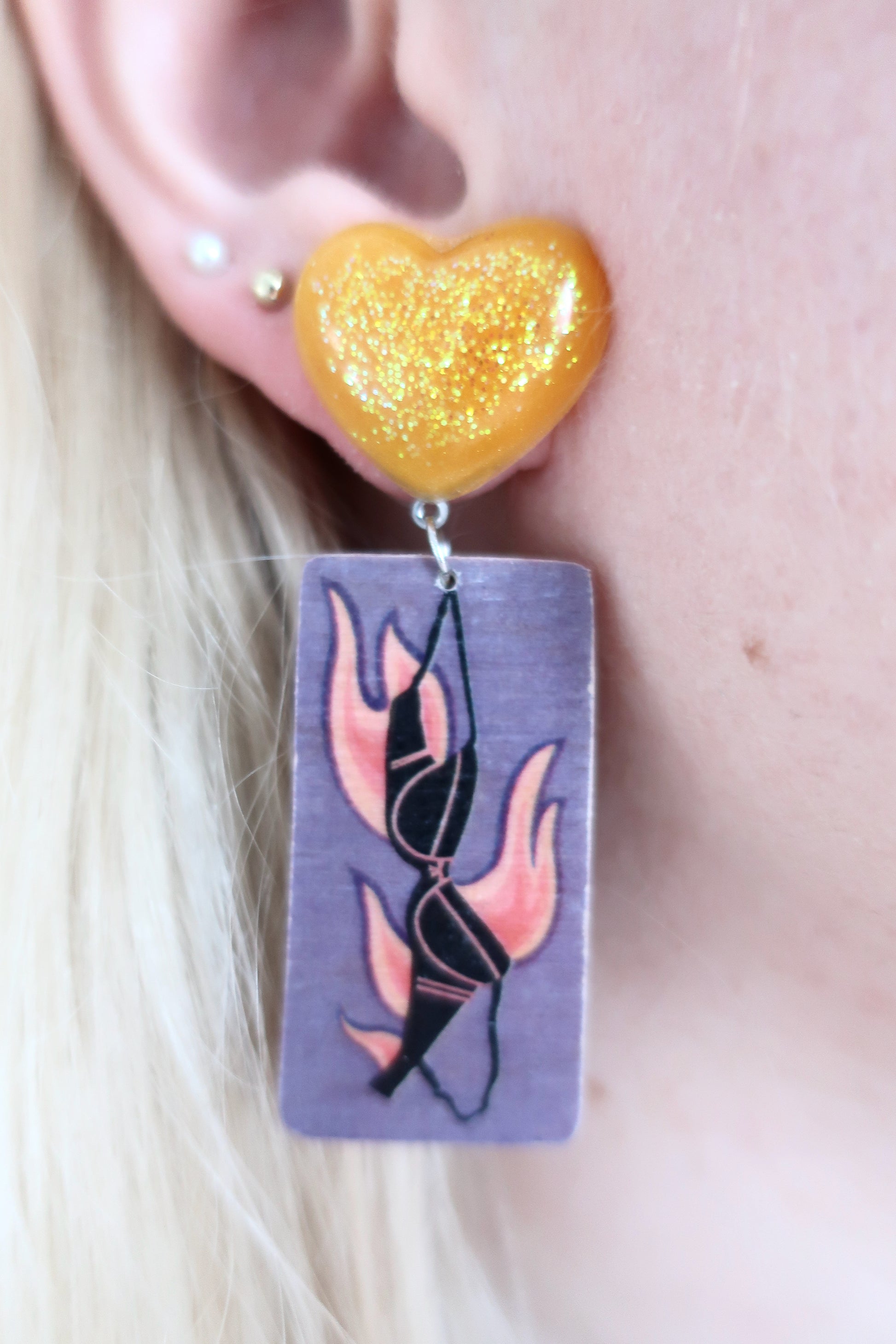 Für diese Ohrringe habe ich eine Zeichnung am Computer erstellt, die ich anschließend manuell auf Birkenholz übertragen und dann mit einer Dekupiersäge ausgesägt habe. Um die Haltbarkeit zu verbessern wurde eine Schicht matter Lack aufgetragen.