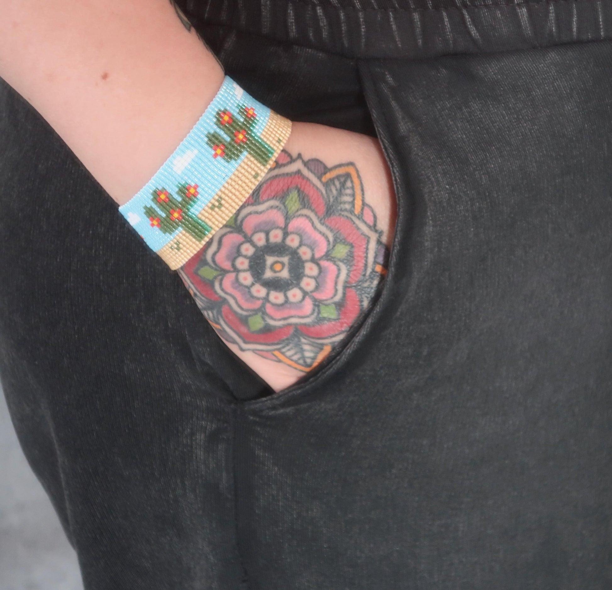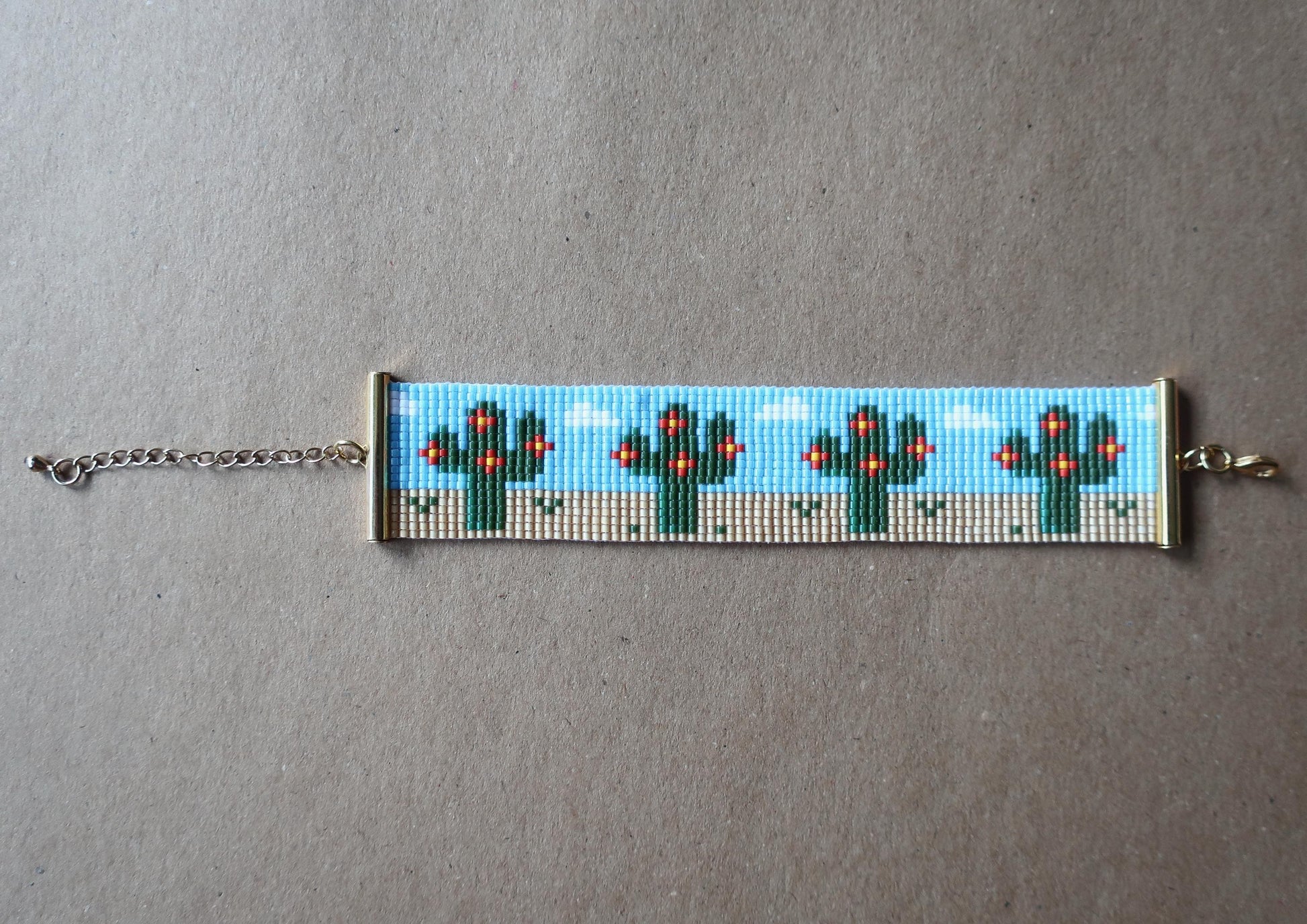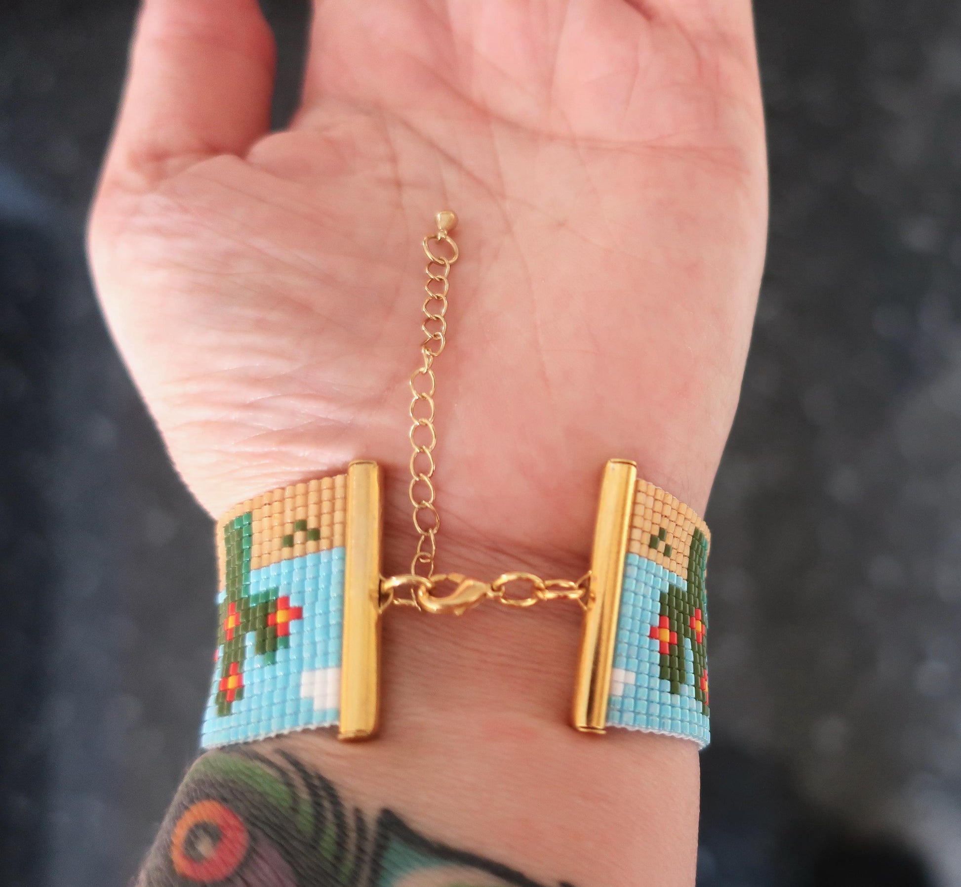 Dies ist ein handgewebtes Armband mit hochwertigen japanischen Miyuki-Perlen. Es hat goldfarbene Röhrenenden, einen Karabinerhaken als Verschluss und eine 5,5 cm lange Verlängerungskette. Es ist 2,8 cm breit.