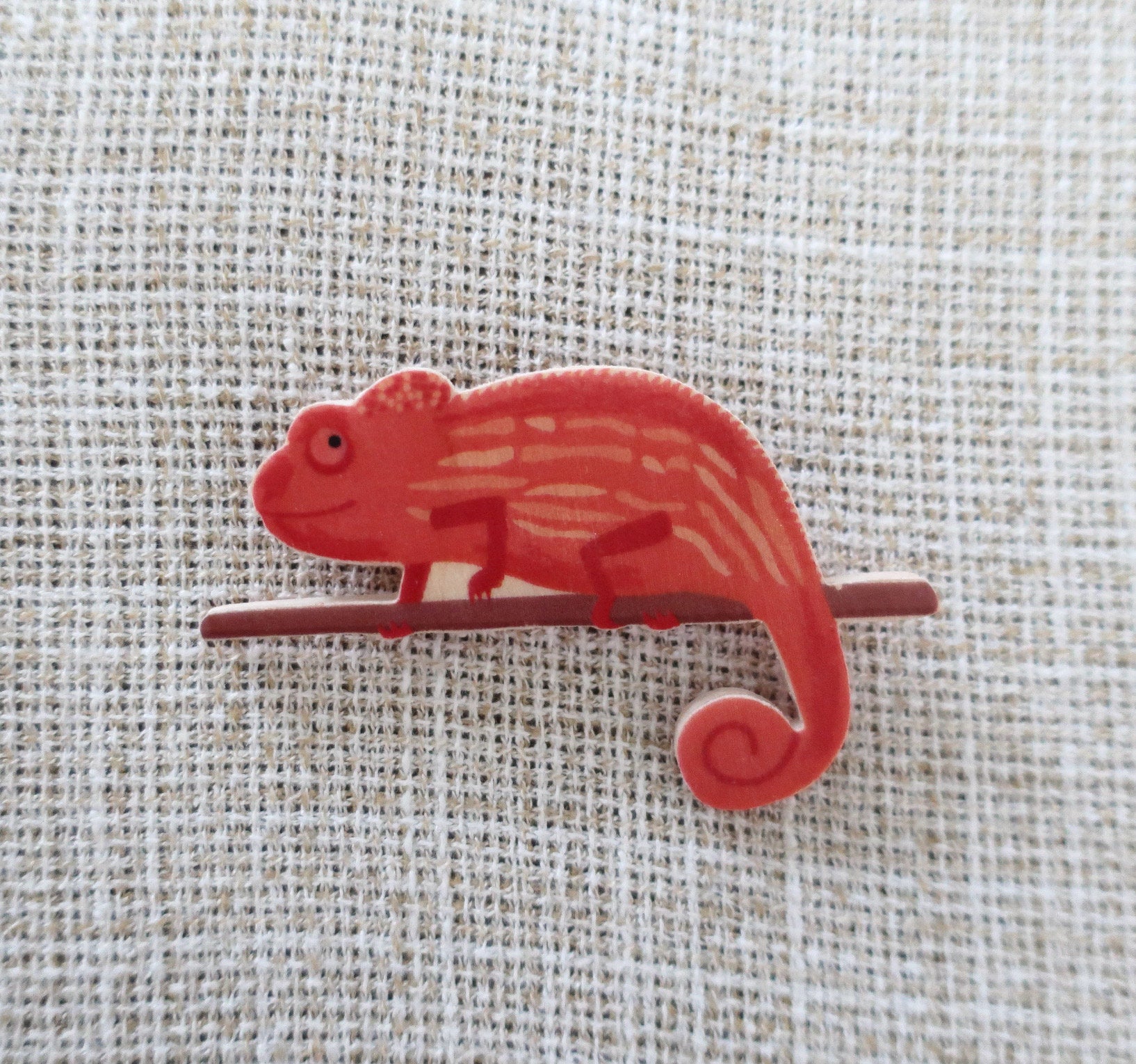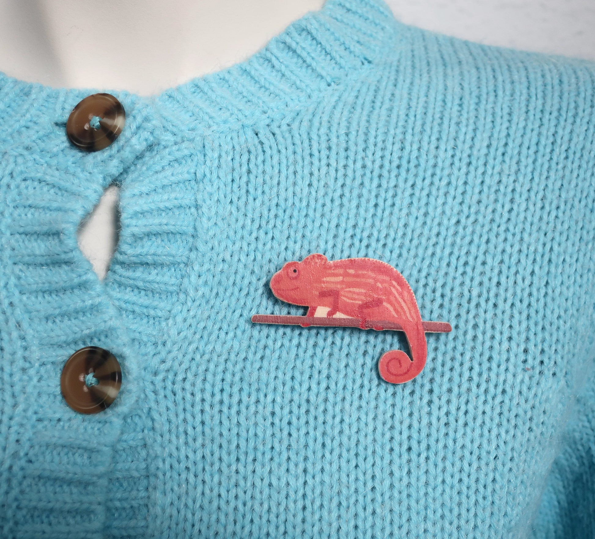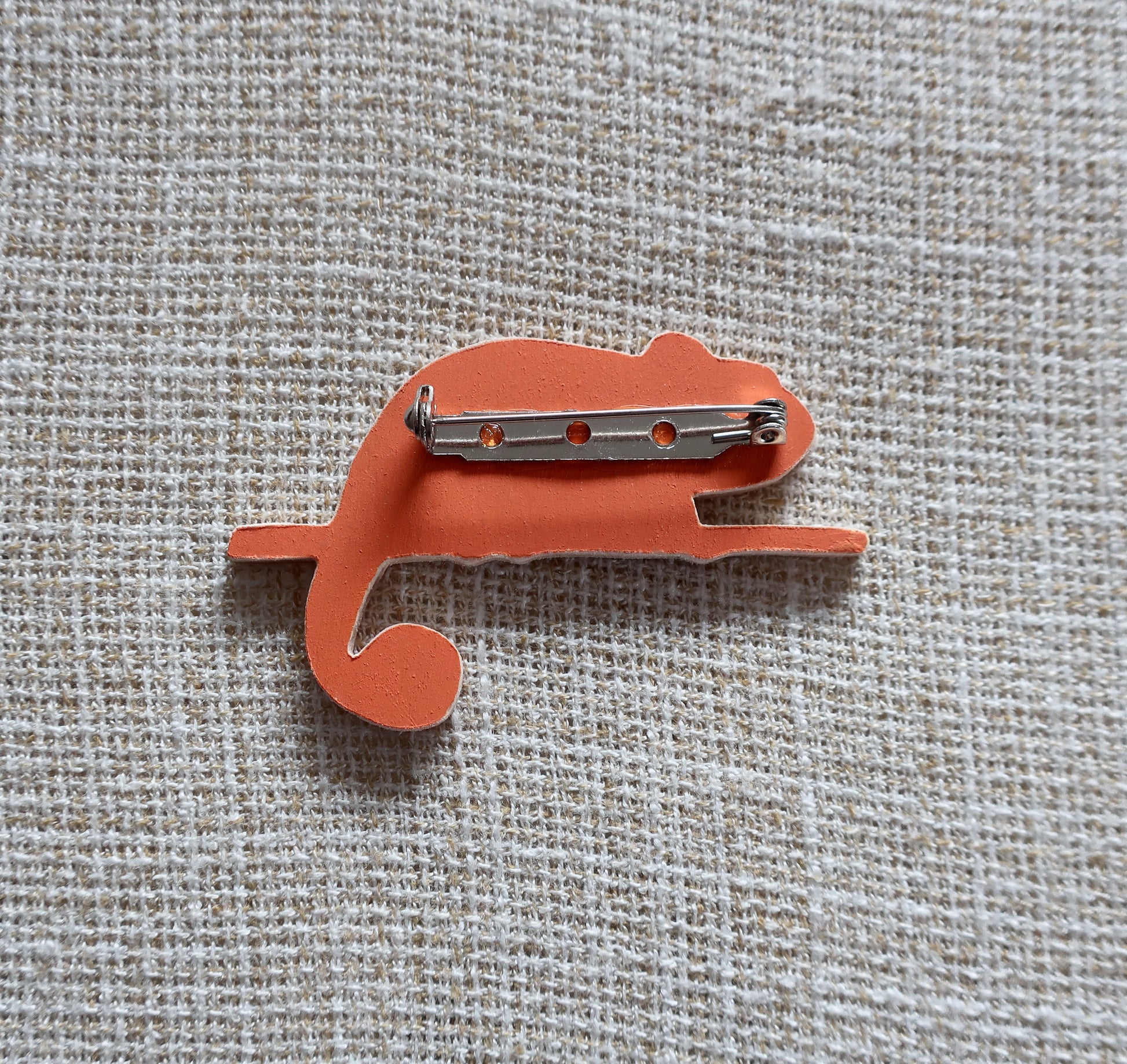 Für diese Brosche habe ich eine Zeichnung am Computer erstellt, die ich anschließend manuell auf Birkenholz übertragen und dann mit einer Dekupiersäge ausgesägt habe. Um die Haltbarkeit zu verbessern wurde eine Schicht matter Lack aufgetragen.