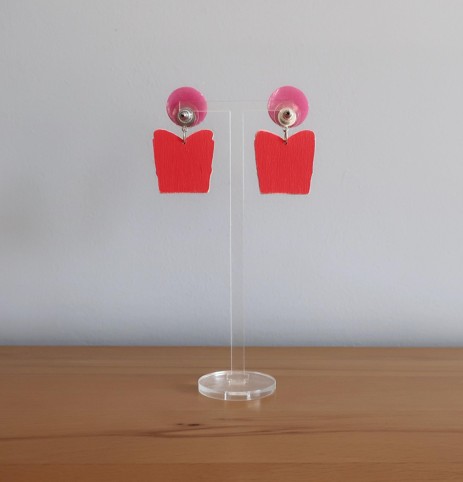 Für diese Ohrringe habe ich eine Zeichnung am Computer erstellt, die ich anschließend manuell auf Birkenholz übertragen und dann mit einer Dekupiersäge ausgesägt habe. Um die Haltbarkeit zu verbessern wurde eine Schicht matter Lack aufgetragen.