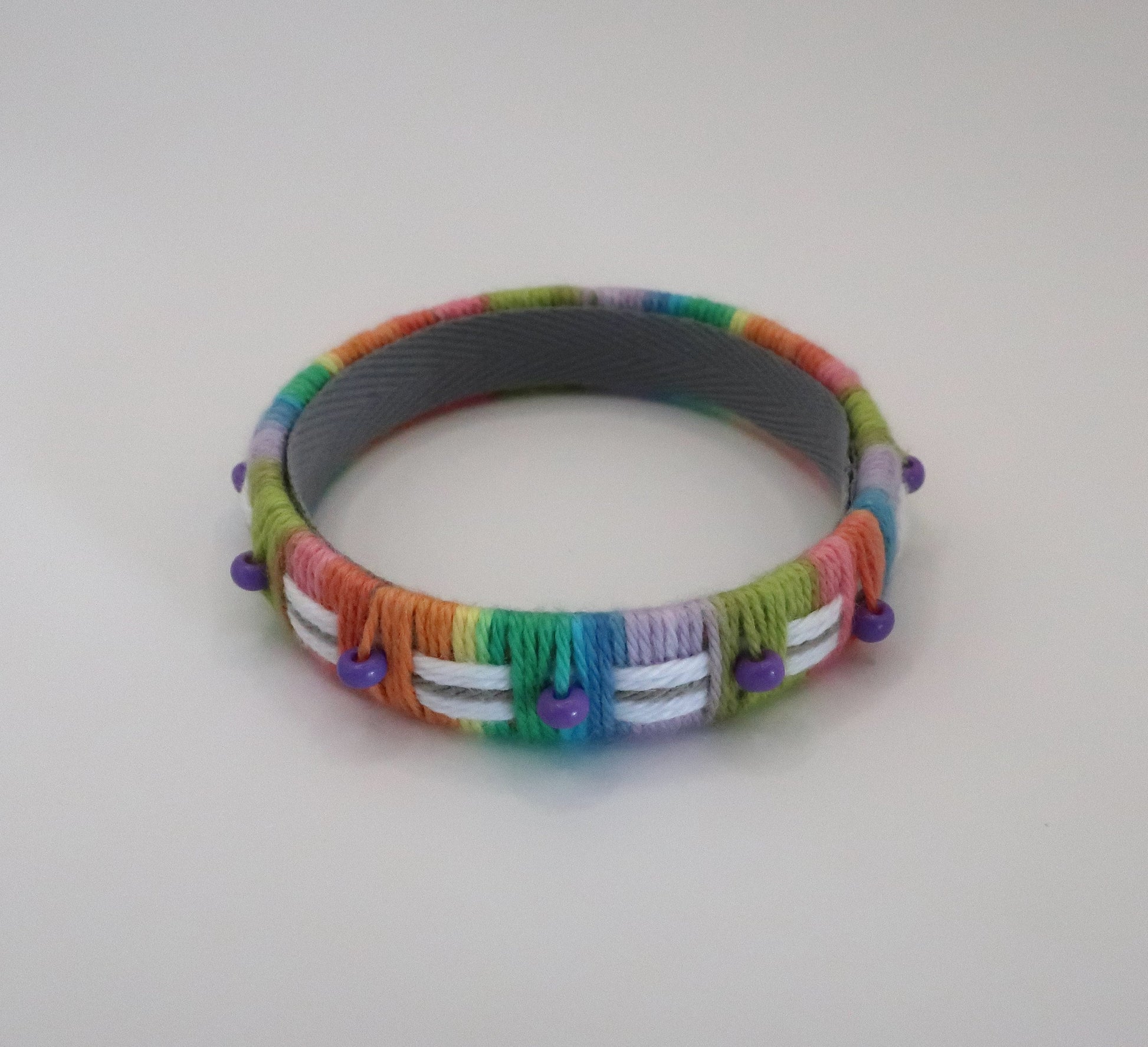 Baumwoll-Armreif in Regenbogenfarben mit lila Glasperlen
