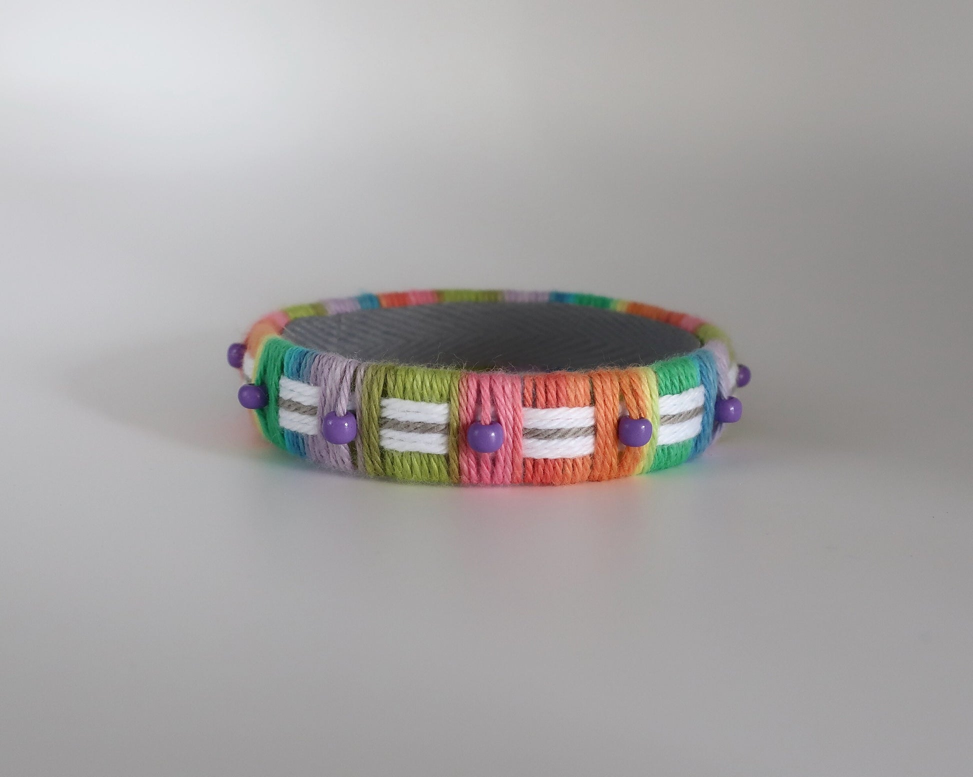 Für diesen Armreif habe ich Baumwollgarn um einen Plastikstreifen gewickelt. Lila Glasperlen runden das Design ab. Die Innenseite des Armreifs ist für einen sauberen Look mit grauem Baumwollschrägband ausgekleidet. Der Armreif ist ungefähr 1,5 cm breit und der innere Durchmesser beträgt ca. 6 cm. Bitte überprüft vor der Bestellung, ob euch der Armreif passt. Dafür könnt ihr euer Handgelenk messen oder die Größe des Armreifs mit Armreifen vergleichen, die ihr schon besitzt. Bei der richtigen Größe muss der Armreif mit etwas Druck über die Hand geschoben werden, damit er nicht zu locker am Handgelenk sitzt.