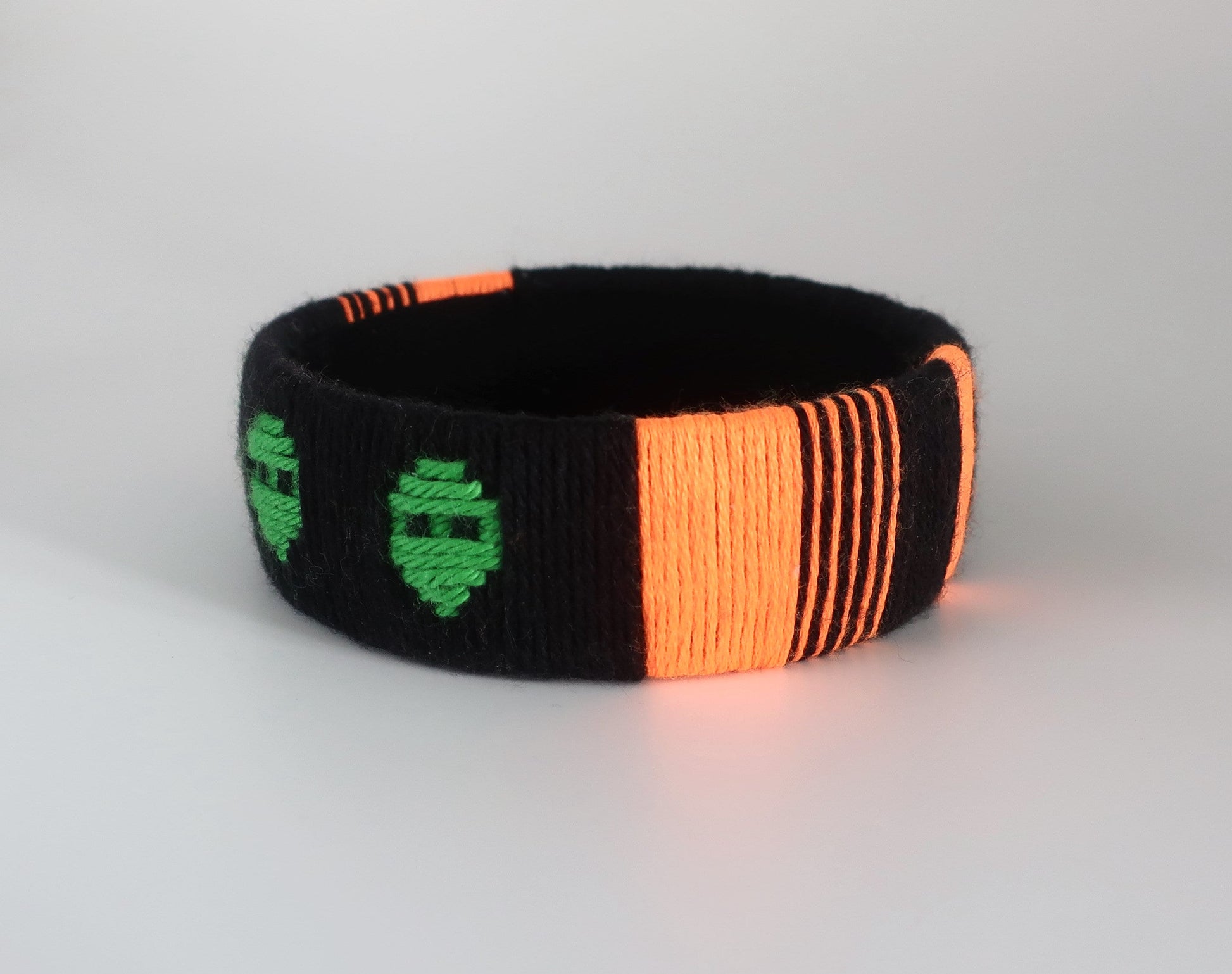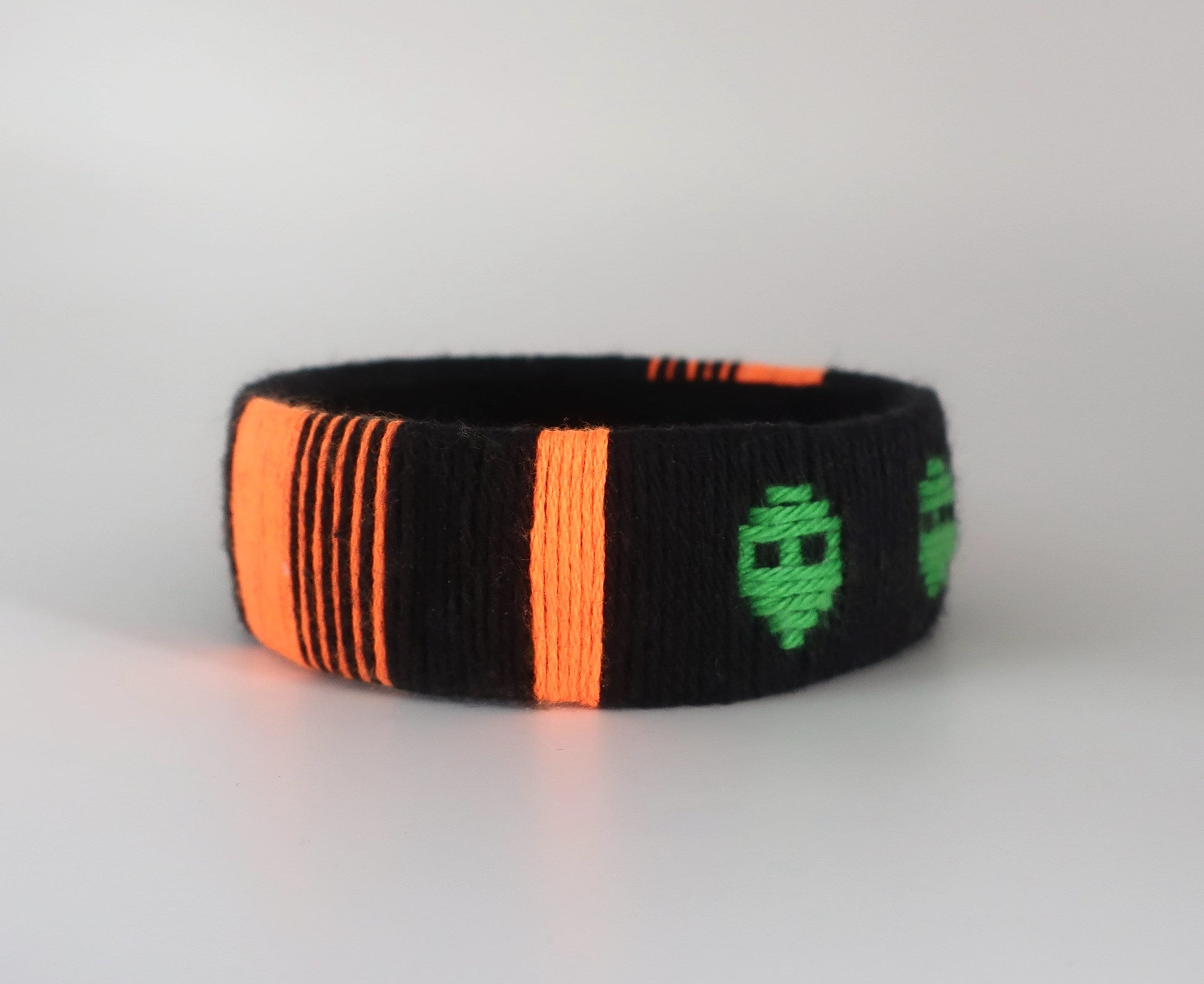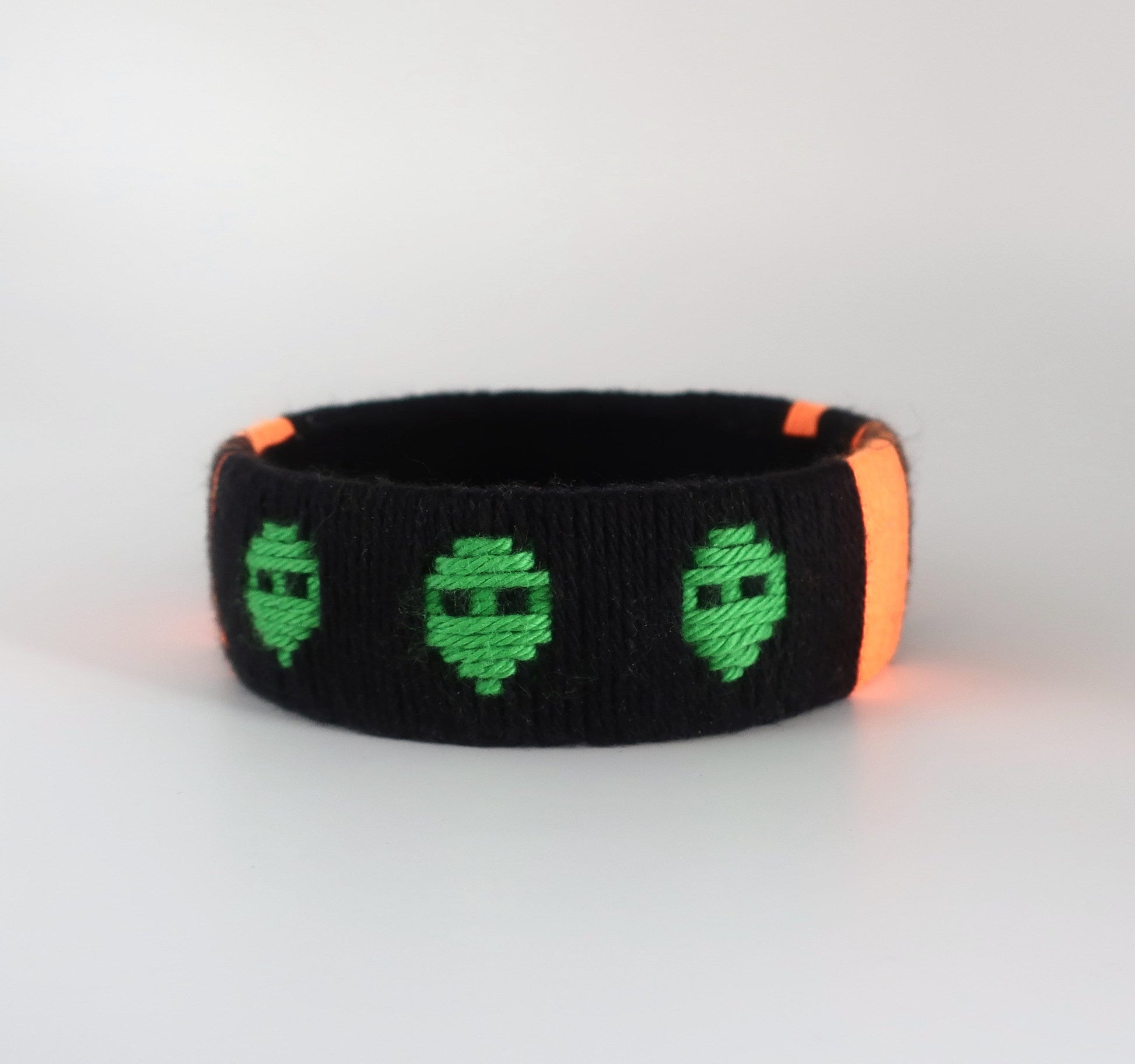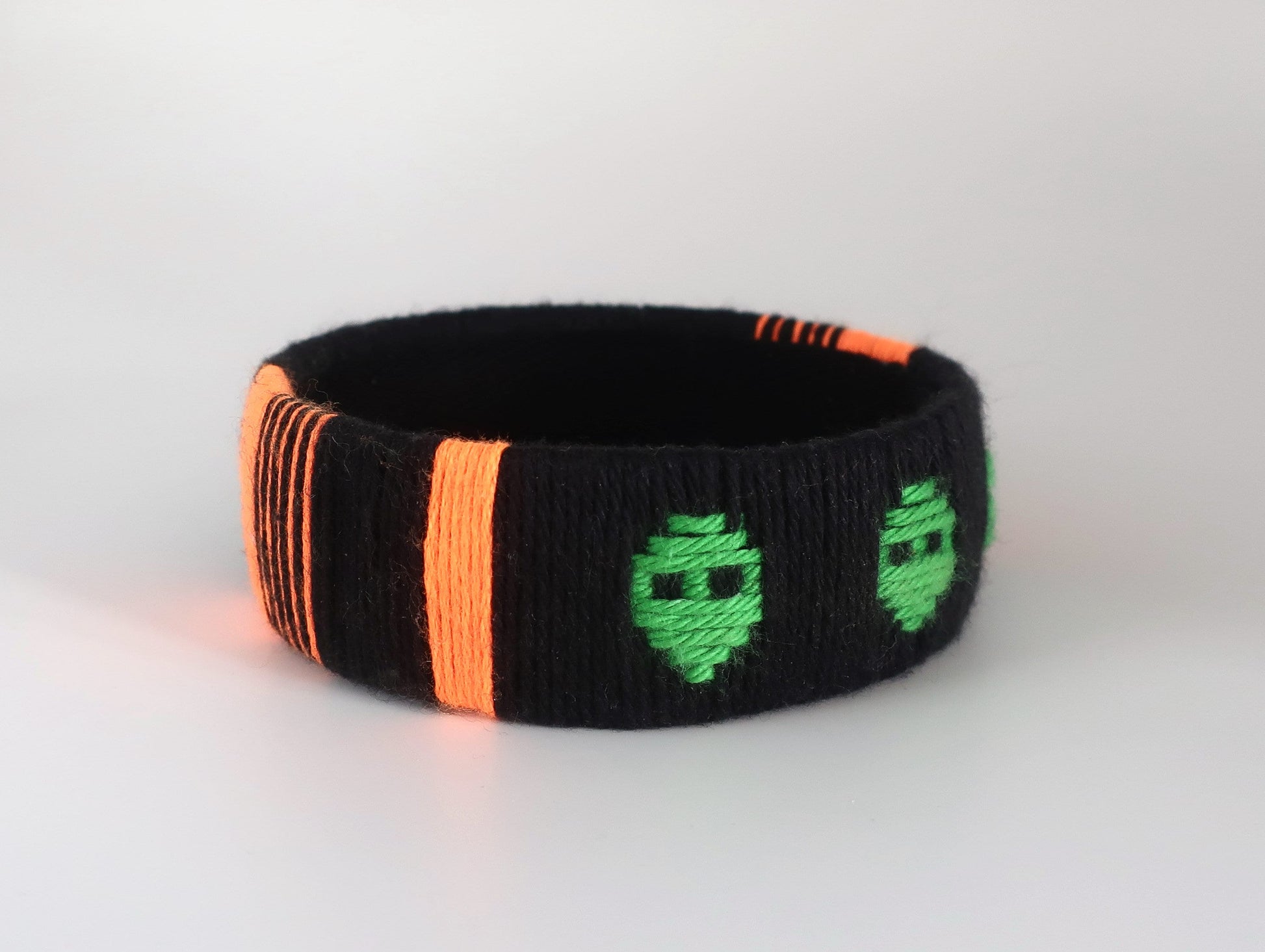 Für diesen Armreif habe ich Baumwollgarn um einen Plastikstreifen gewickelt und ein Muster mit Alienköpfen eingewebt. Die Innenseite des Armreifs ist für einen sauberen Look mit schwarzen Baumwollschrägband ausgekleidet. Der Armreif ist ungefähr 2,5 cm breit und der innere Durchmesser beträgt ca. 7 cm. Bitte überprüft vor der Bestellung, ob euch der Armreif passt. Dafür könnt ihr euer Handgelenk messen oder die Größe des Armreifs mit Armreifen vergleichen, die ihr schon besitzt. Bei der richtigen Größe muss der Armreif mit etwas Druck über die Hand geschoben werden, damit er nicht zu locker am Handgelenk sitzt.