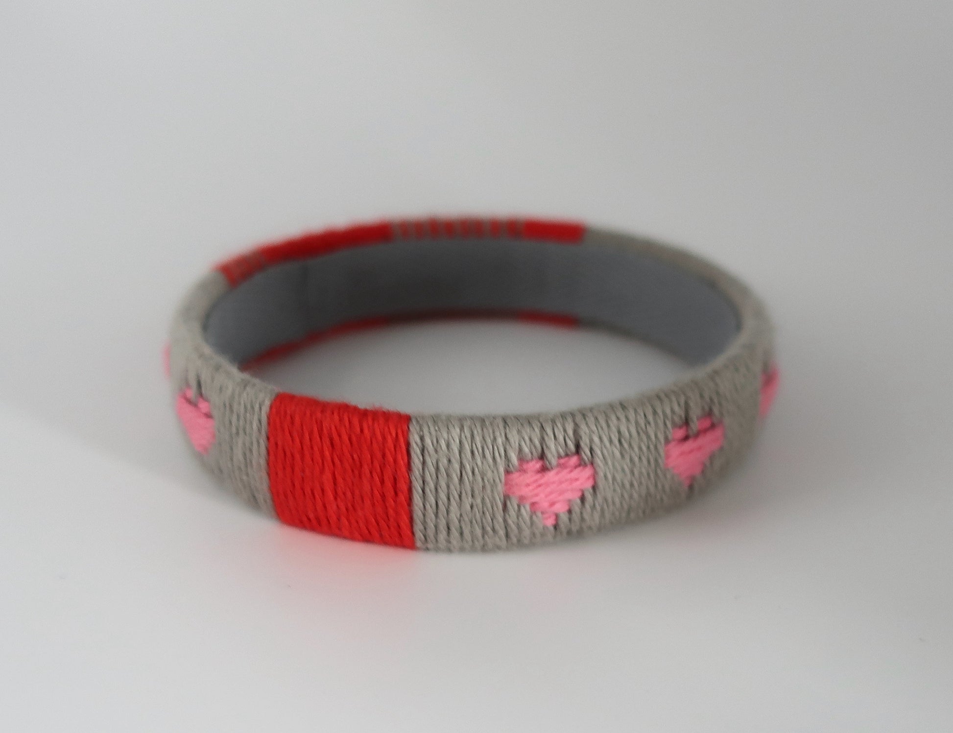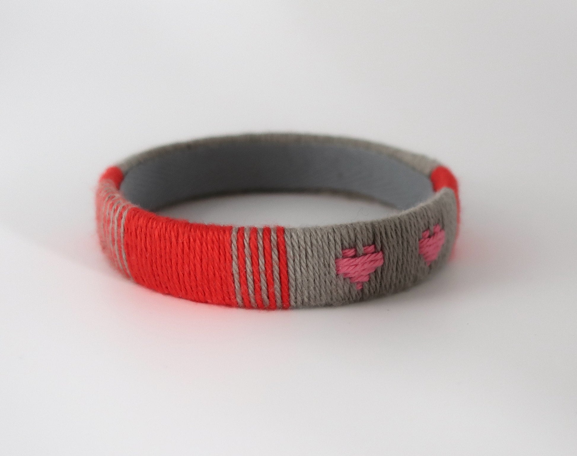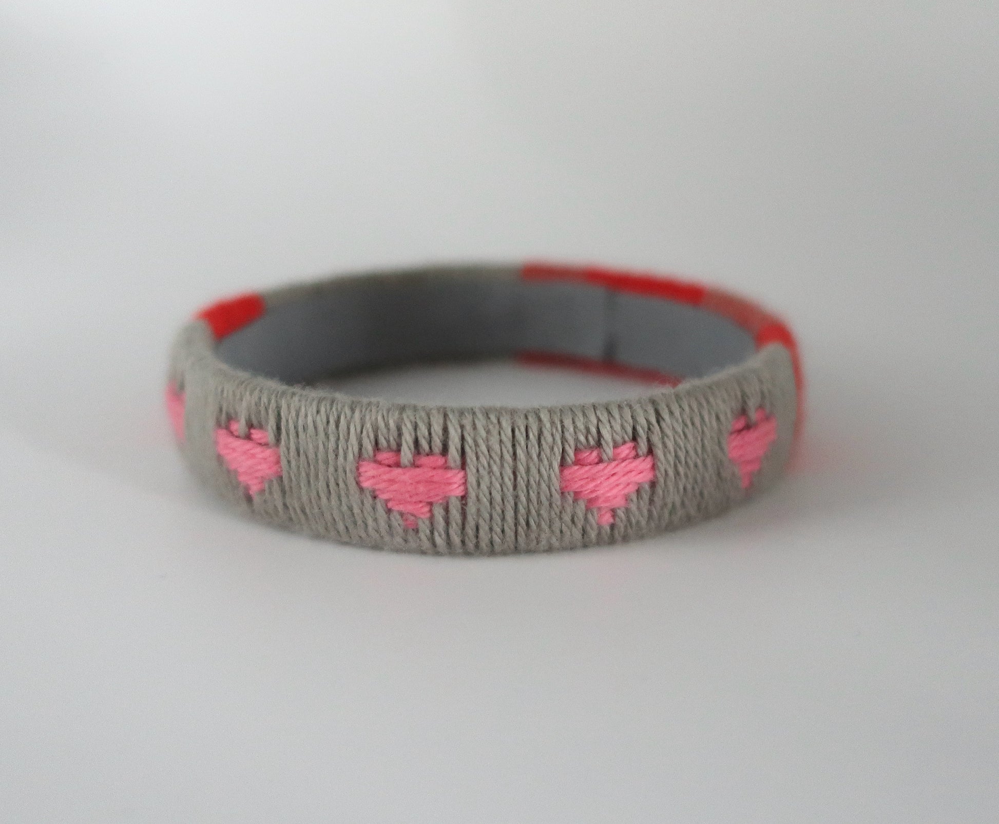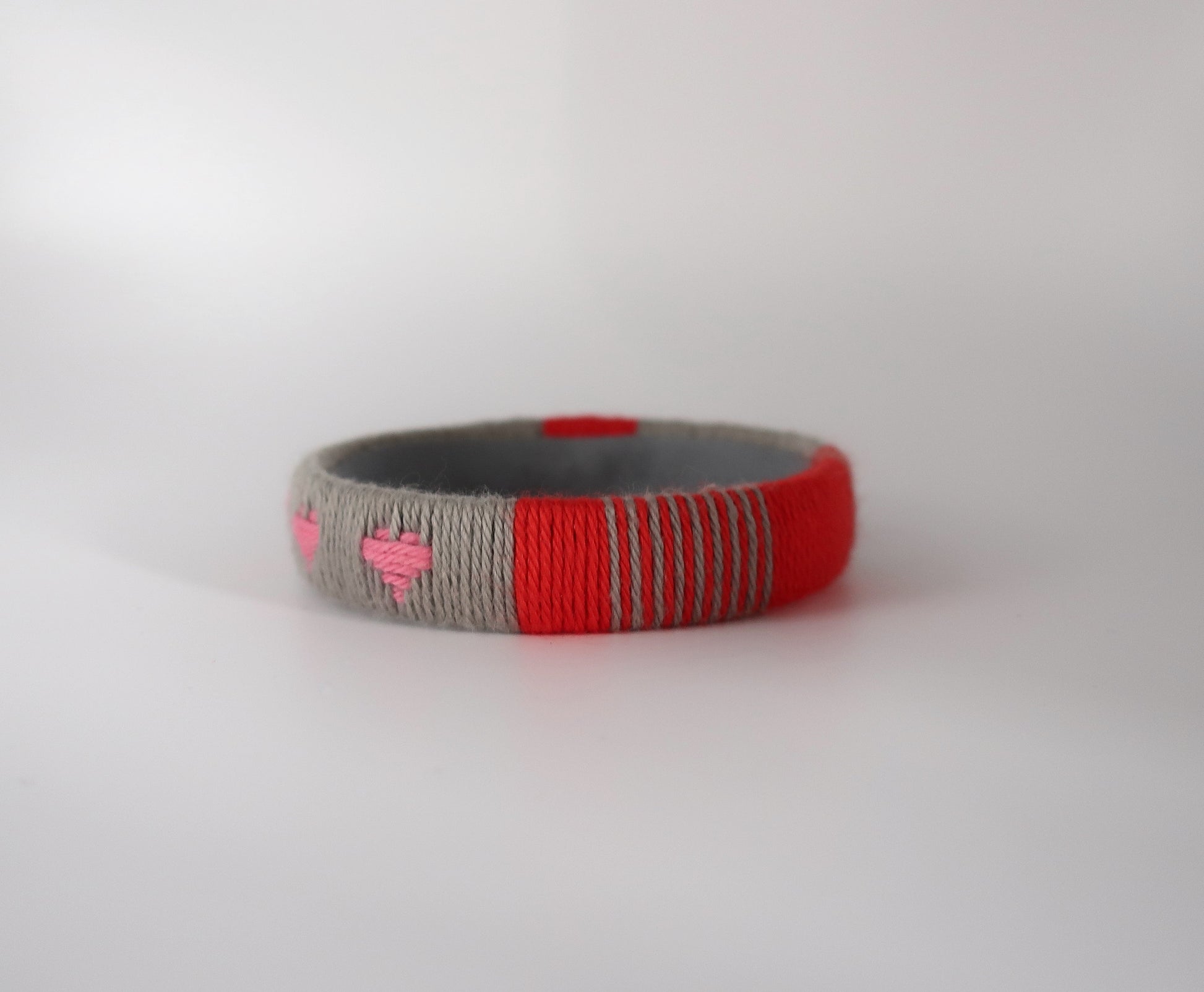 Für diesen Armreif habe ich Baumwollgarn um einen Plastikstreifen gewickelt und ein Herzmuster eingewebt. Die Innenseite des Armreifs ist für einen sauberen Look mit grauem Baumwollschrägband ausgekleidet. Der Armreif ist ungefähr 1.6 cm breit und der innere Durchmesser beträgt ca. 6.5 cm. Bitte überprüft vor der Bestellung, ob euch der Armreif passt. Dafür könnt ihr euer Handgelenk messen oder die Größe des Armreifs mit Armreifen vergleichen, die ihr schon besitzt. Bei der richtigen Größe muss der Armreif mit etwas Druck über die Hand geschoben werden, damit er nicht zu locker am Handgelenk sitzt.