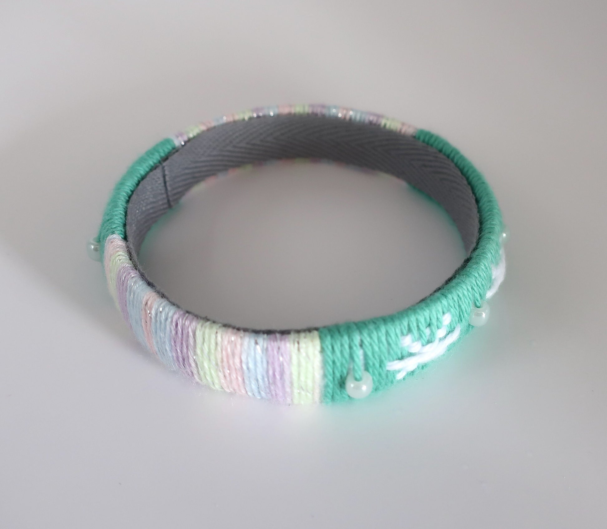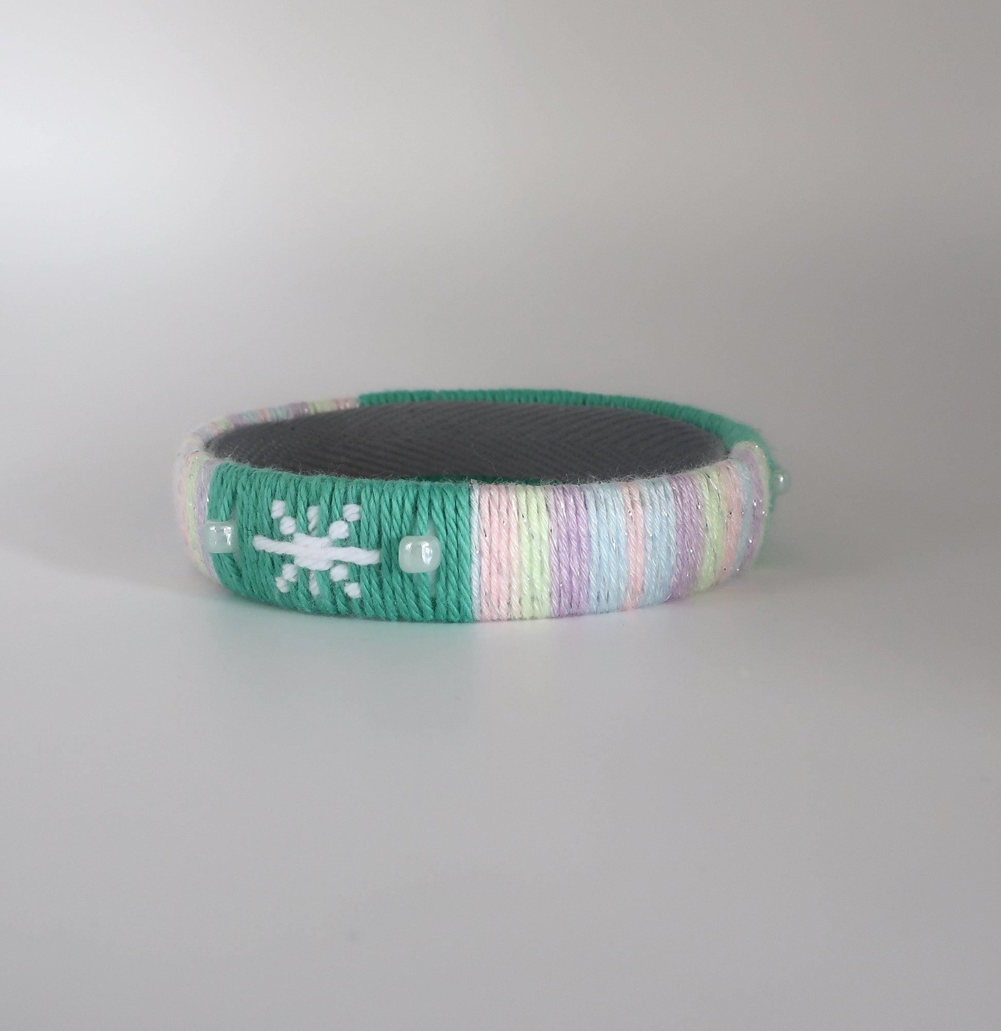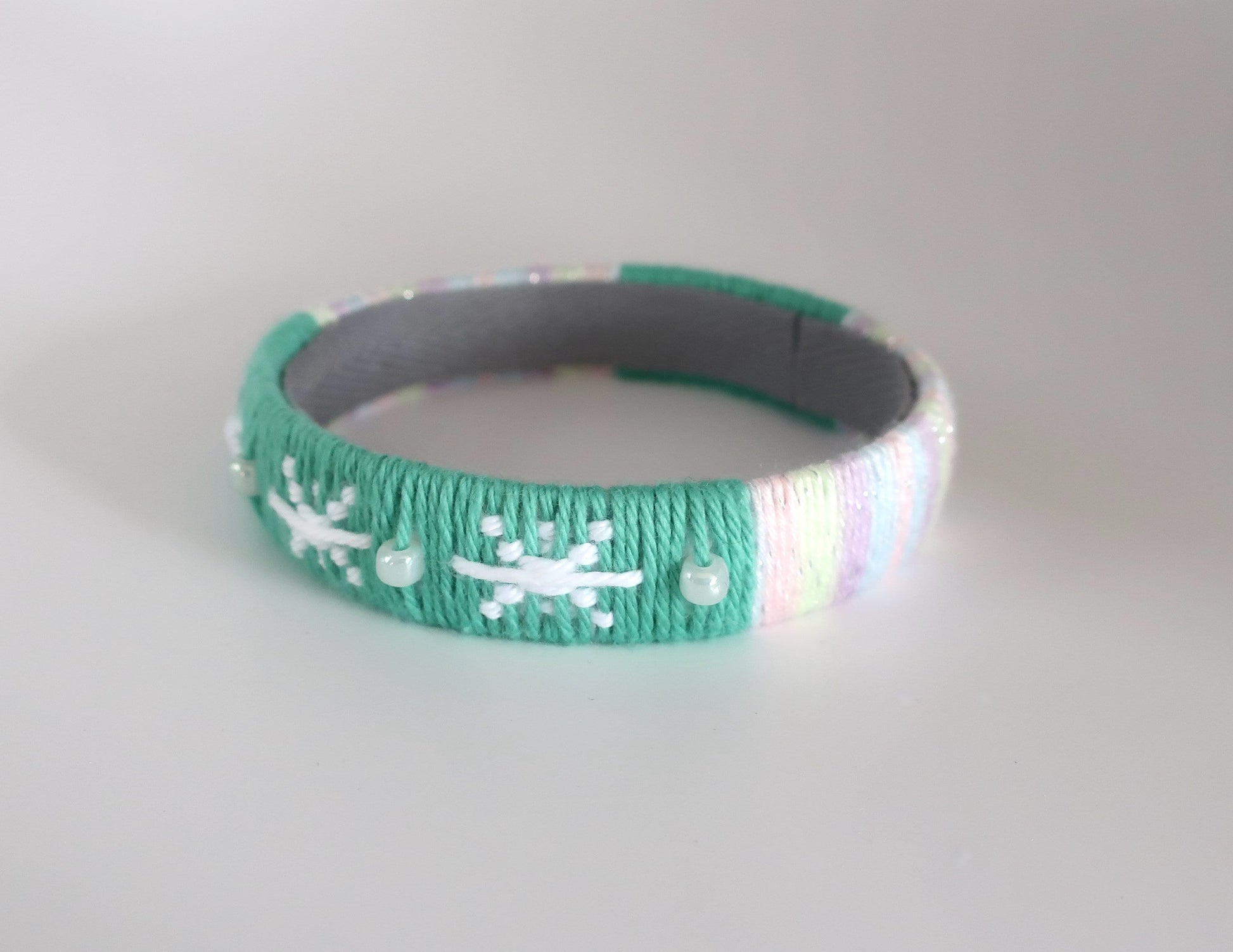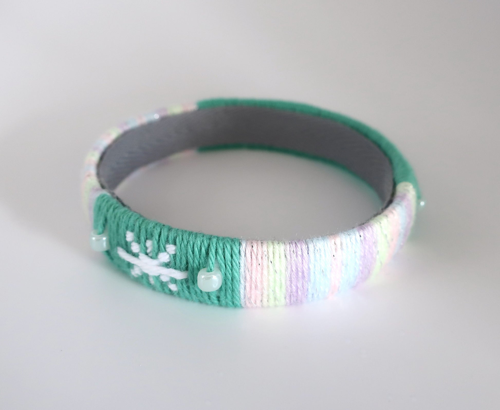 Für diesen Armreif habe ich Baumwollgarn um einen Plastikstreifen gewickelt und ein Sternenmuster eingewebt. Weiße Glasperlen sorgen für ein wenig Schimmer. Die Innenseite des Armreifs ist für einen sauberen Look mit grauem Baumwollschrägband ausgekleidet. Der Armreif ist ungefähr 1,5 cm breit und der innere Durchmesser beträgt ca. 6,5 cm. Bitte überprüft vor der Bestellung, ob euch der Armreif passt. Dafür könnt ihr euer Handgelenk messen oder die Größe des Armreifs mit Armreifen vergleichen, die ihr schon besitzt. Bei der richtigen Größe muss der Armreif mit etwas Druck über die Hand geschoben werden, damit er nicht zu locker am Handgelenk sitzt.