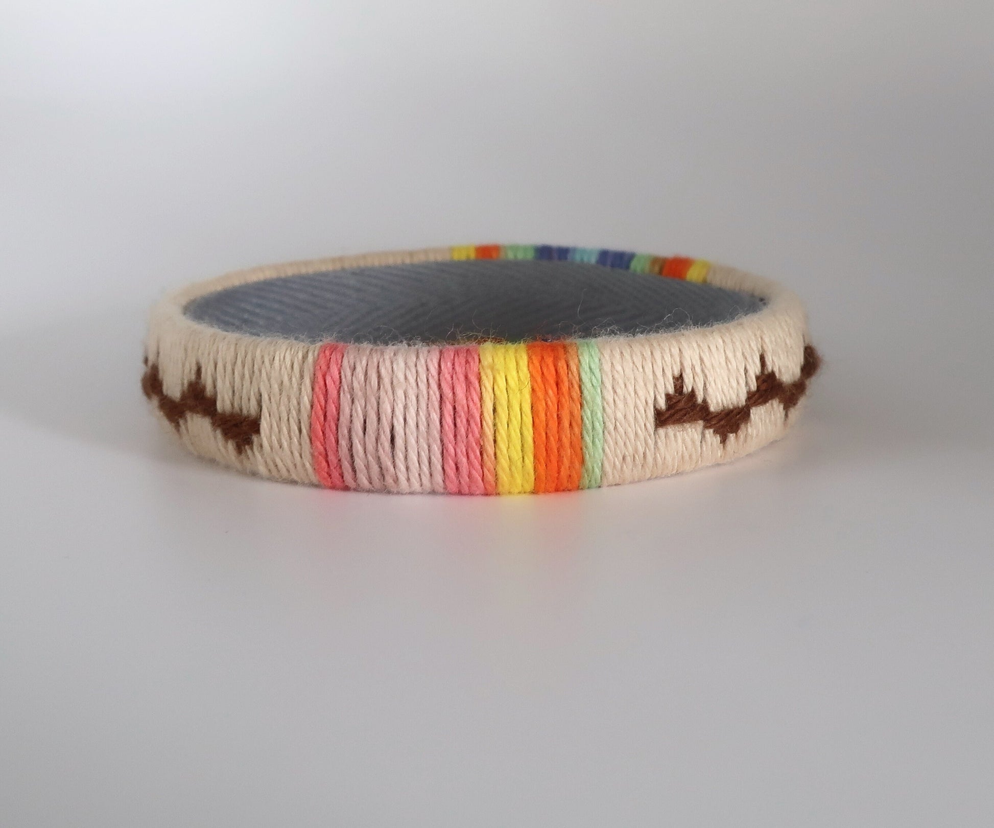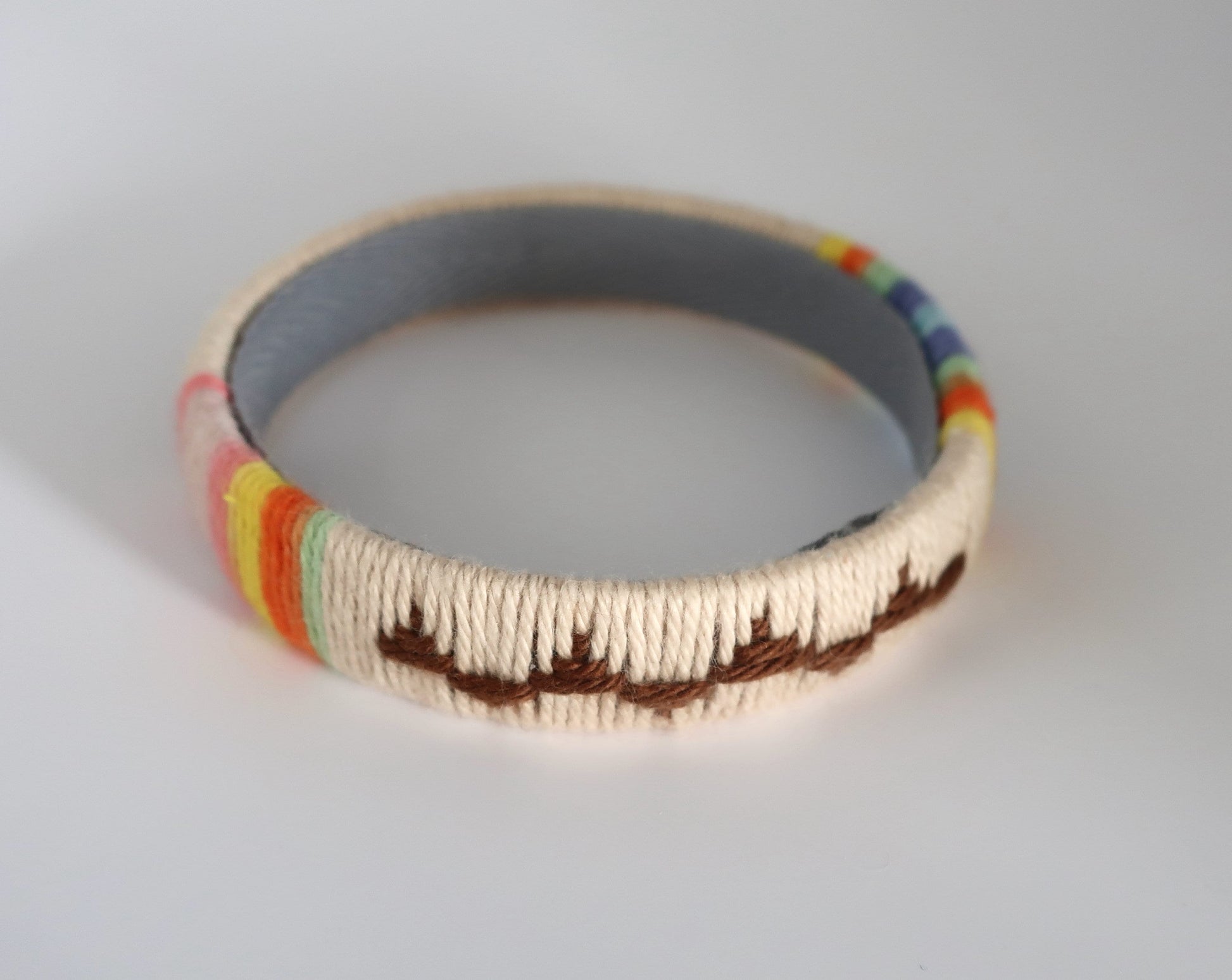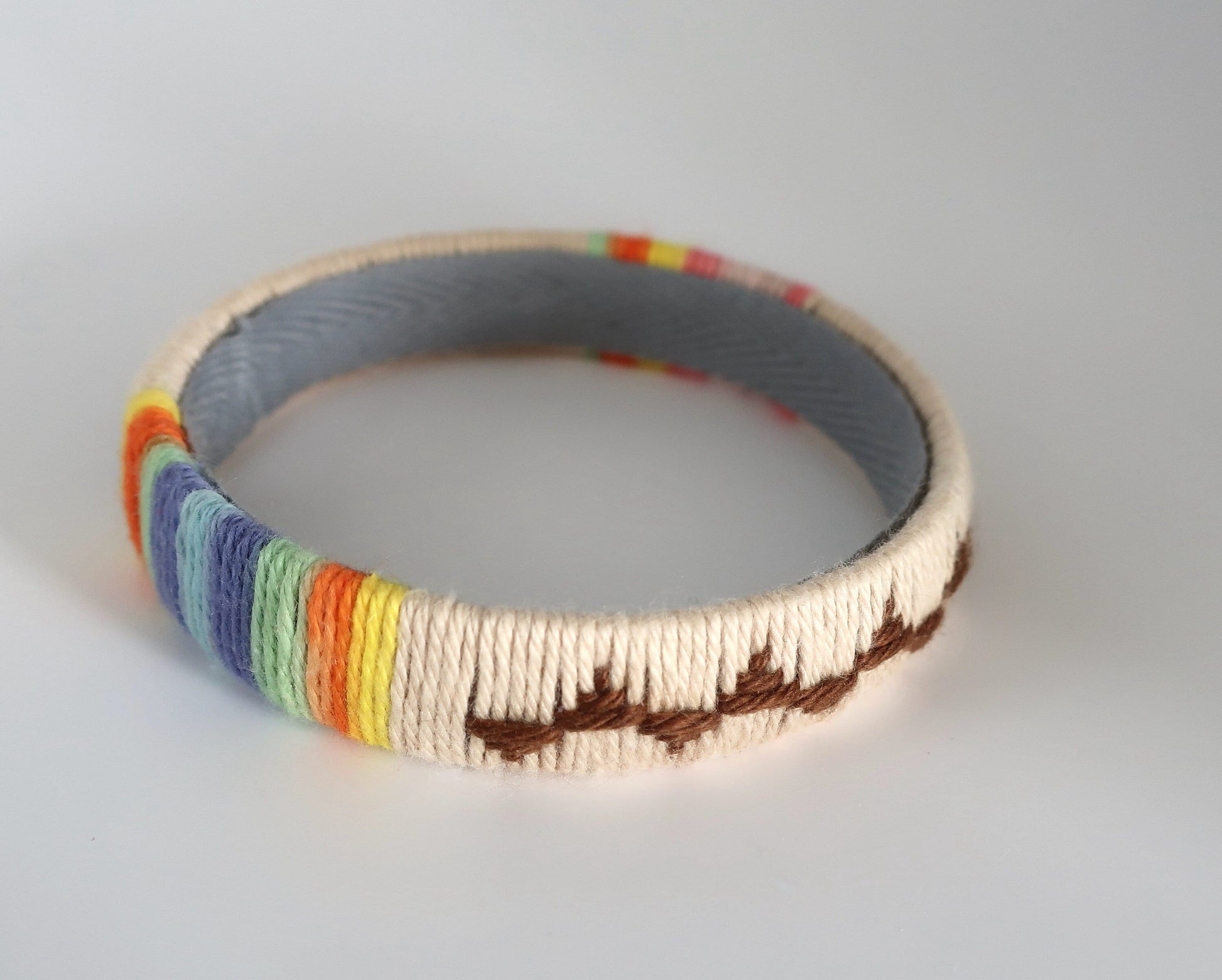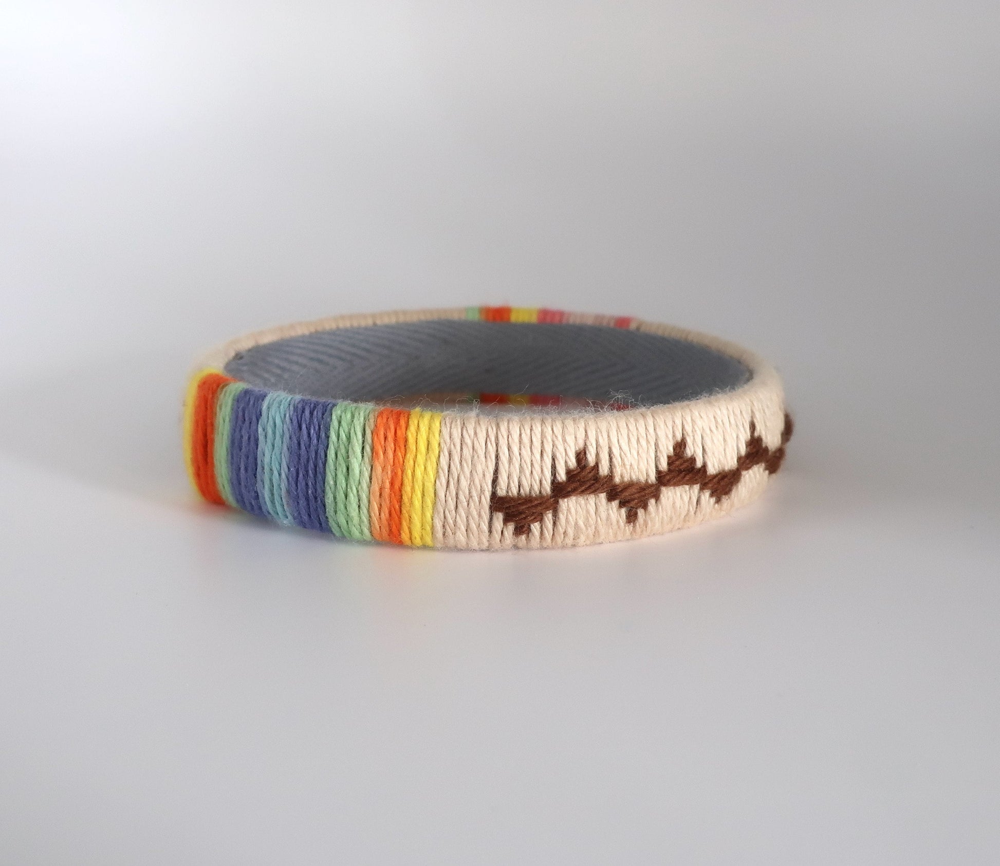 Für diesen Armreif habe ich Baumwollgarn um einen Plastikstreifen gewickelt und eine Zickzack-Linie eingewebt. Die Innenseite des Armreifs ist für einen sauberen Look mit grauem Baumwollschrägband ausgekleidet. Der Armreif ist ungefähr 1.5 cm breit und der innere Durchmesser beträgt ca. 6.3 cm. Bitte überprüft vor der Bestellung, ob euch der Armreif passt. Dafür könnt ihr euer Handgelenk messen oder die Größe des Armreifs mit Armreifen vergleichen, die ihr schon besitzt. Bei der richtigen Größe muss der Armreif mit etwas Druck über die Hand geschoben werden, damit er nicht zu locker am Handgelenk sitzt.