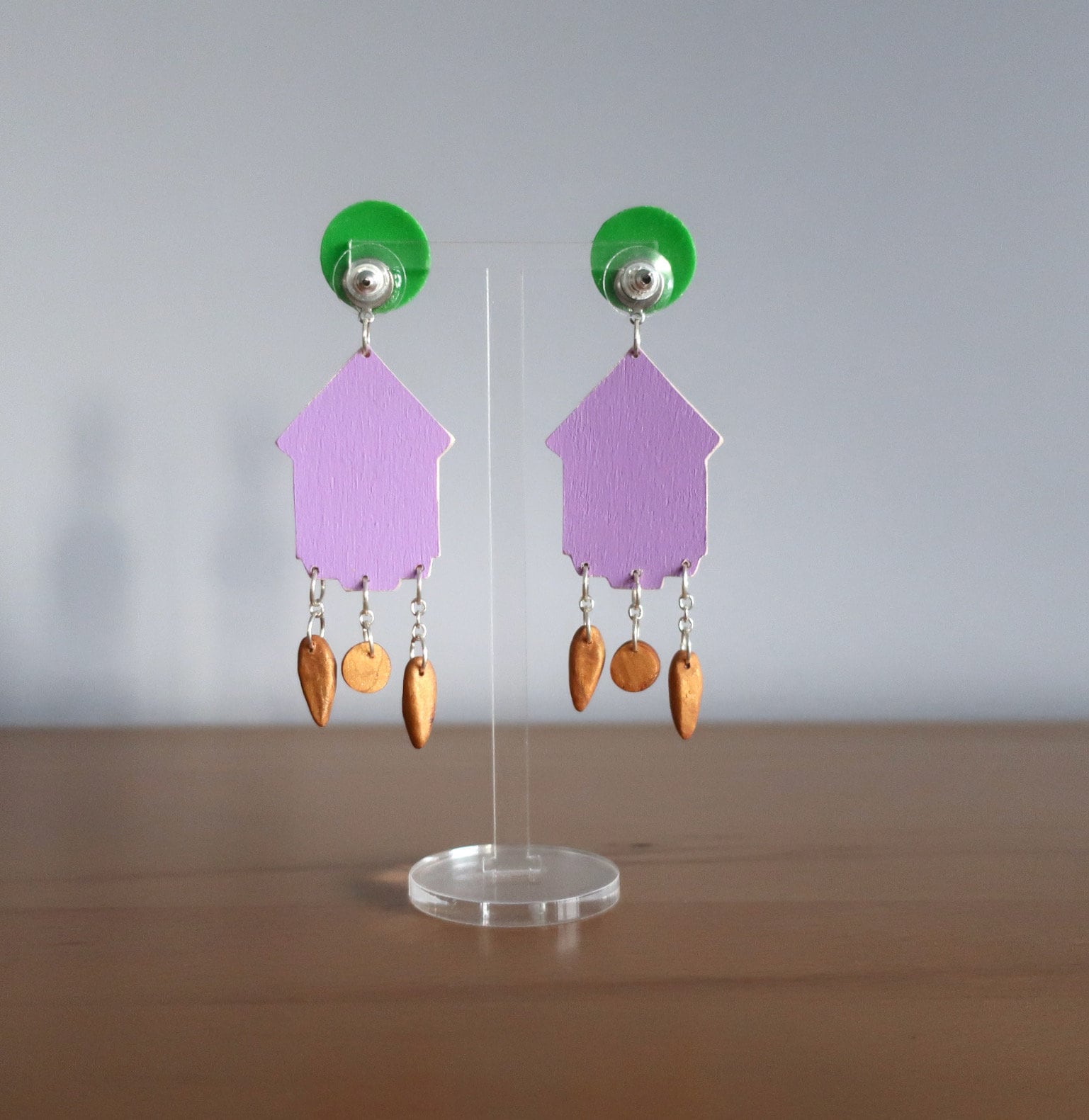 Für diese Ohrringe habe ich eine Zeichnung am Computer erstellt, die ich anschließend manuell auf Birkenholz übertragen und dann mit einer Dekupiersäge ausgesägt habe. Um die Haltbarkeit zu verbessern wurde eine Schicht matter Lack aufgetragen. Die 'Tannenzapfen' und das 'Pendel' sind aus Fimo.