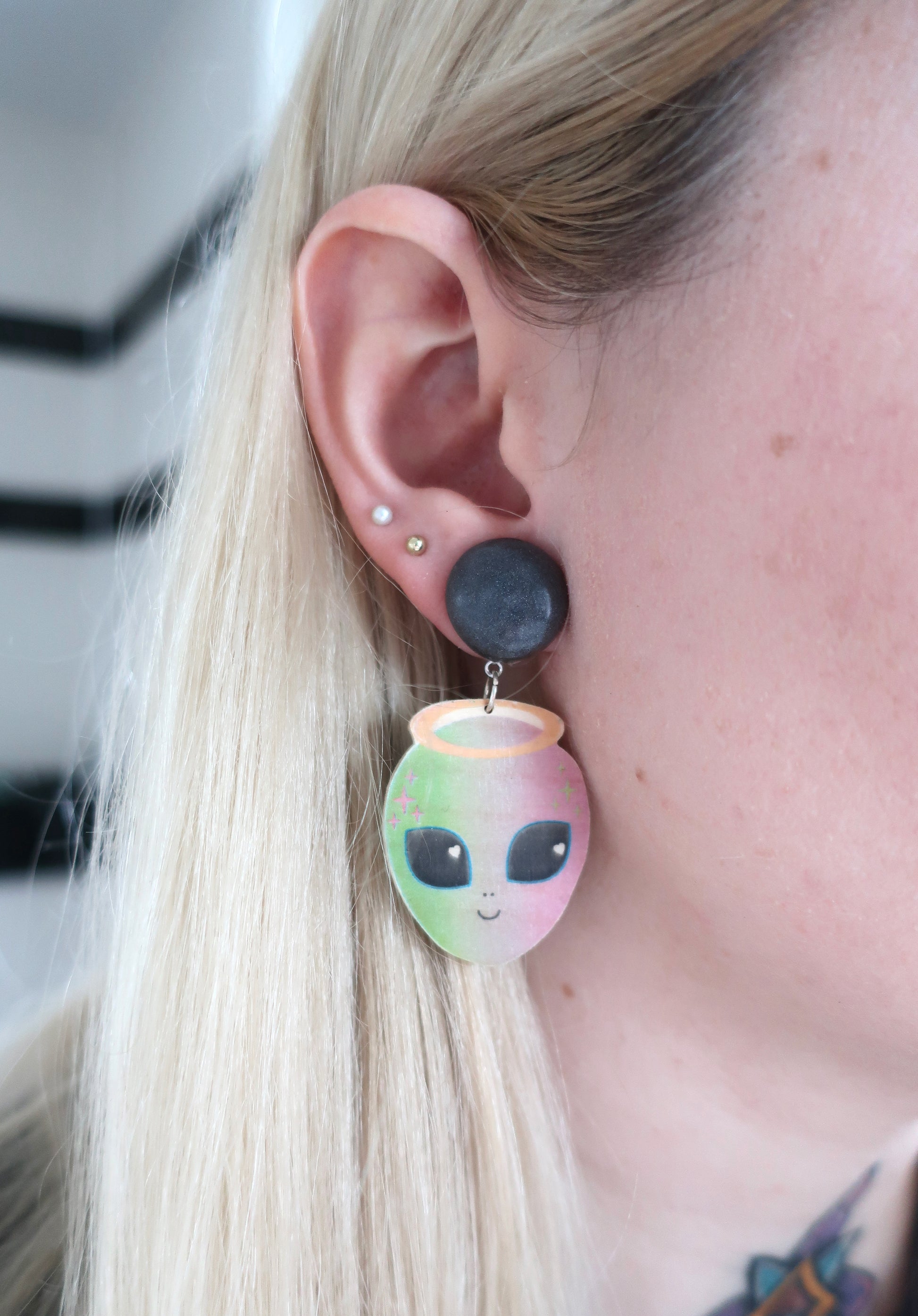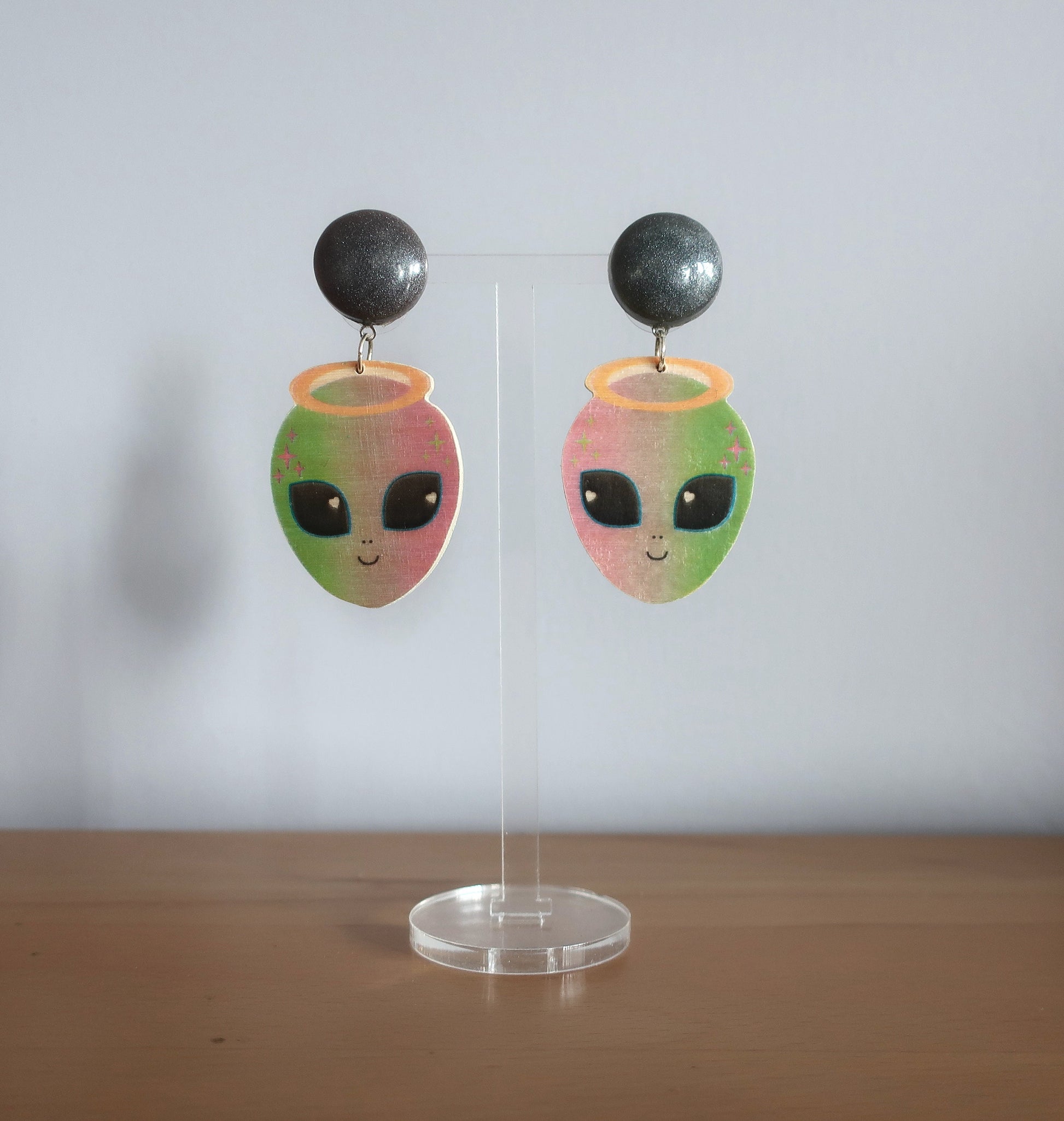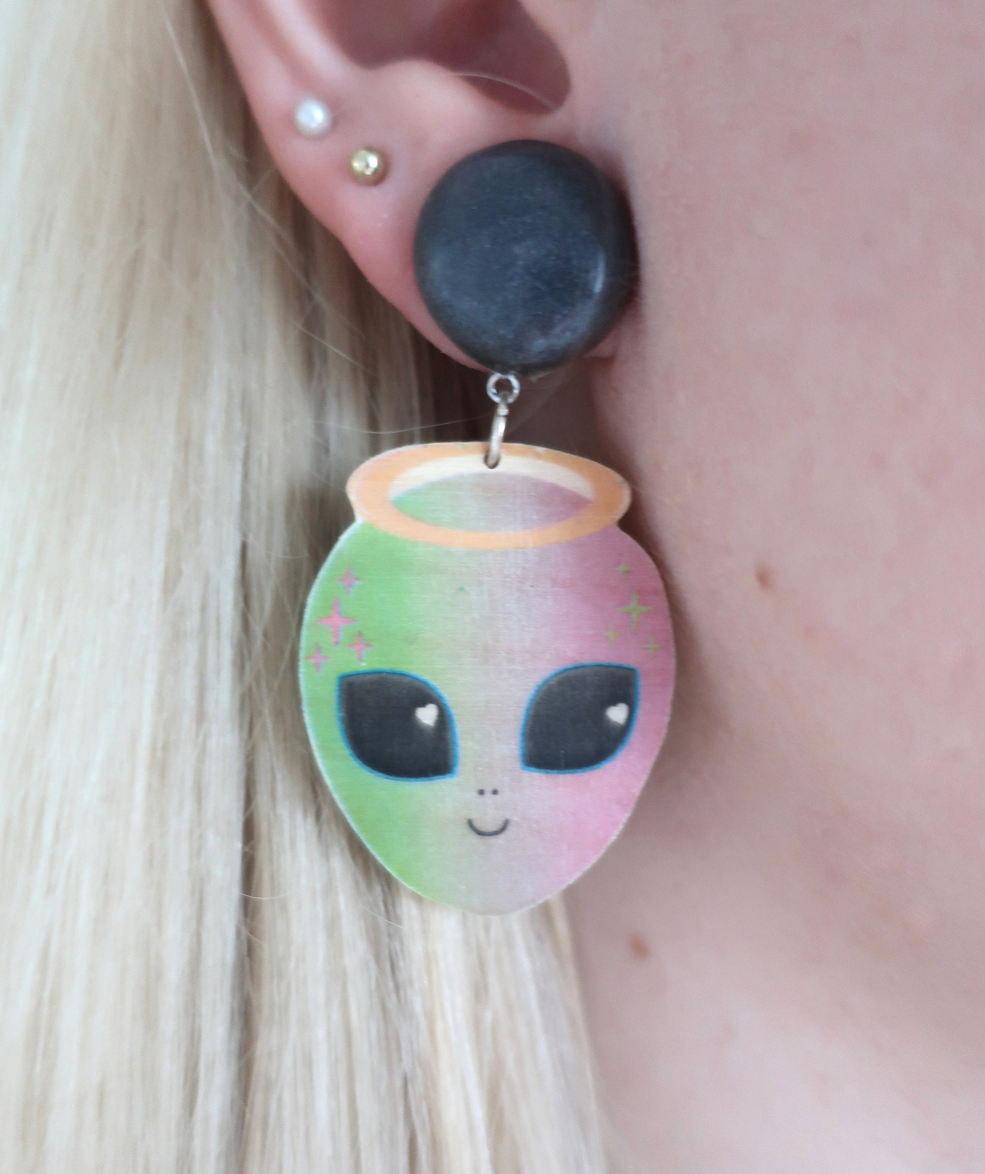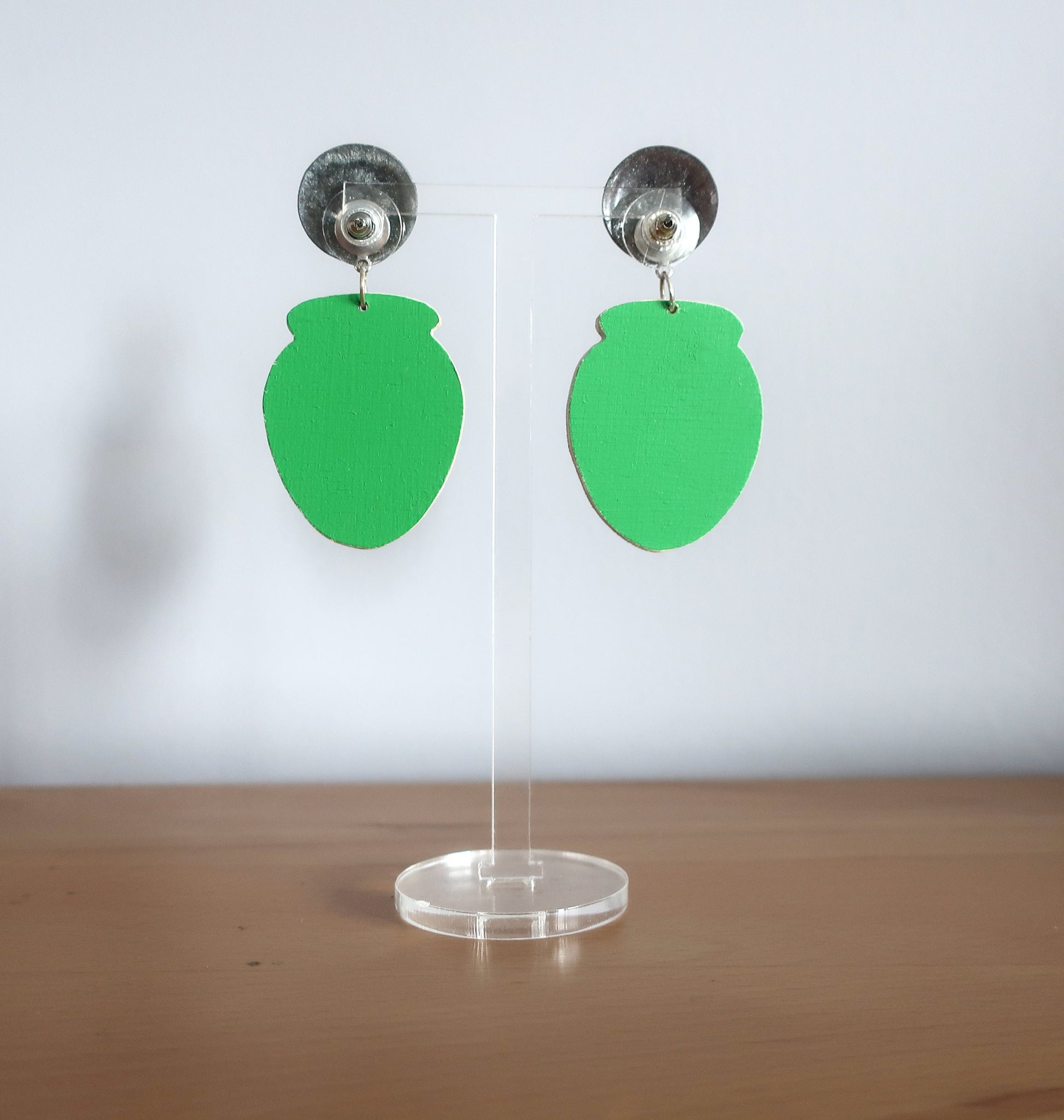 Für diese Ohrringe habe ich eine Zeichnung am Computer erstellt, die ich anschließend manuell auf Birkenholz übertragen und dann mit einer Dekupiersäge ausgesägt habe. Um die Haltbarkeit zu verbessern wurde eine Schicht matter Lack aufgetragen.