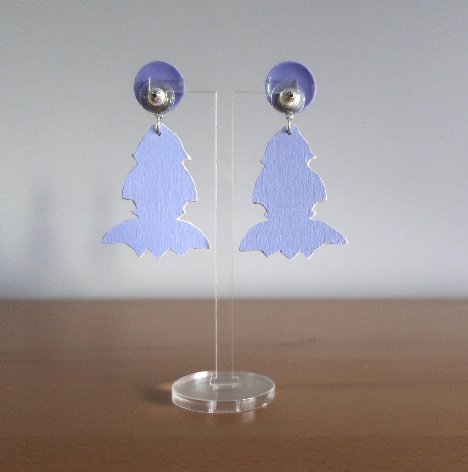 Für diese Ohrringe habe ich eine Zeichnung am Computer erstellt, die ich anschließend manuell auf Birkenholz übertragen und dann mit einer Dekupiersäge ausgesägt habe. Um die Haltbarkeit zu verbessern wurde eine Schicht matter Lack aufgetragen.