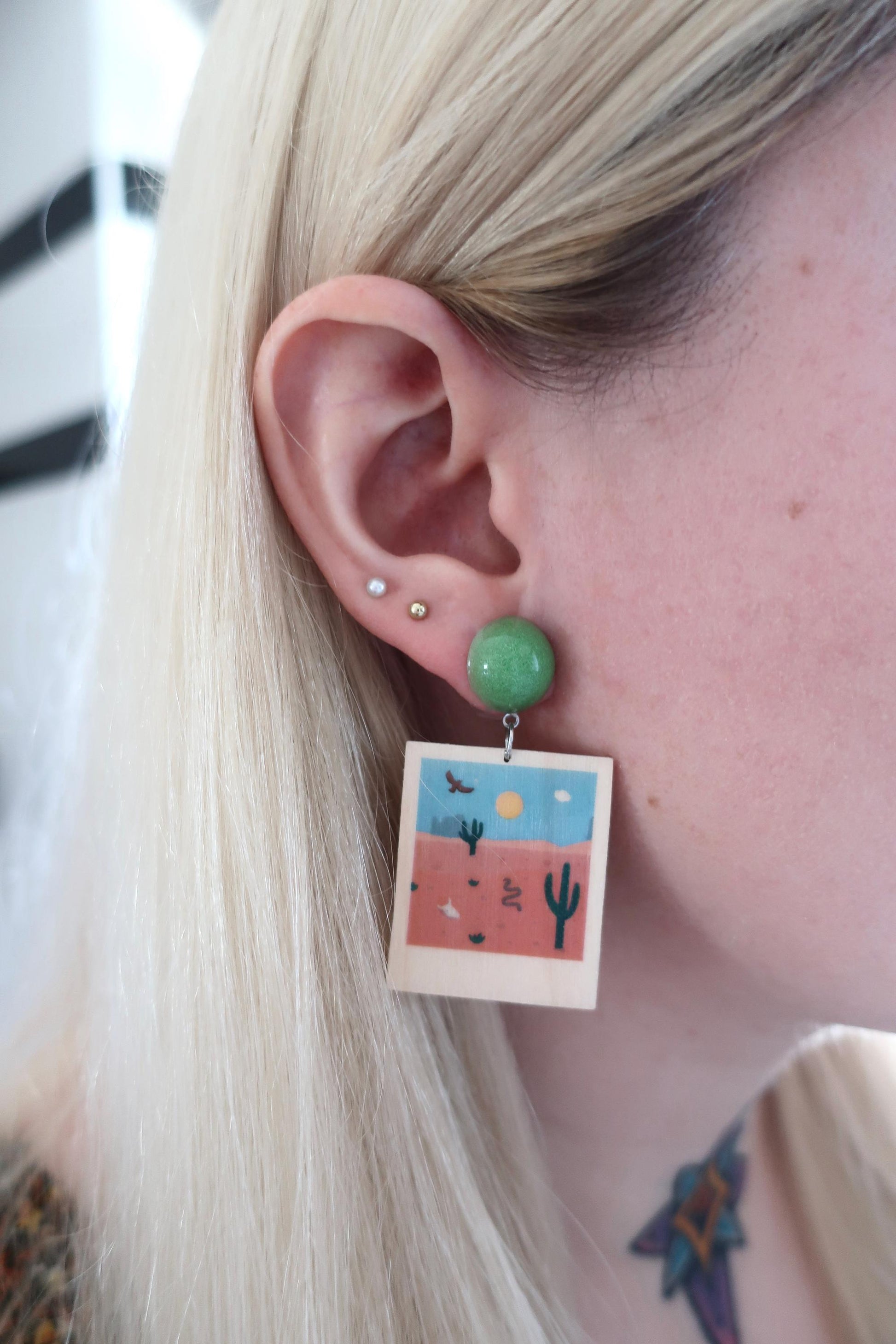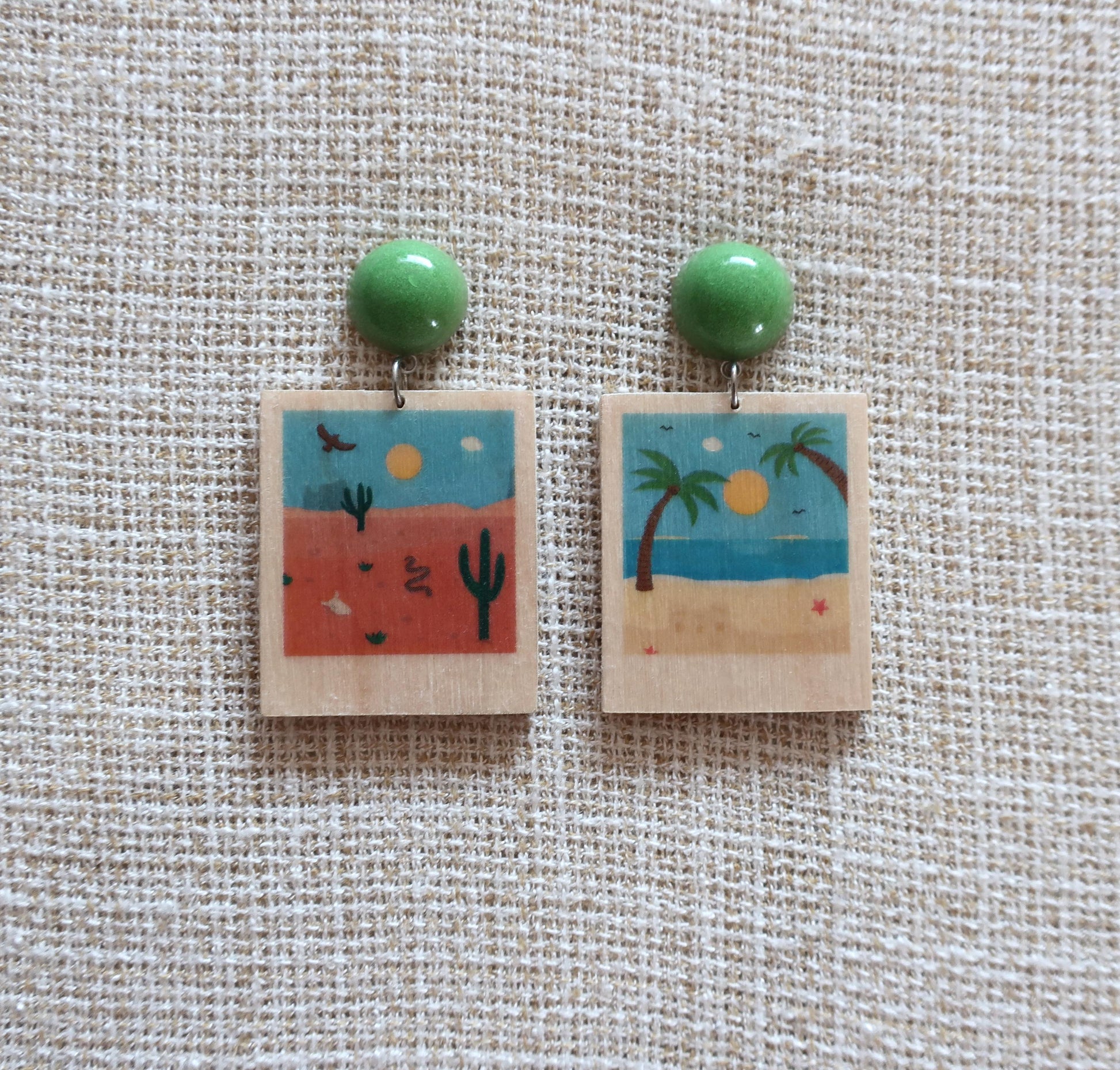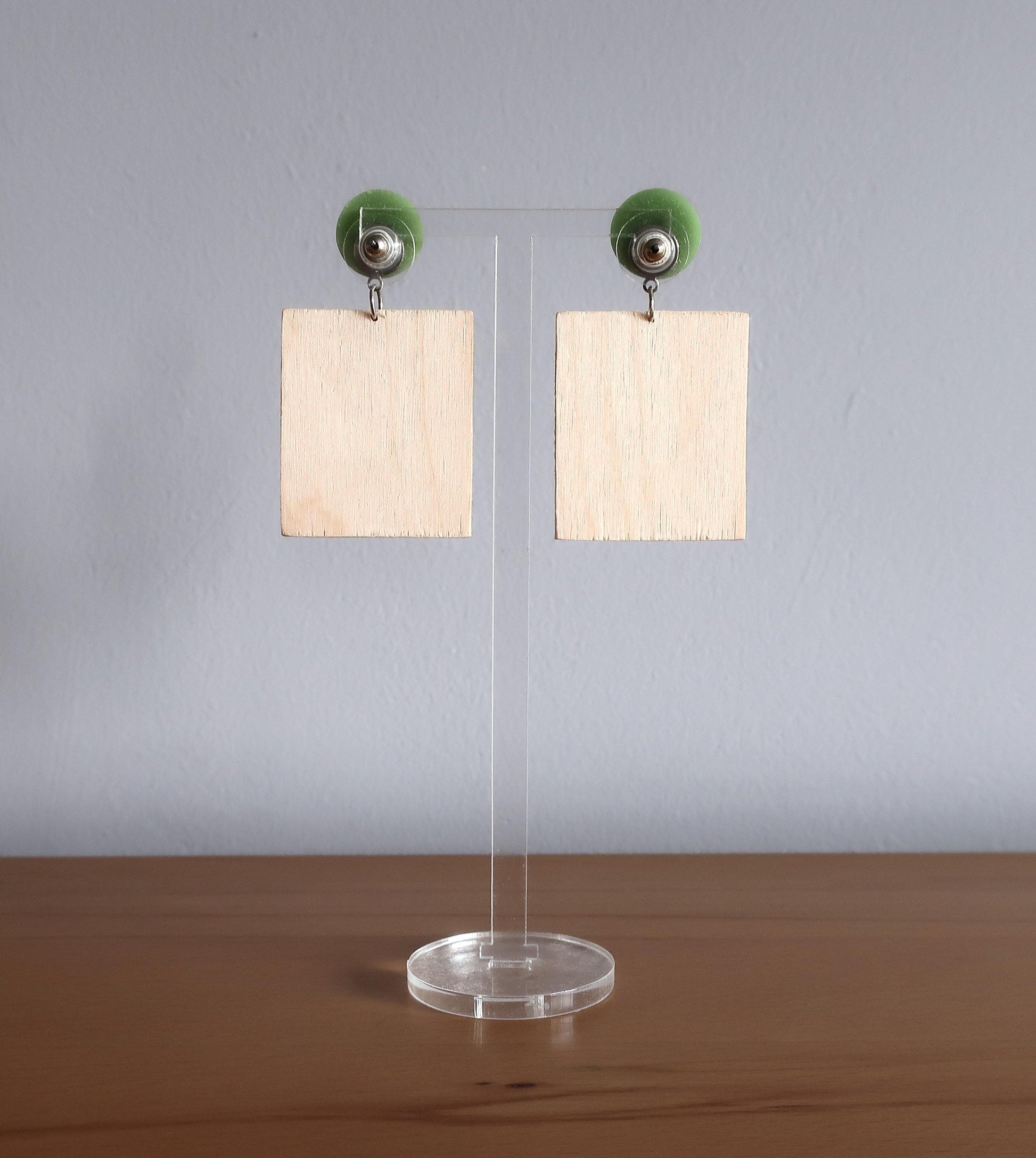 Für diese Ohrringe habe ich eine Zeichnung am Computer erstellt, die ich anschließend manuell auf Birkenholz übertragen und dann mit einer Dekupiersäge ausgesägt habe. Um die Haltbarkeit zu verbessern wurde eine Schicht matter Lack aufgetragen.