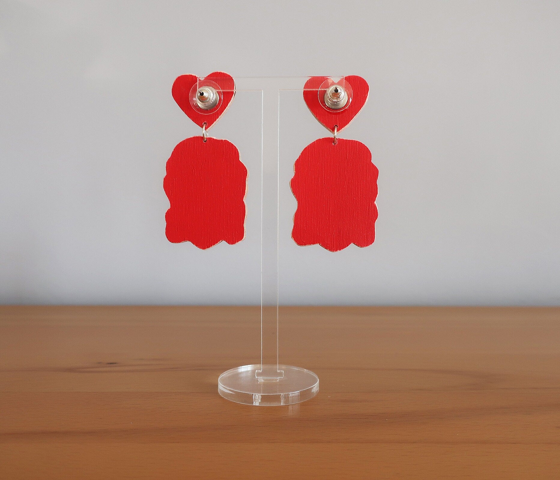Für diese Ohrringe habe ich eine Zeichnung am Computer erstellt, die ich anschließend manuell auf Birkenholz übertragen und dann mit einer Dekupiersäge ausgesägt habe. Um die Haltbarkeit zu verbessern wurde eine Schicht matter Lack aufgetragen.