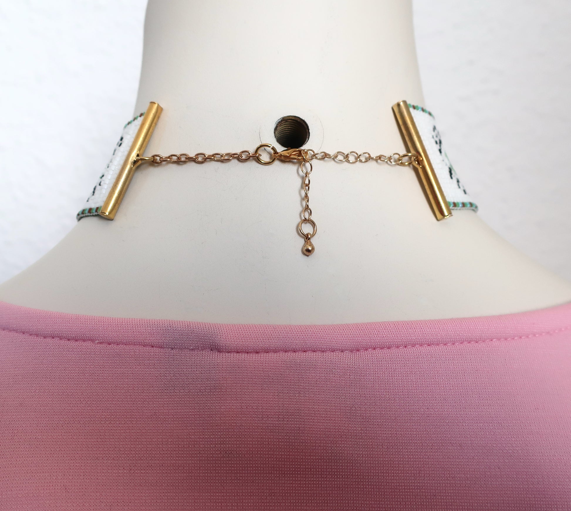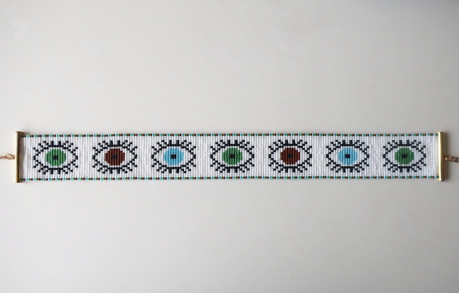 Dies ist ein handgewebter Choker aus hochwertigen japanischen Miyuki-Perlen. Er hat goldfarbene Röhrenenden, ein Kettchen mit Karabinerhaken als Verschluss und eine 5,5 cm lange Verlängerungskette. Es ist 3,1 cm breit.