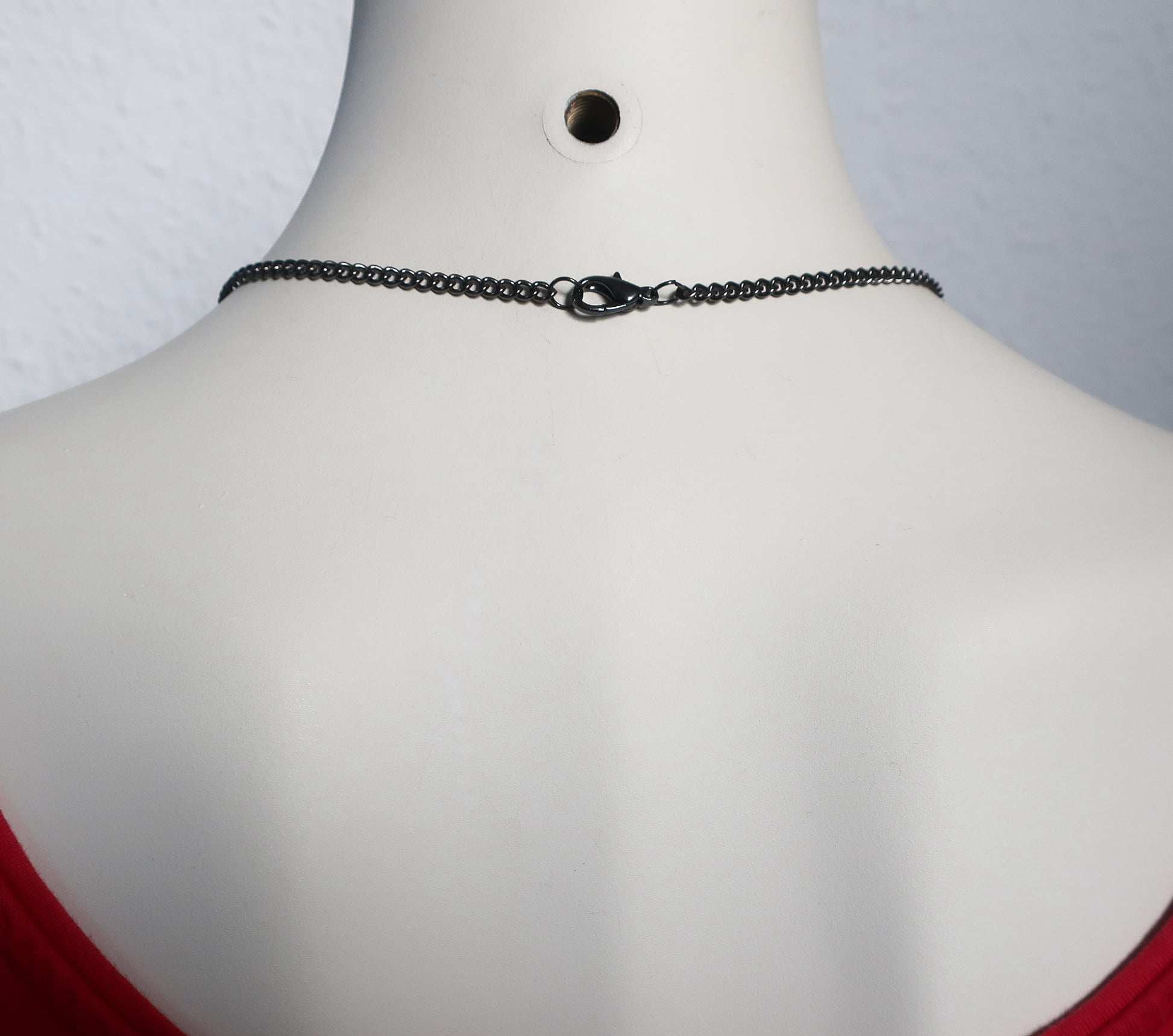 Die anthrazitfarbene Metallkette ist ungefähr 43 cm lang und hat einen Karabinerverschluss. Die gesamte Kettenlänge (mitsamt Verschluss) beträgt ungefähr 45 cm.