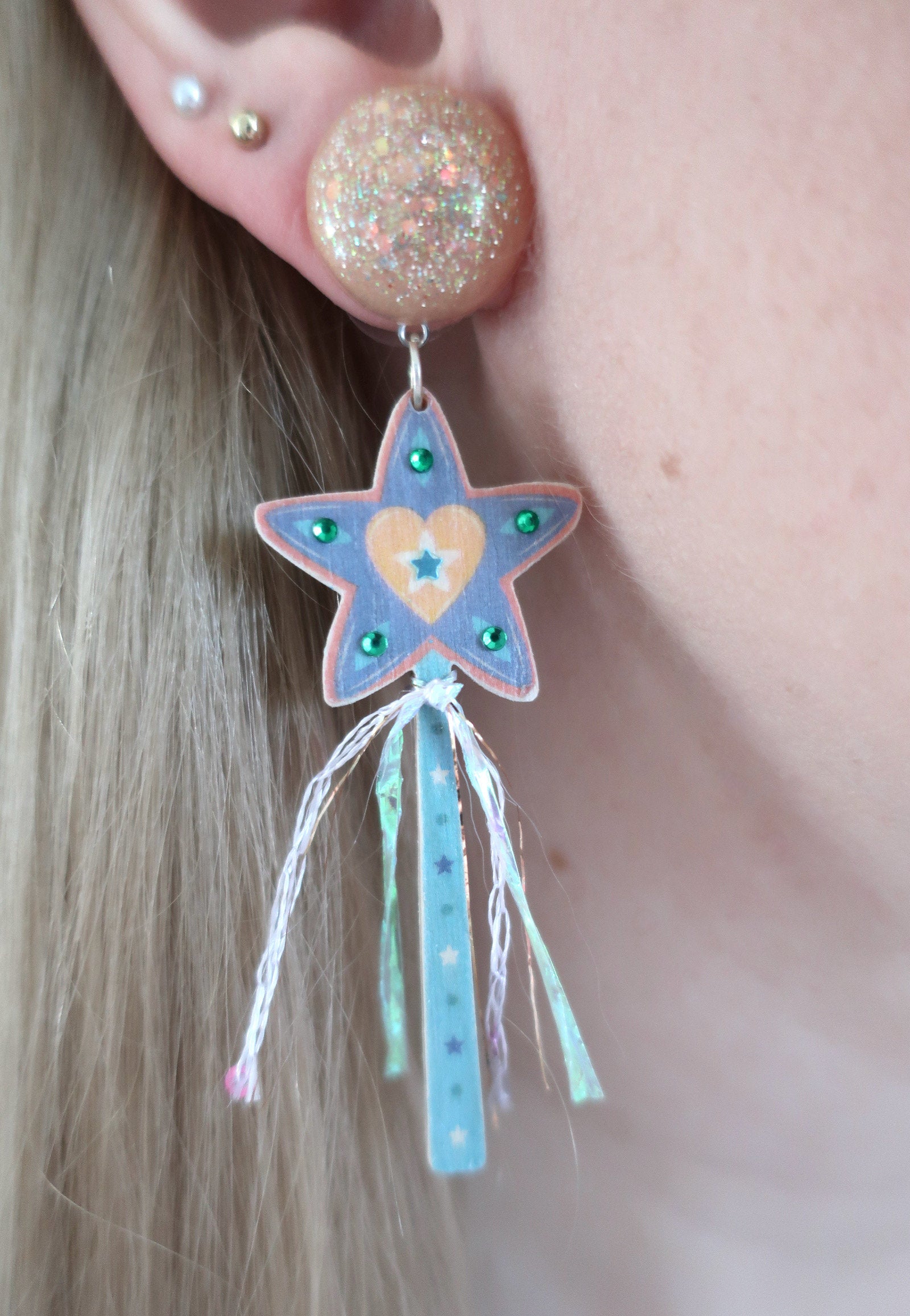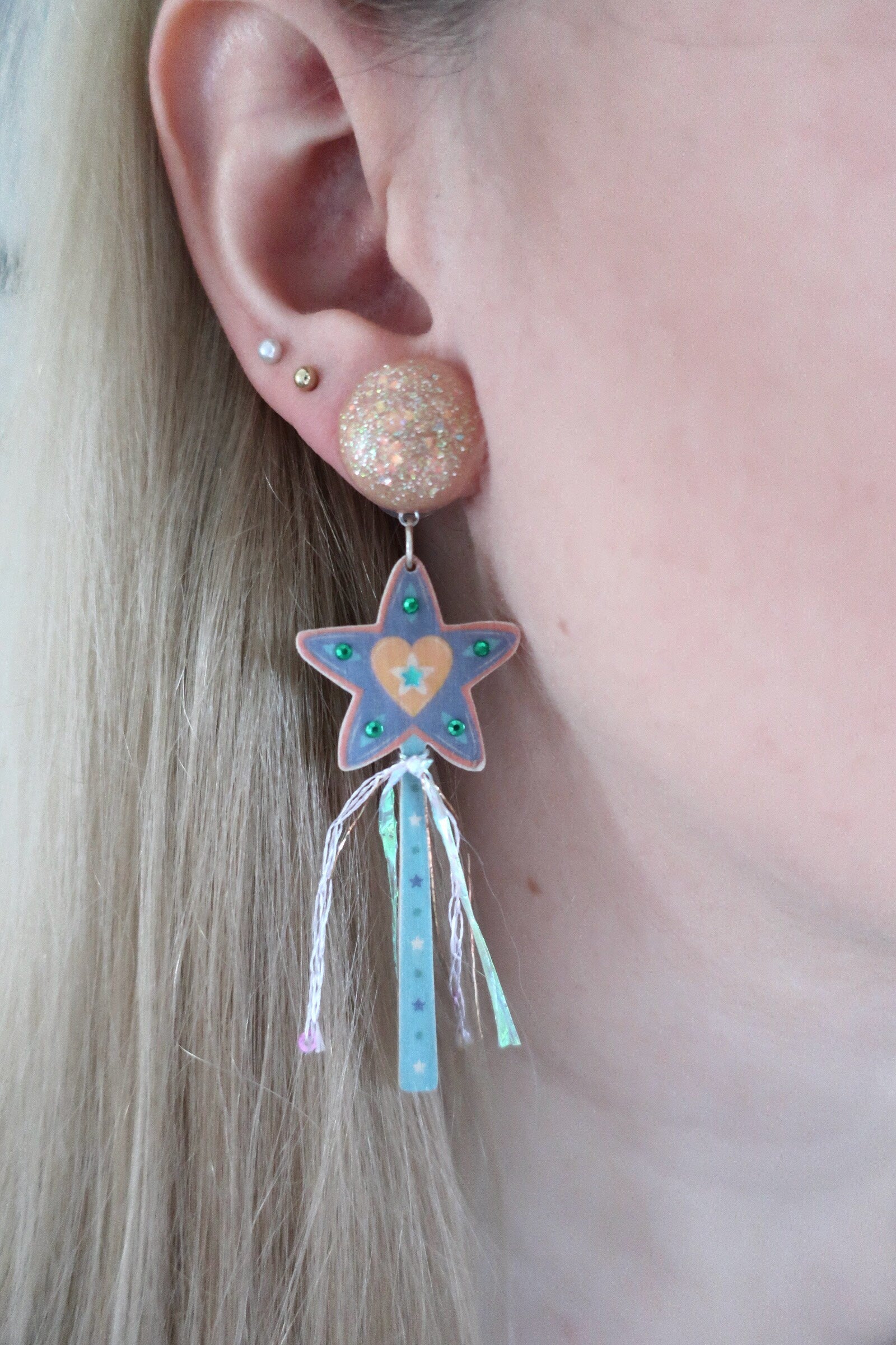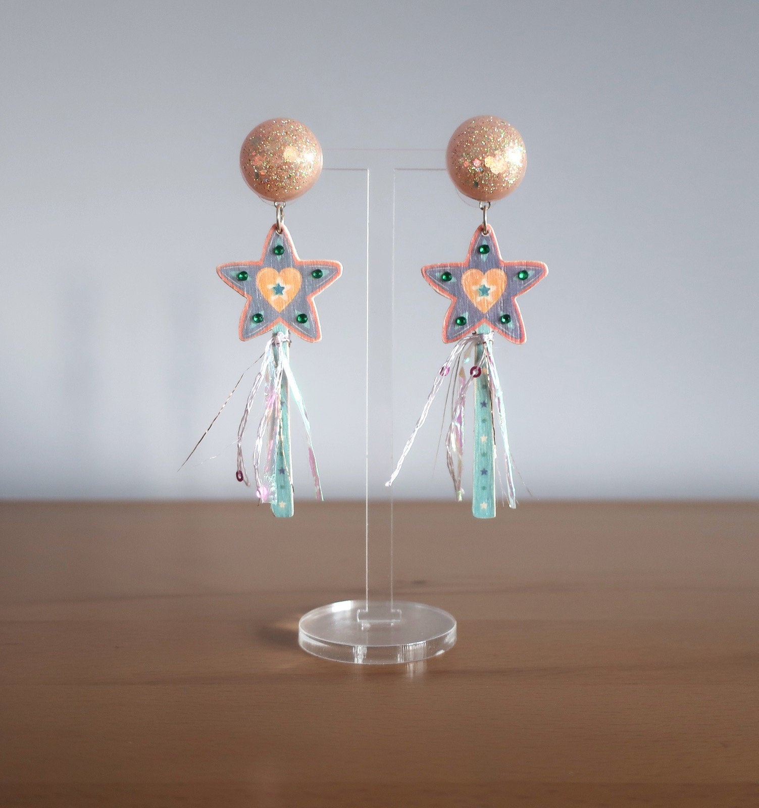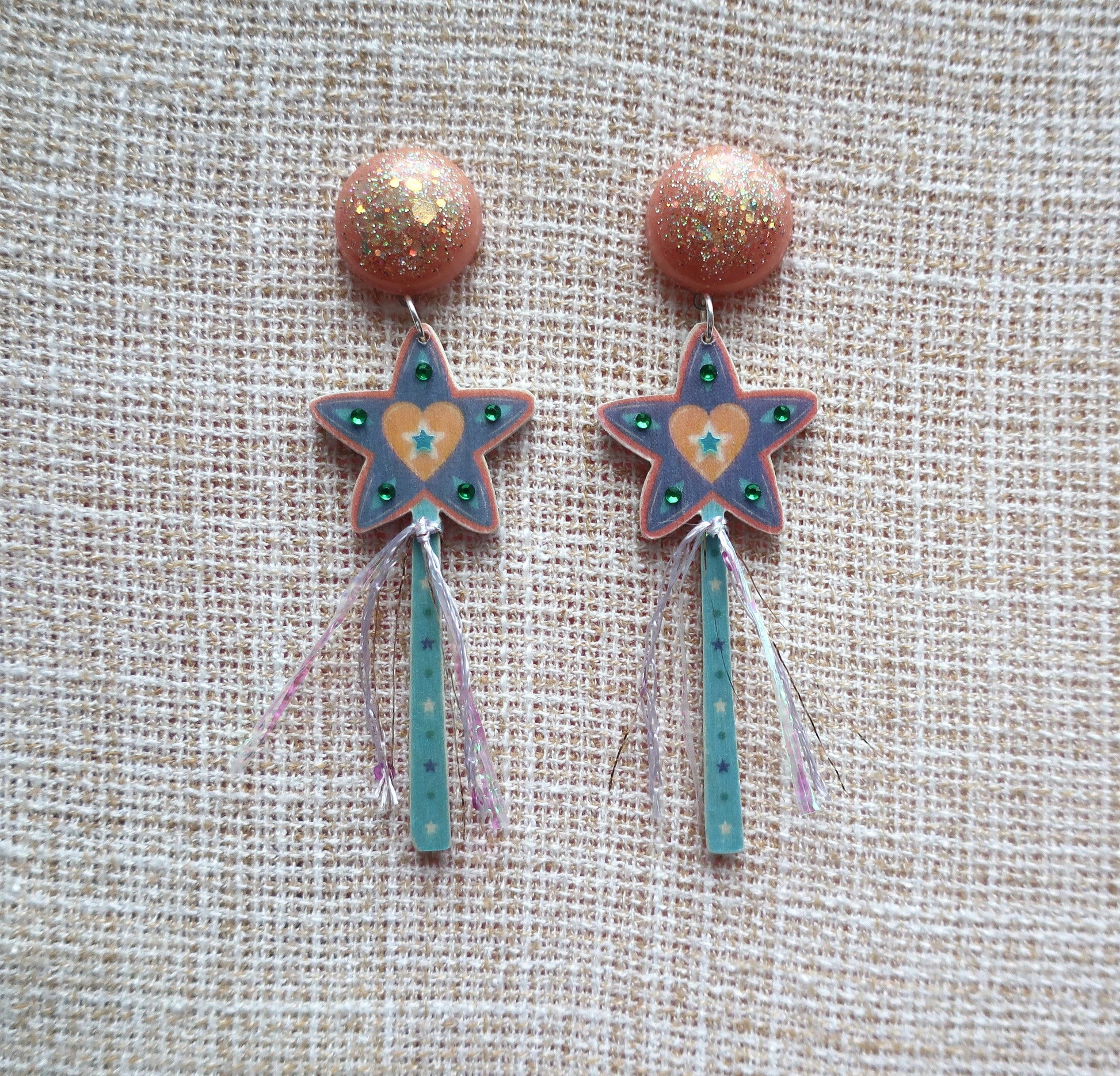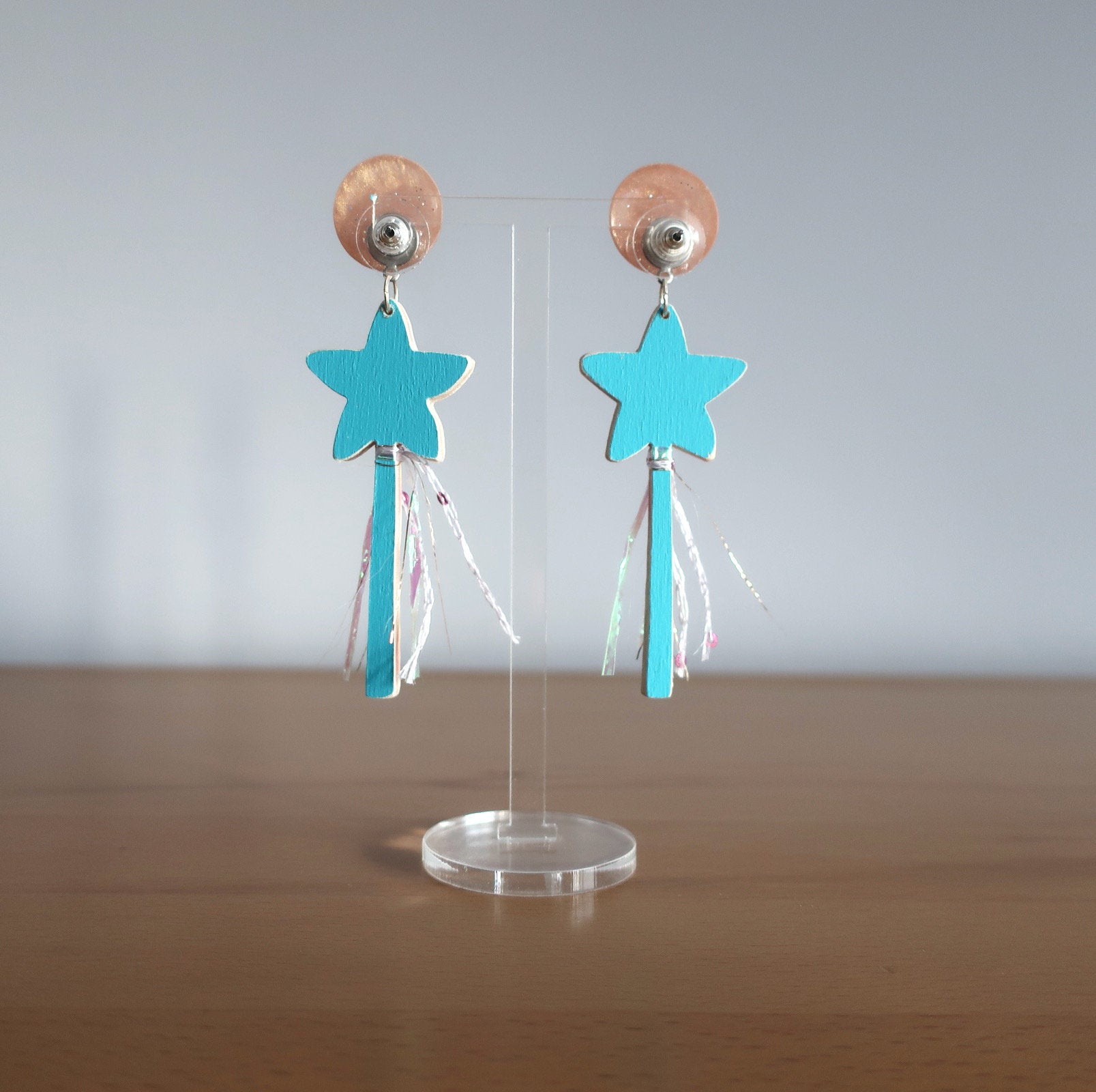 Materialien: Birkensperrholz, Epoxidharz, Glitzer; Plastikfolie, Strass, Edelstahlstecker, Binderinge