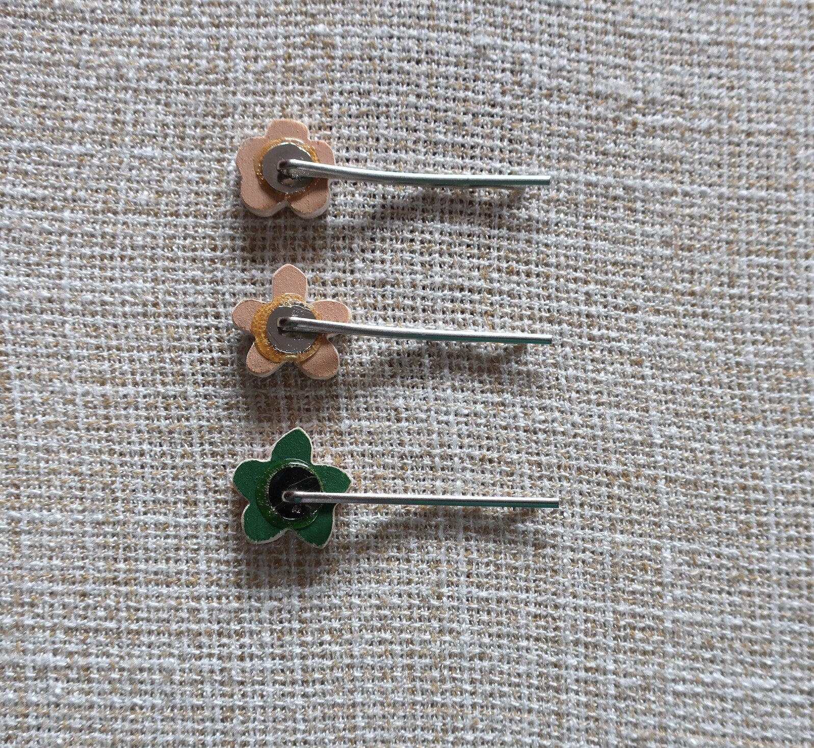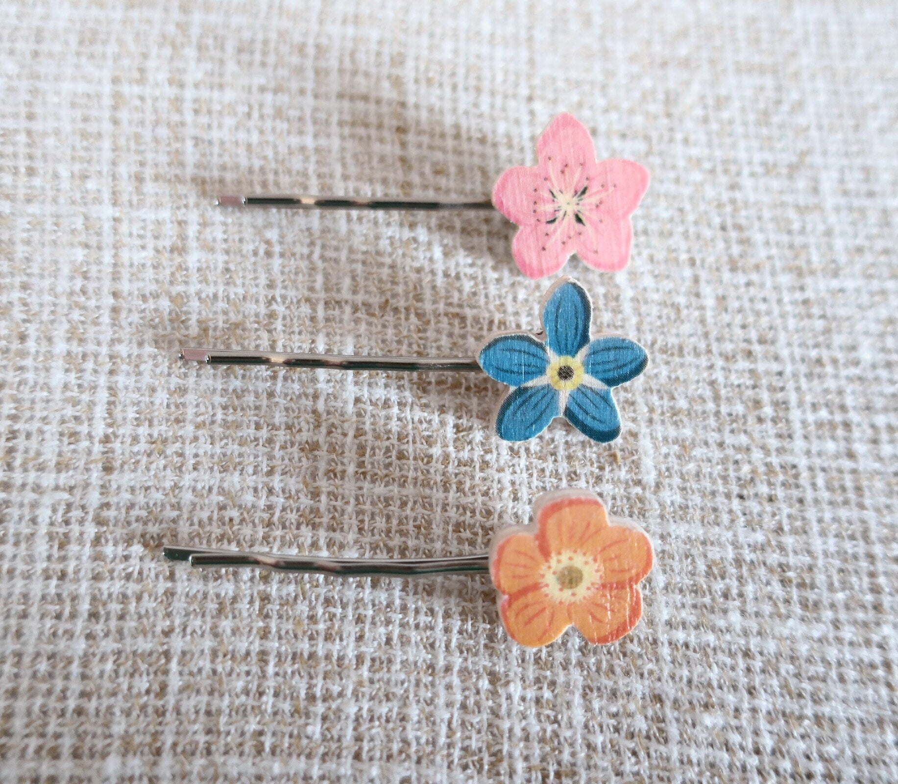 Dies ist ein Set aus 3 silberfarbenen Haarpins mit verschiedenen Blüten aus Birkensperrholz. Die Pins sind ungefähr 5 cm lang.