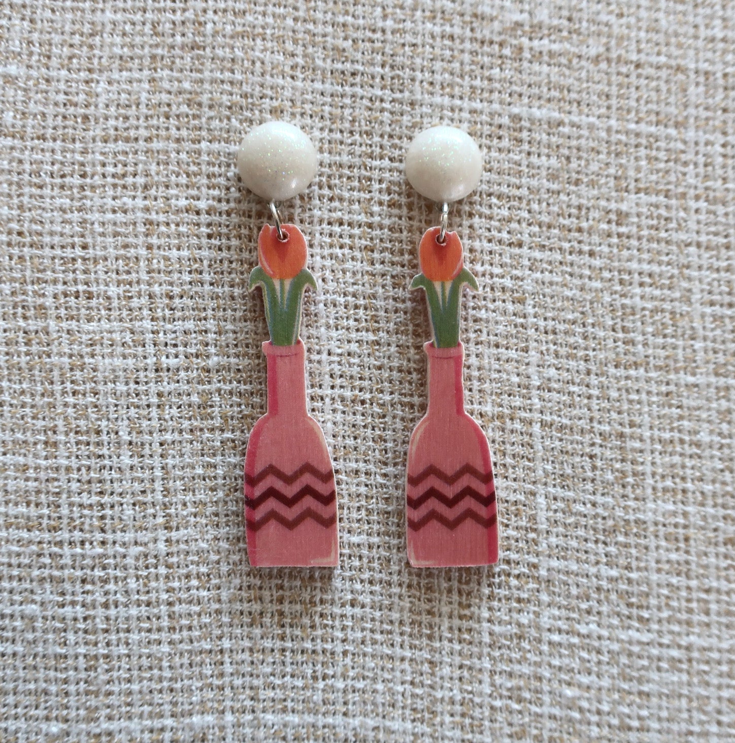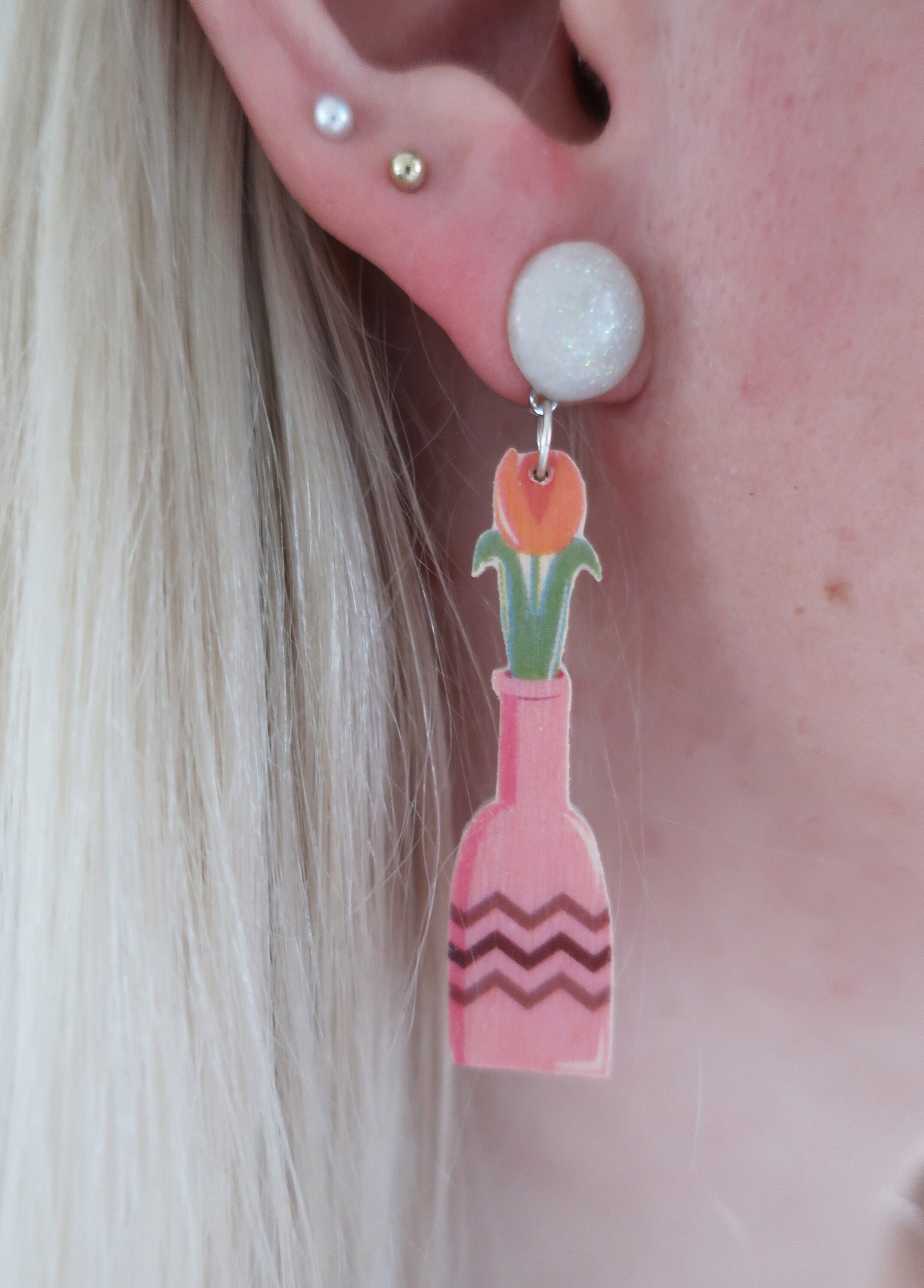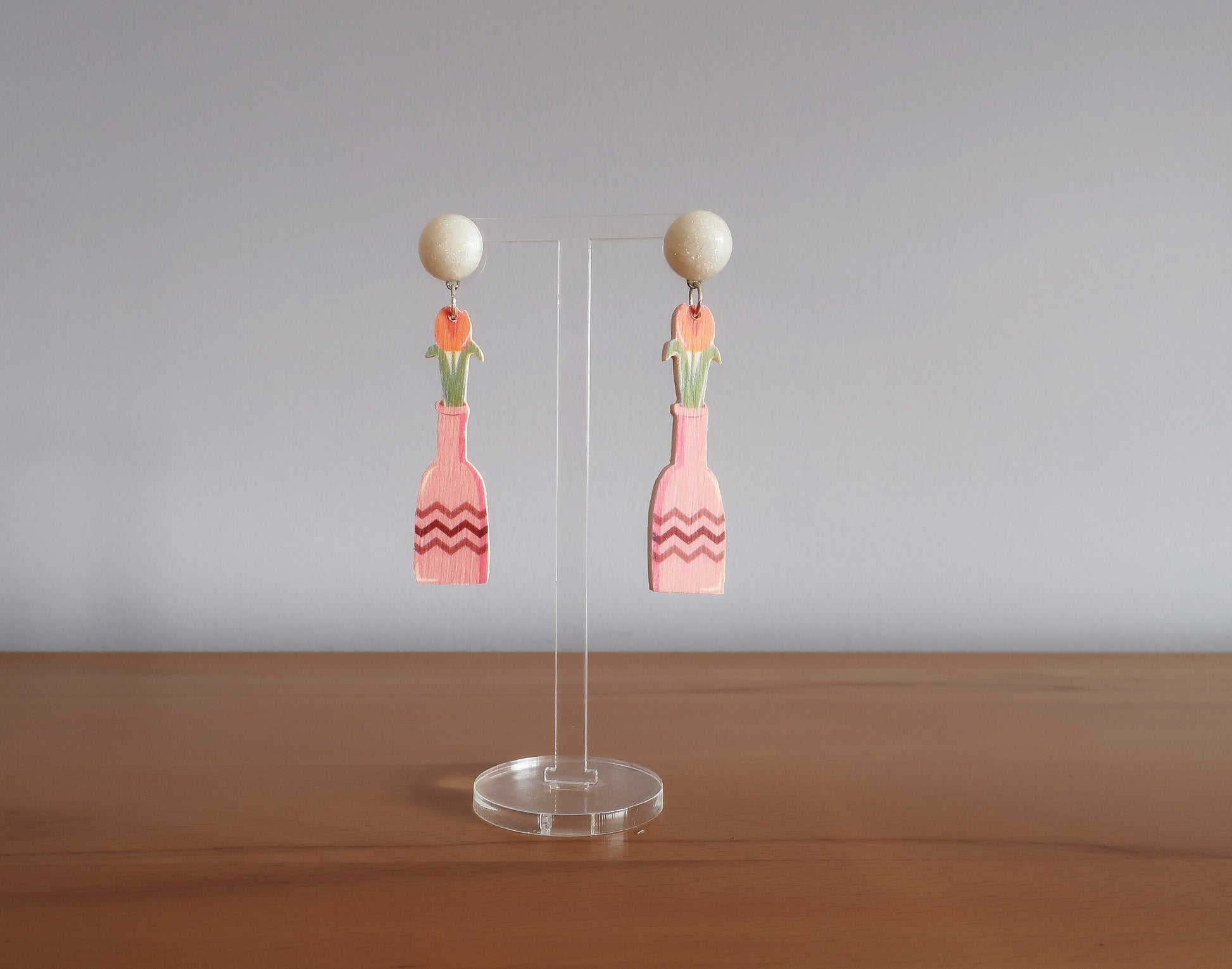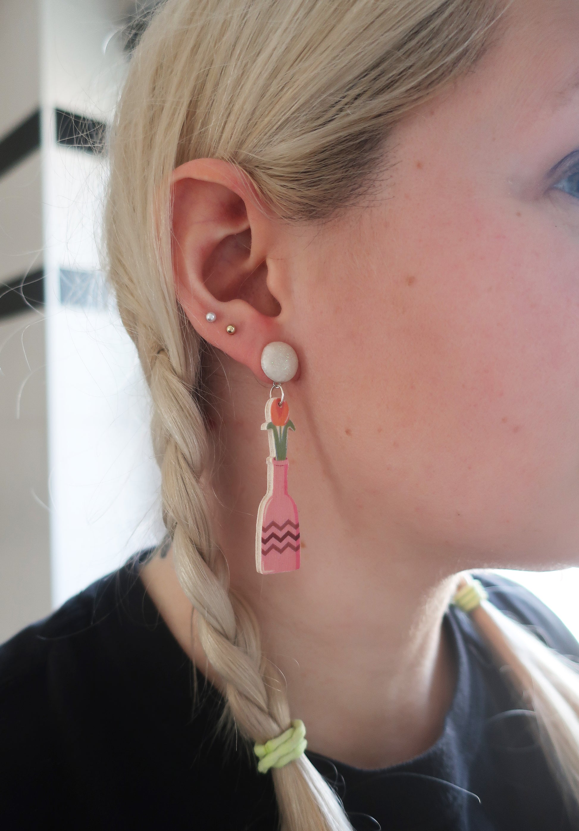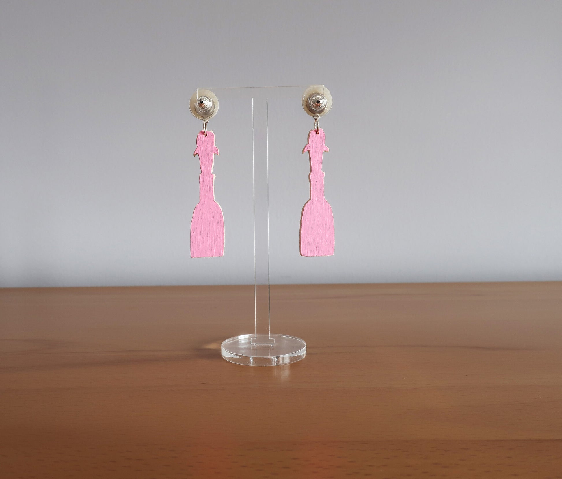 Für diese Ohrringe habe ich eine Zeichnung am Computer erstellt, die ich anschließend manuell auf Birkenholz übertragen und dann mit einer Dekupiersäge ausgesägt habe. Um die Haltbarkeit zu verbessern wurde eine Schicht matter Lack aufgetragen.