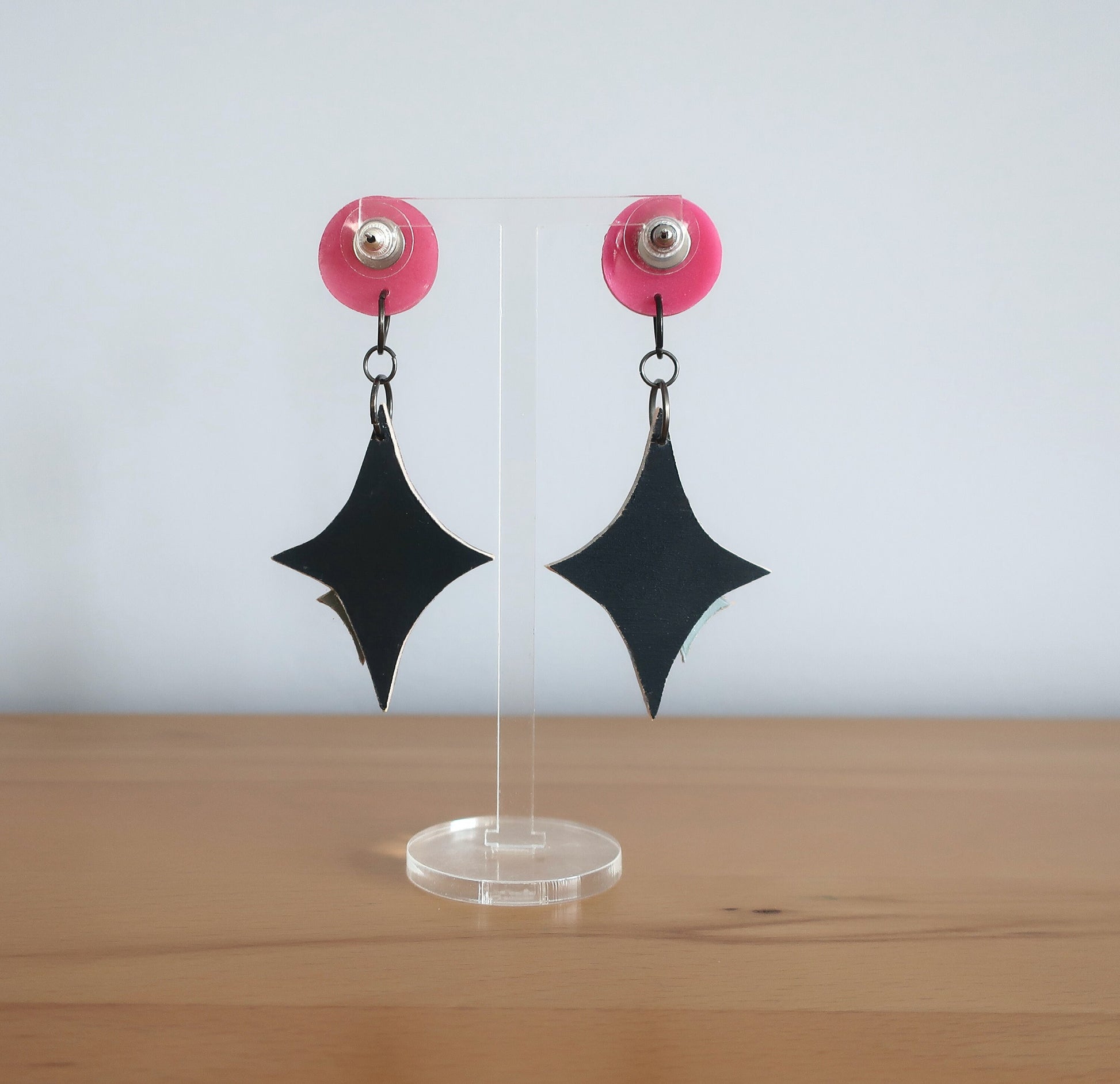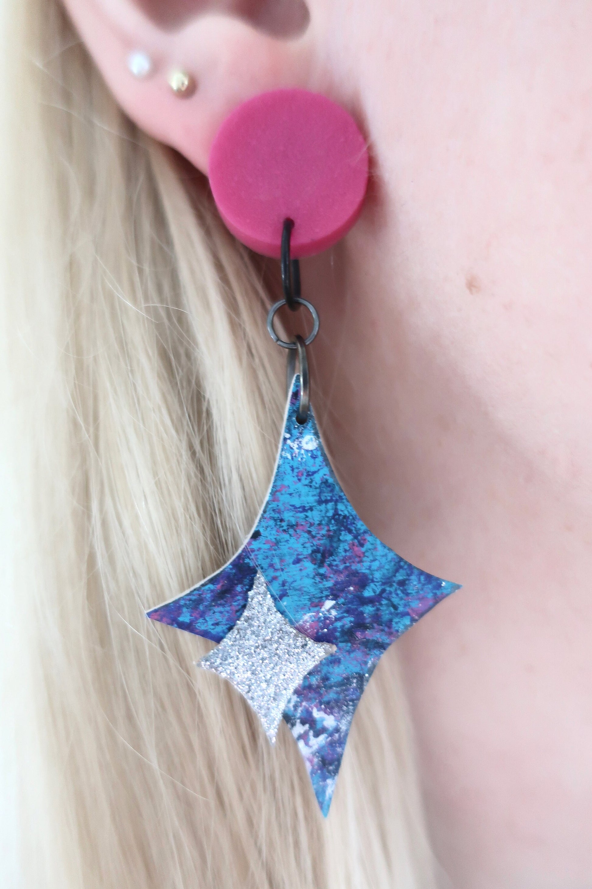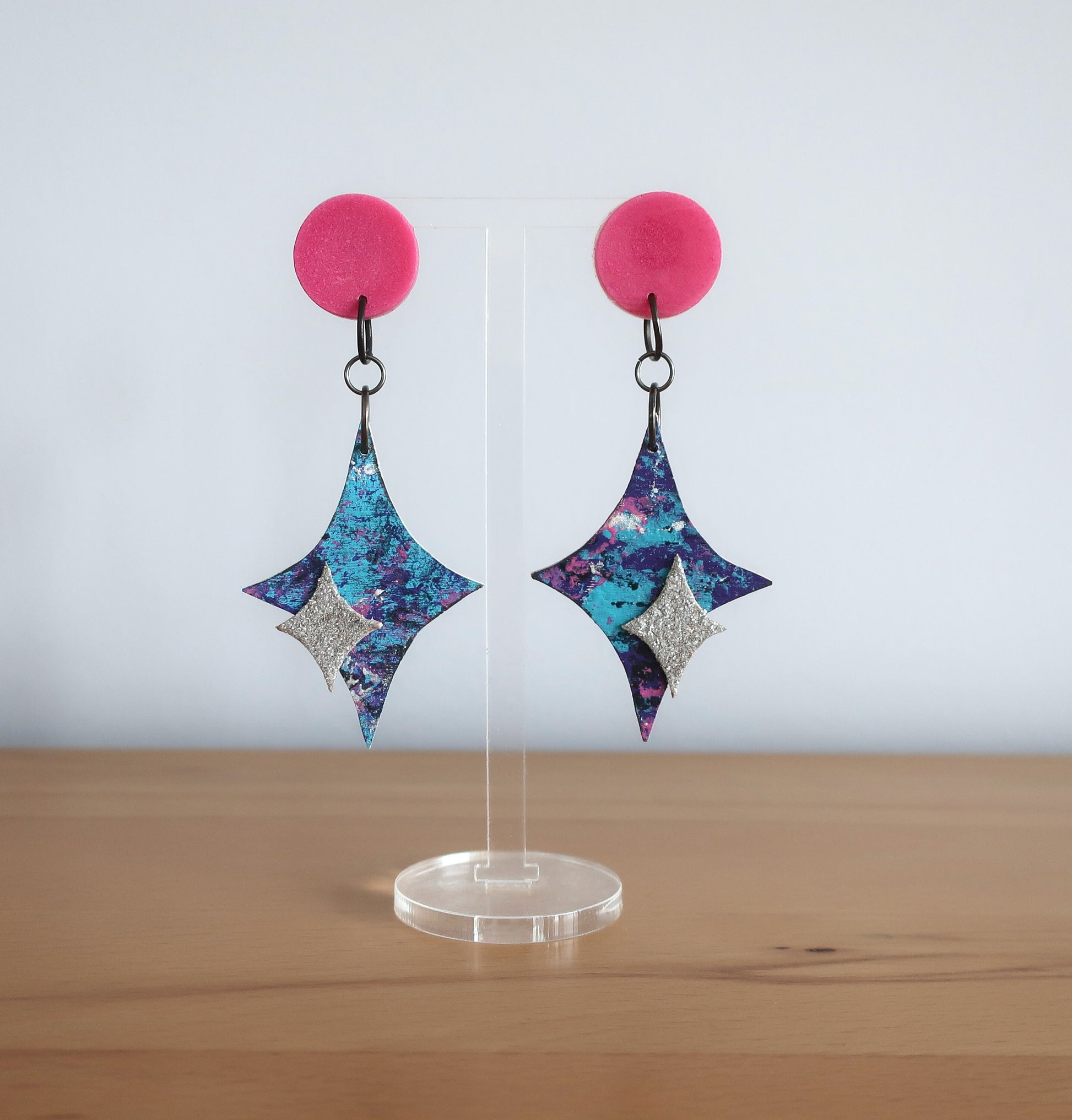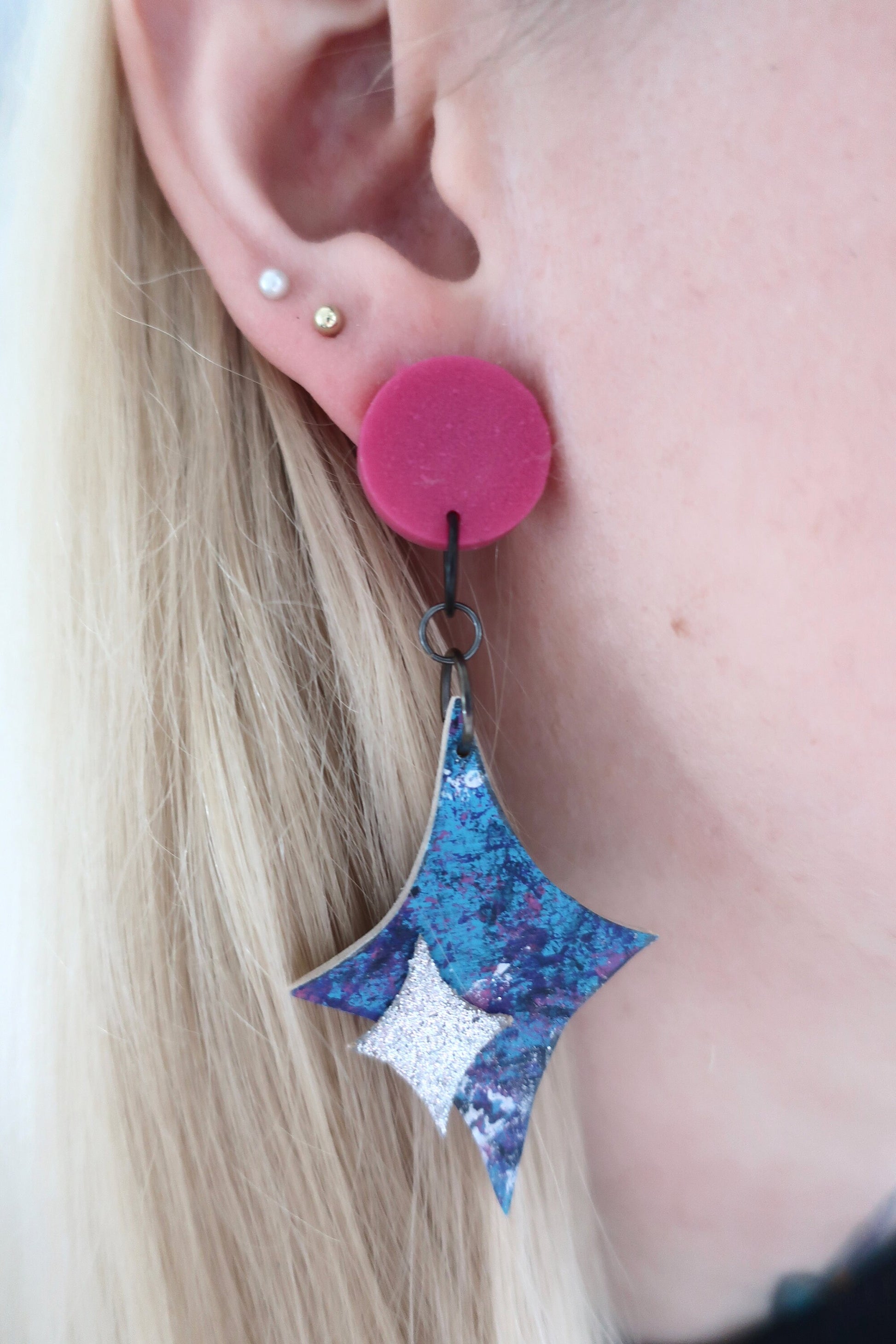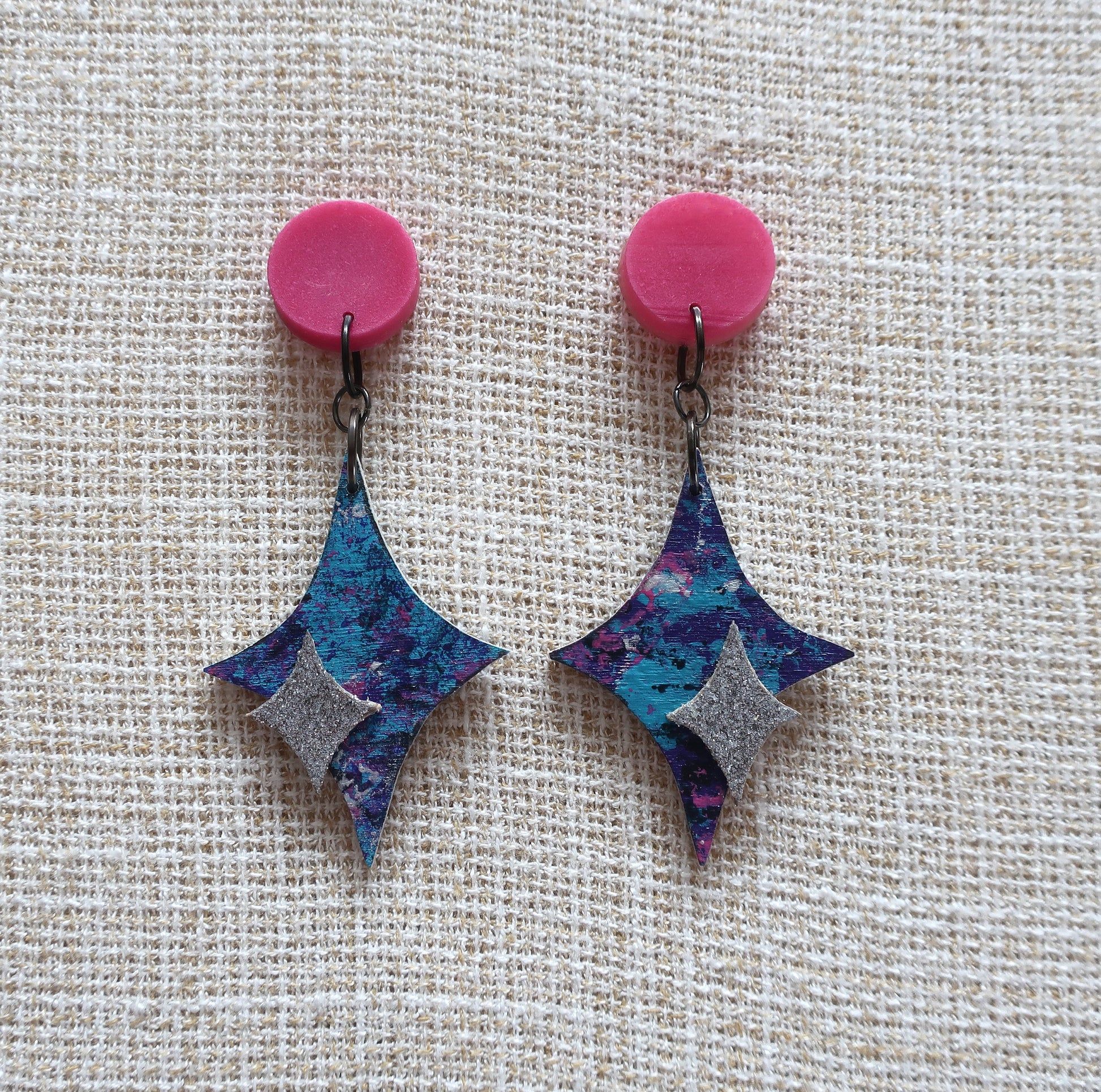 Für diese Ohrringe habe ich eine Zeichnung am Computer erstellt, die ich anschließend manuell auf Birkenholz übertragen und dann mit einer Dekupiersäge ausgesägt habe. Um die Haltbarkeit zu verbessern wurde eine Schicht matter Lack aufgetragen.