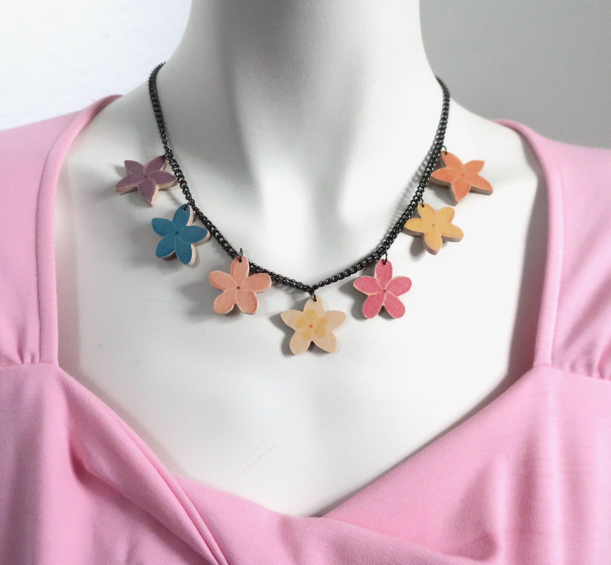 Für die Anänger dieser Kette habe ich Zeichnungen am Computer erstellt, die ich anschließend manuell auf Birkenholz übertragen und dann mit einer Dekupiersäge ausgesägt habe. Um die Haltbarkeit zu verbessern wurde eine Schicht matter Lack aufgetragen.