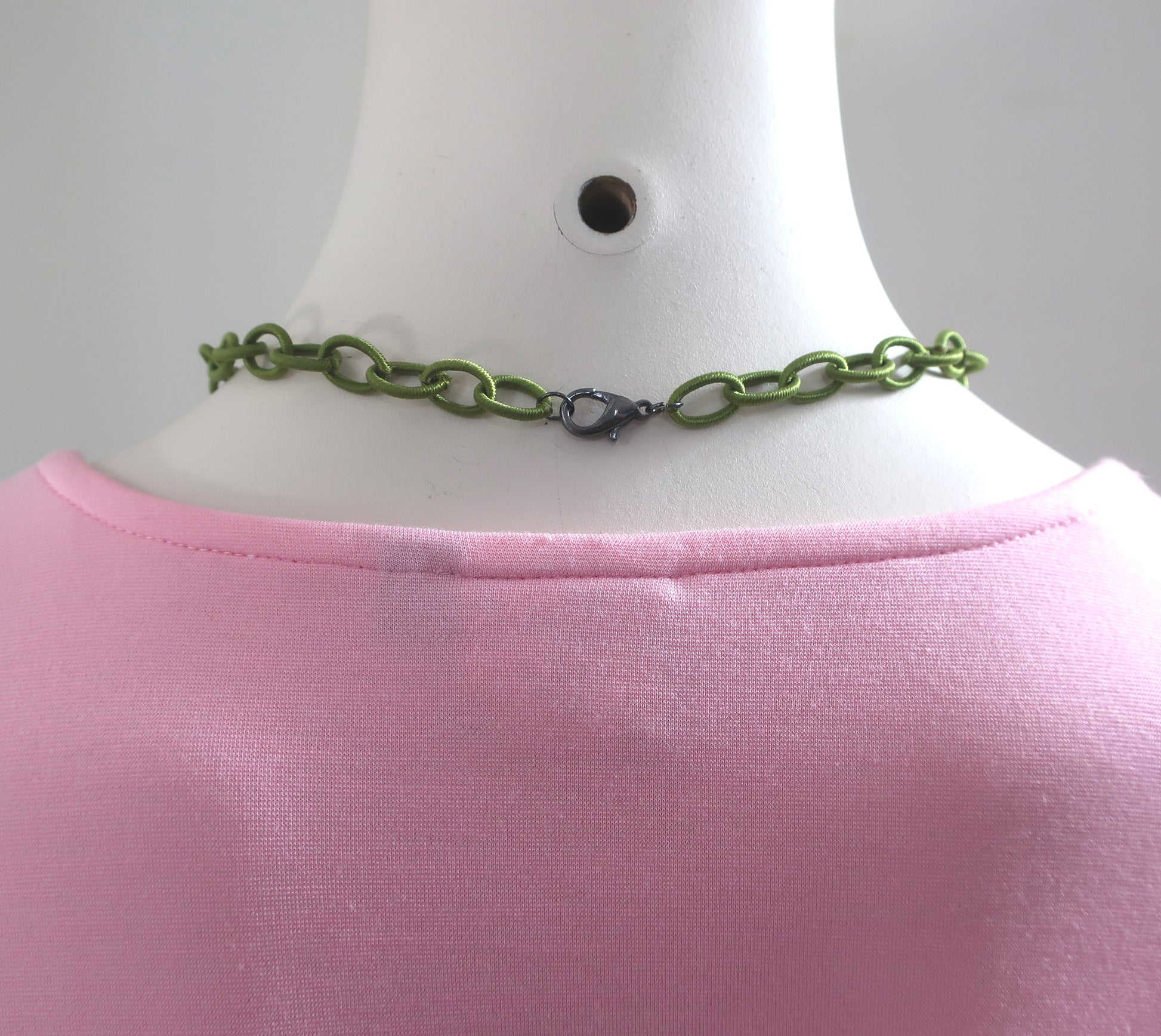 Die grüne Textilkette ist ungefähr 40 cm lang und hat einen Karabinerverschluss. Die komplette Kettenlänge (mitsamt Verschluss) beträgt ungefähr 42 cm.