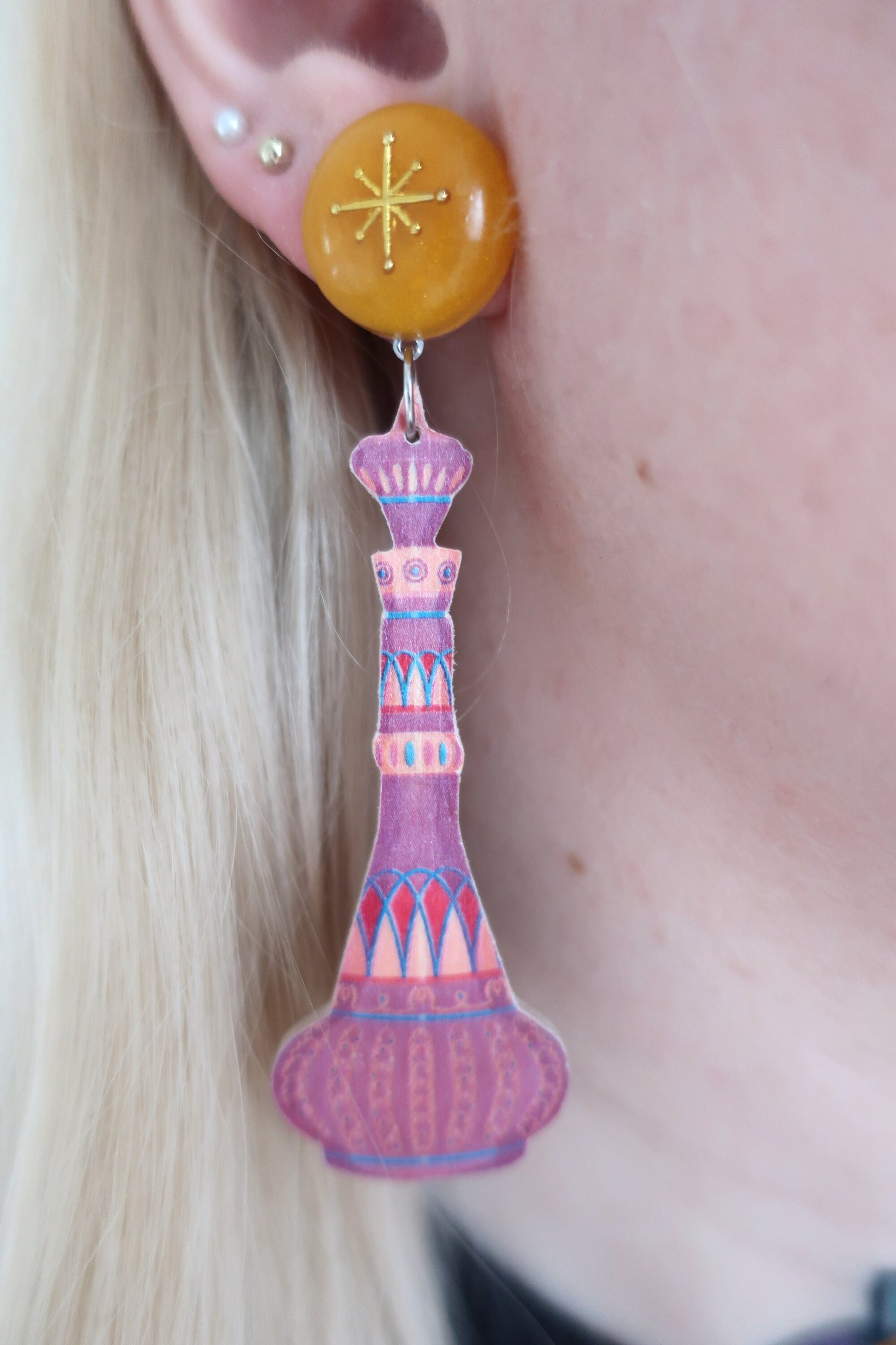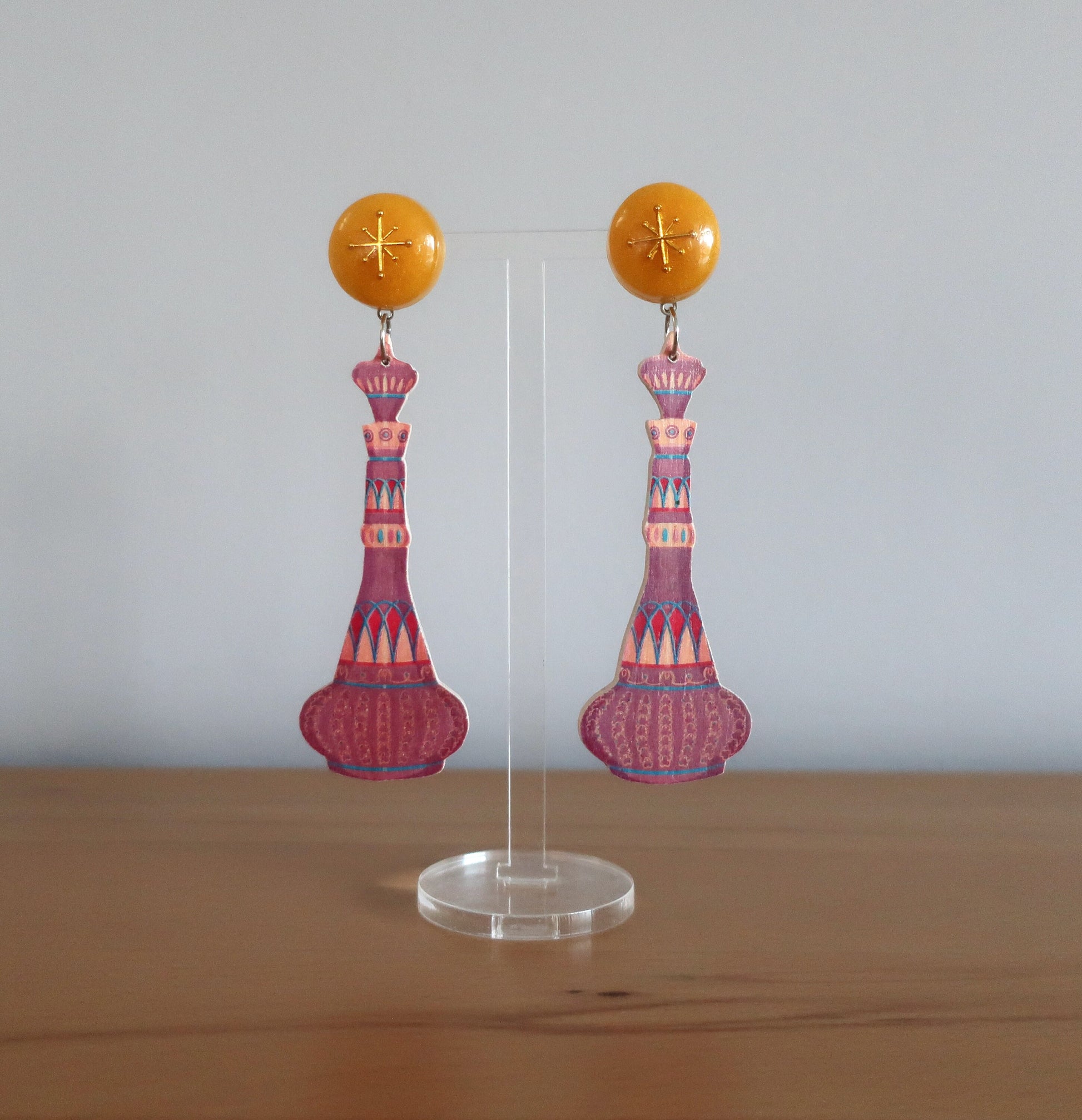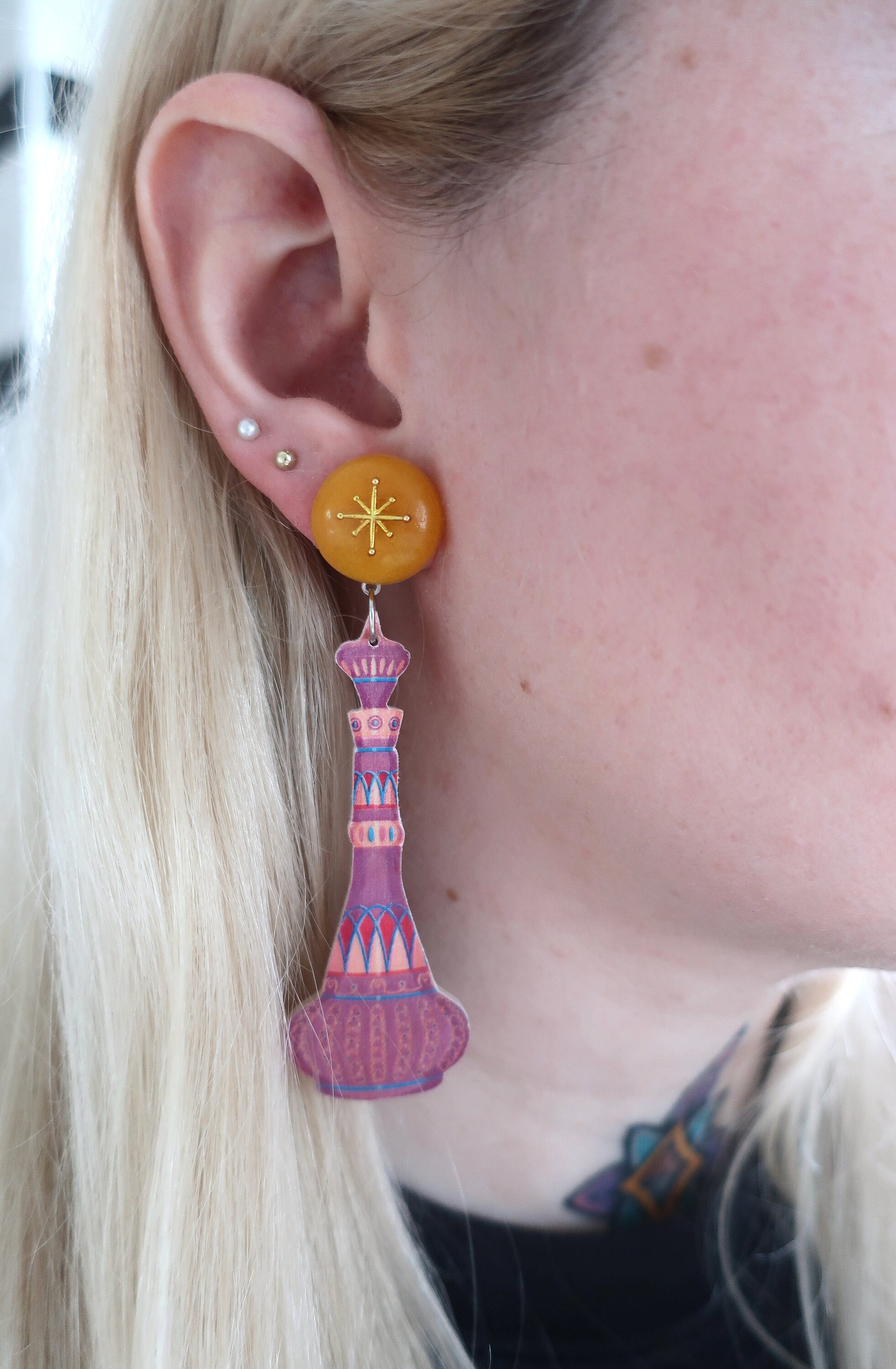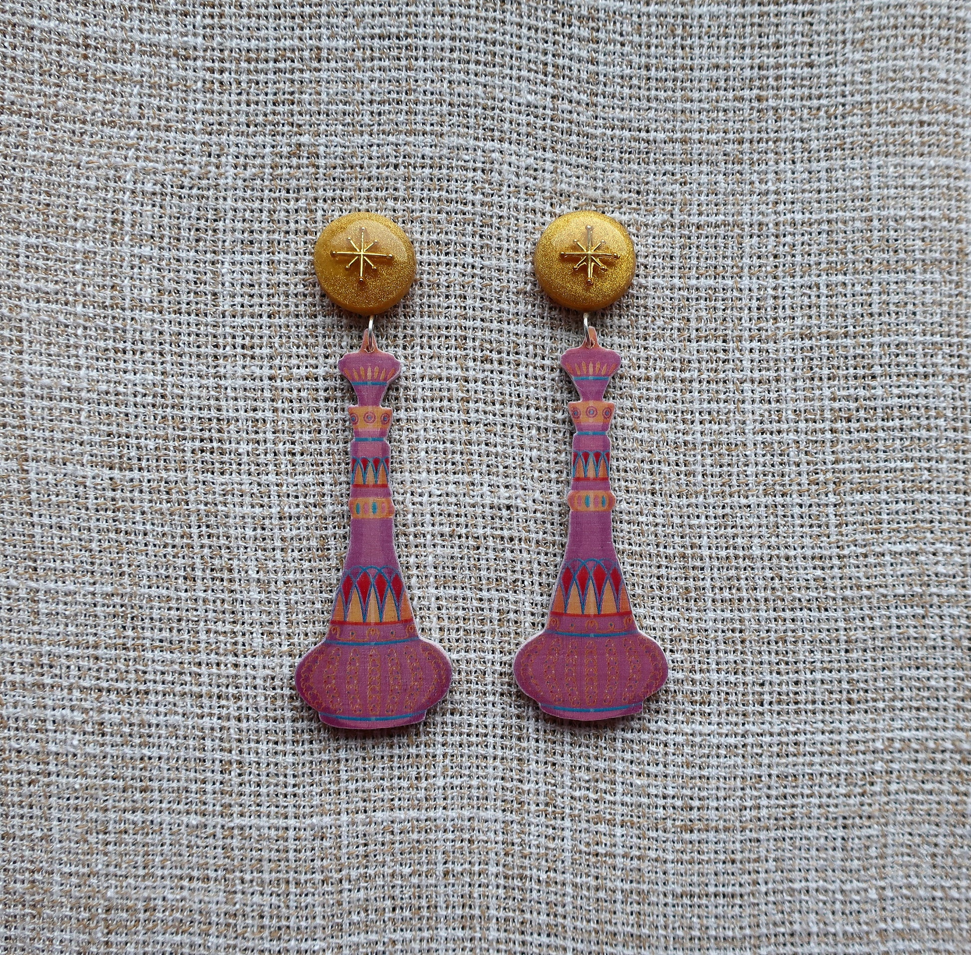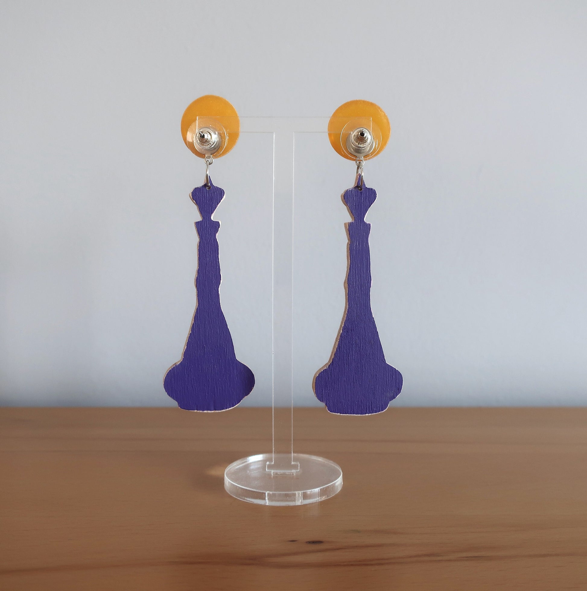 Für diese Ohrringe habe ich eine Zeichnung am Computer erstellt, die ich anschließend manuell auf Birkenholz übertragen und dann mit einer Dekupiersäge ausgesägt habe. Um die Haltbarkeit zu verbessern wurde eine Schicht matter Lack aufgetragen.