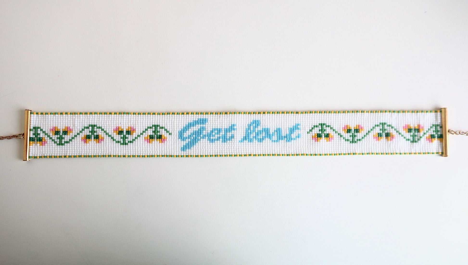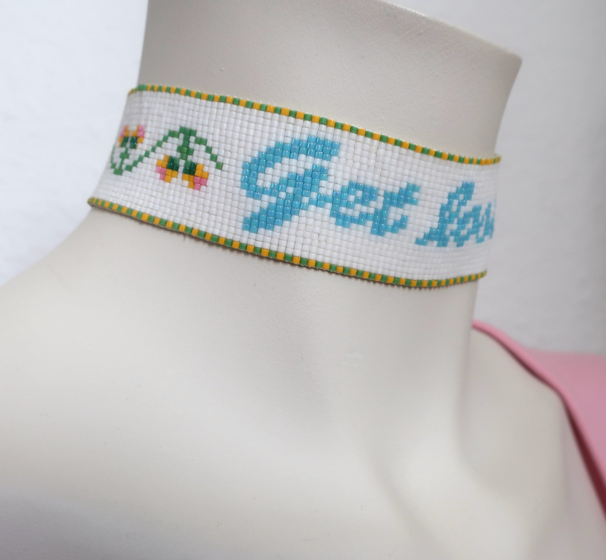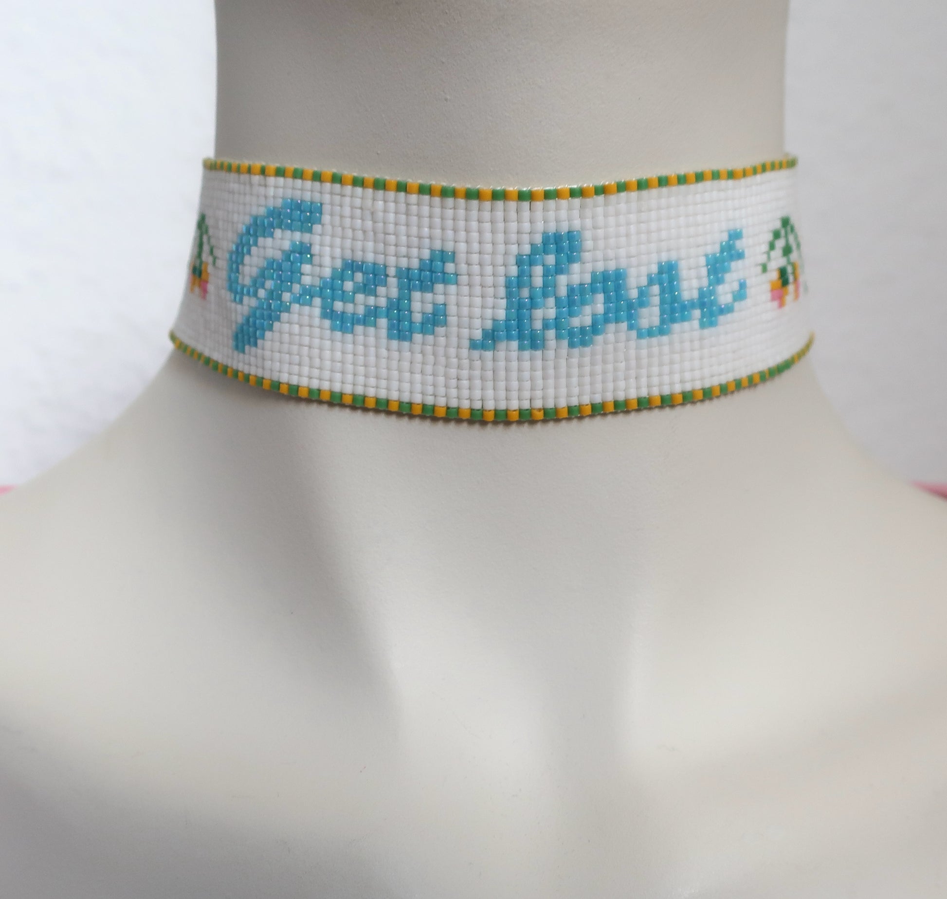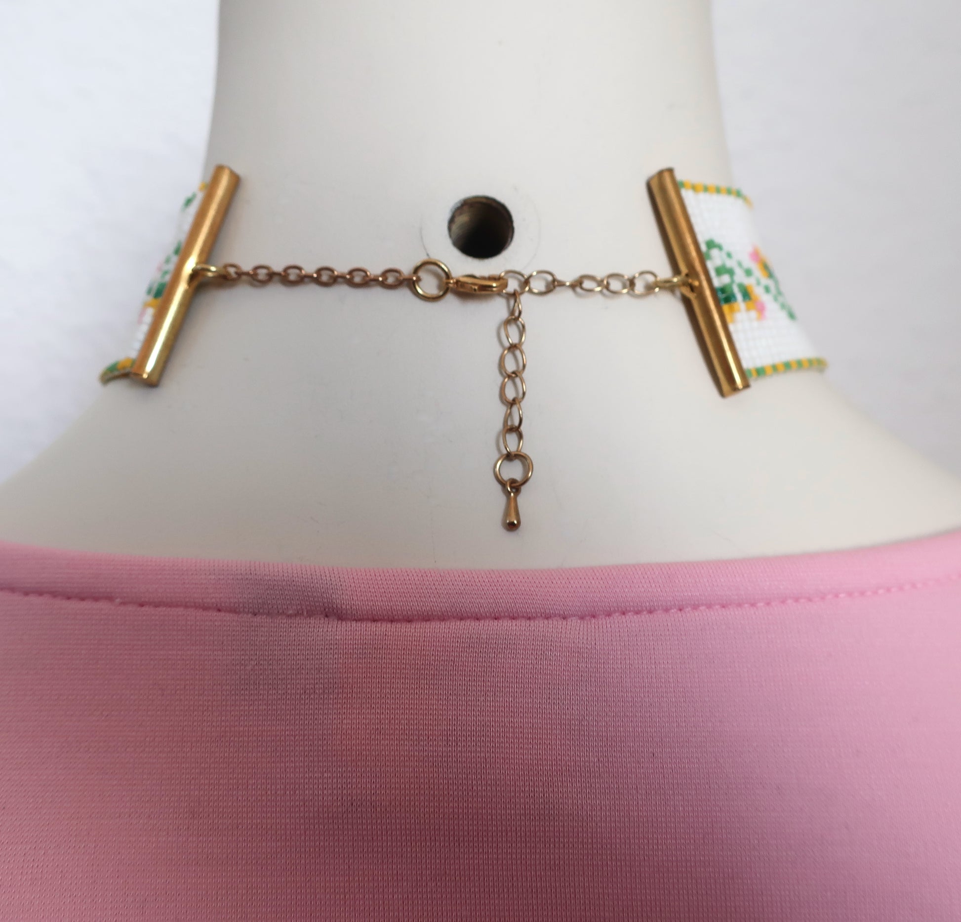 Dies ist ein handgewebter Choker mit hochwertigen japanischen Miyuki-Perlen. Er hat goldfarbene Röhrenenden, ein Kettchen mit Karabinerhaken als Verschluss und eine 5,5 cm lange Verlängerungskette. Es ist 3,1 cm breit.