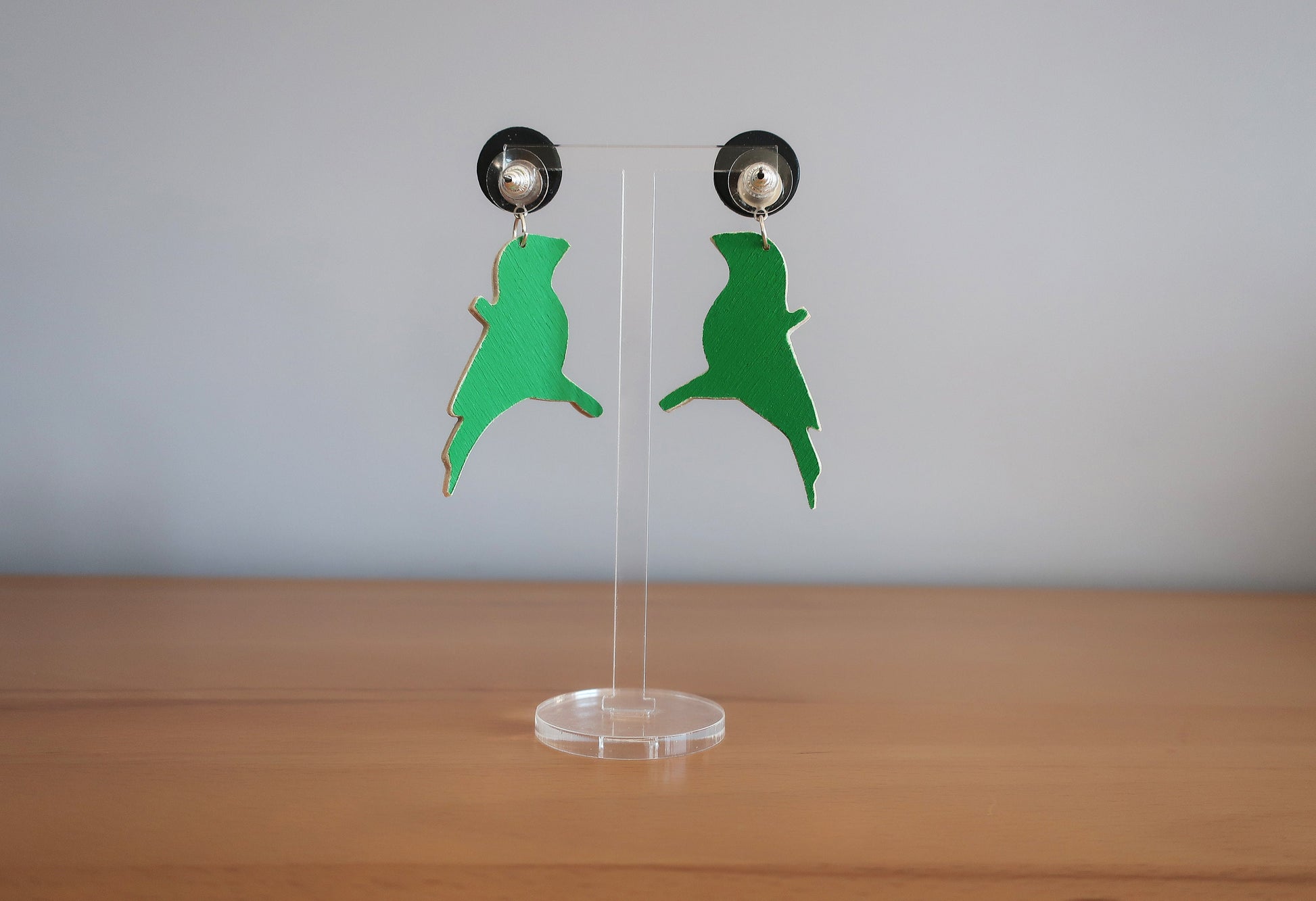 Für diese Ohrringe habe ich eine Zeichnung am Computer erstellt, die ich anschließend manuell auf Birkenholz übertragen und dann mit einer Dekupiersäge ausgesägt habe. Um die Haltbarkeit zu verbessern wurde eine Schicht matter Lack aufgetragen.