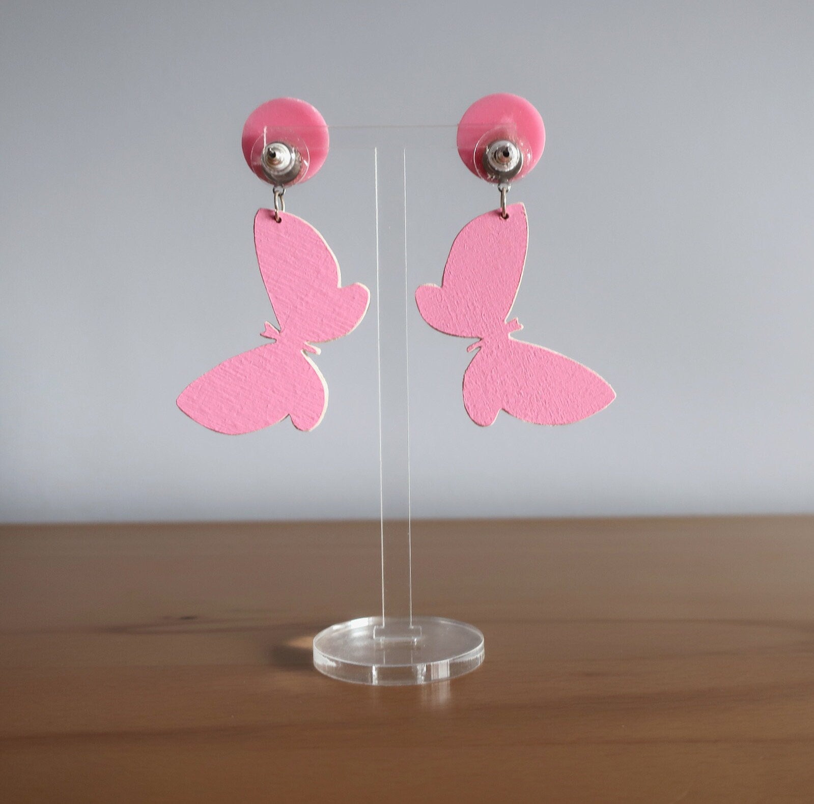 Für diese Ohrringe habe ich eine Zeichnung am Computer erstellt, die ich anschließend manuell auf Birkenholz übertragen und dann mit einer Dekupiersäge ausgesägt habe. Um die Haltbarkeit zu verbessern wurde eine Schicht matter Lack aufgetragen.