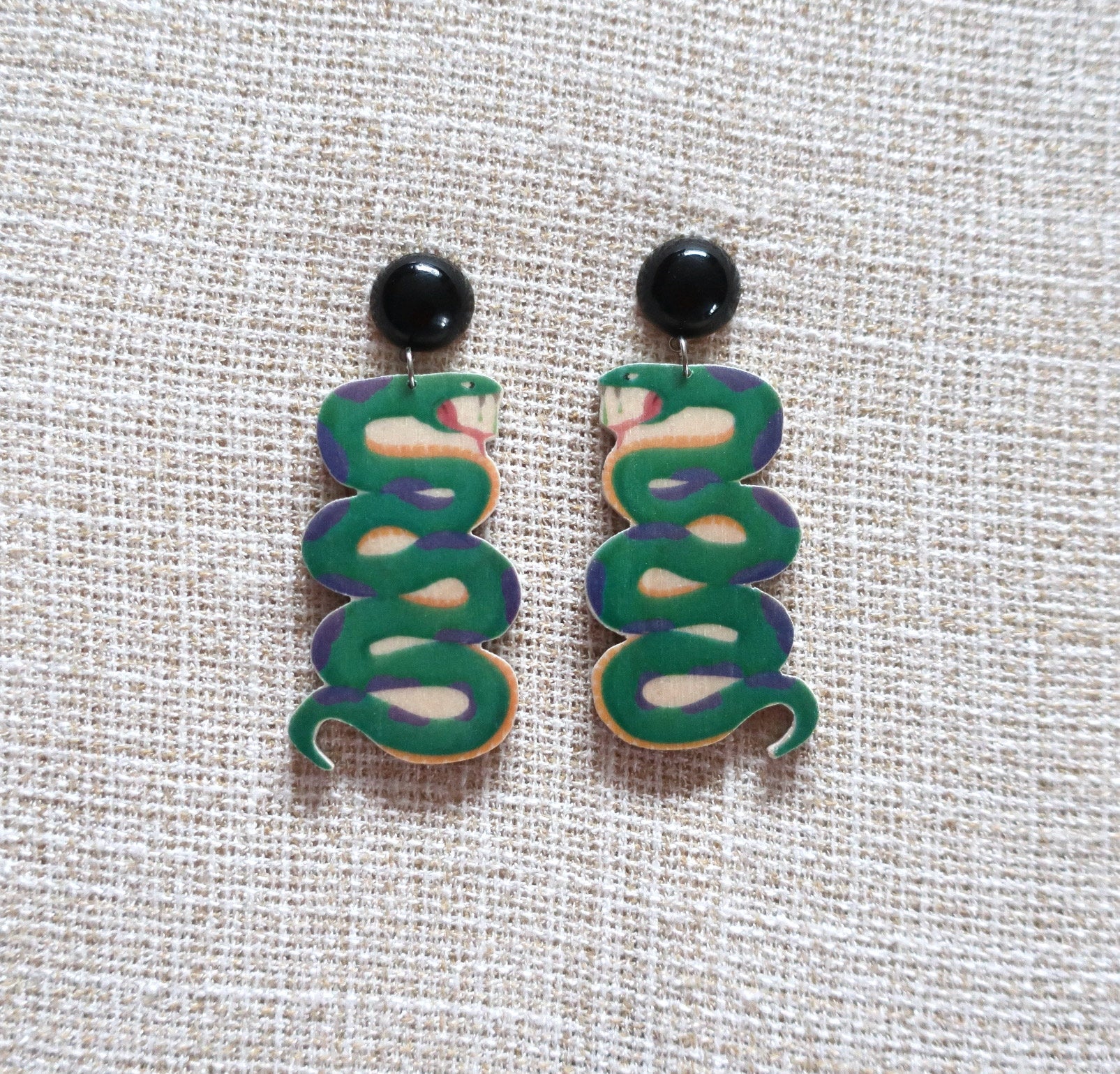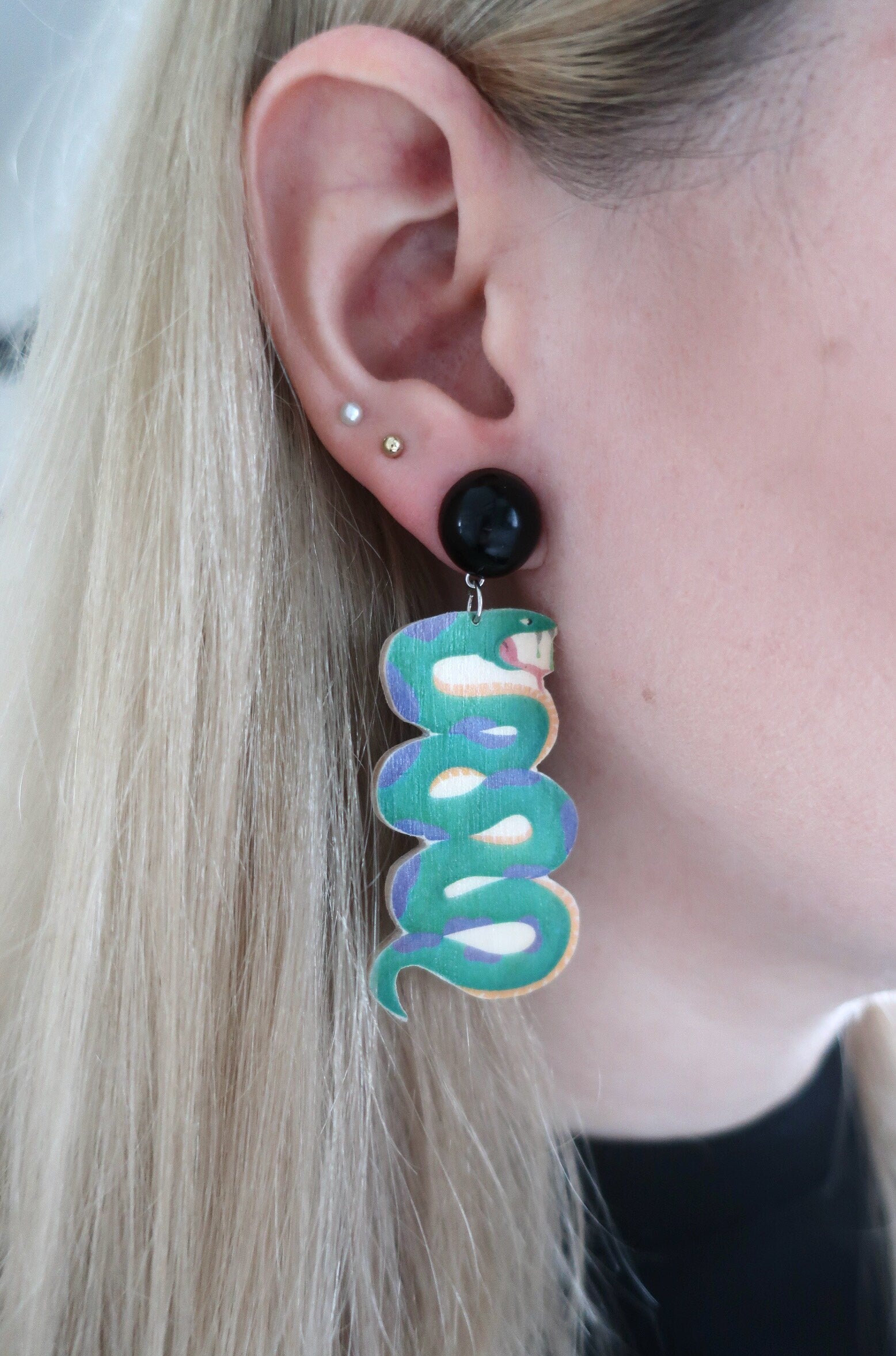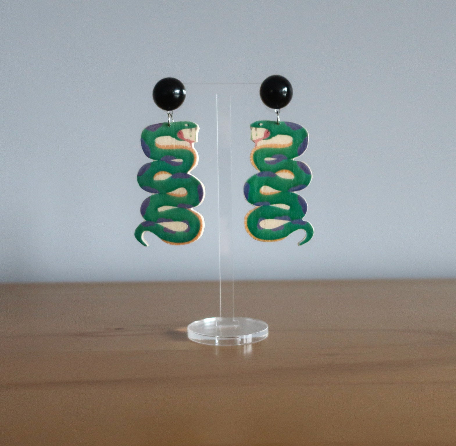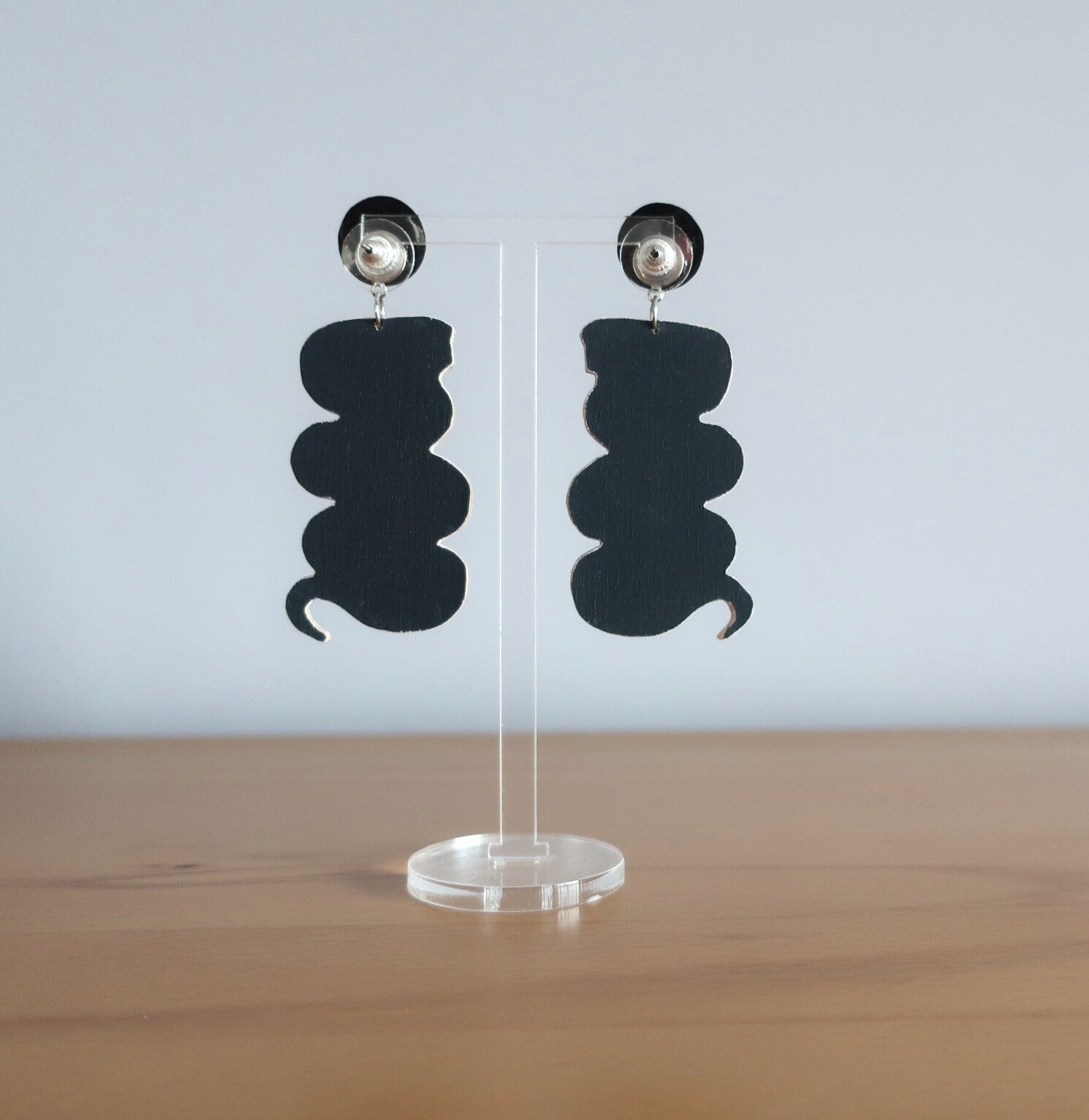 Für diese Ohrringe habe ich eine Zeichnung am Computer erstellt, die ich anschließend manuell auf Birkenholz übertragen und dann mit einer Dekupiersäge ausgesägt habe. Um die Haltbarkeit zu verbessern wurde eine Schicht matter Lack aufgetragen.