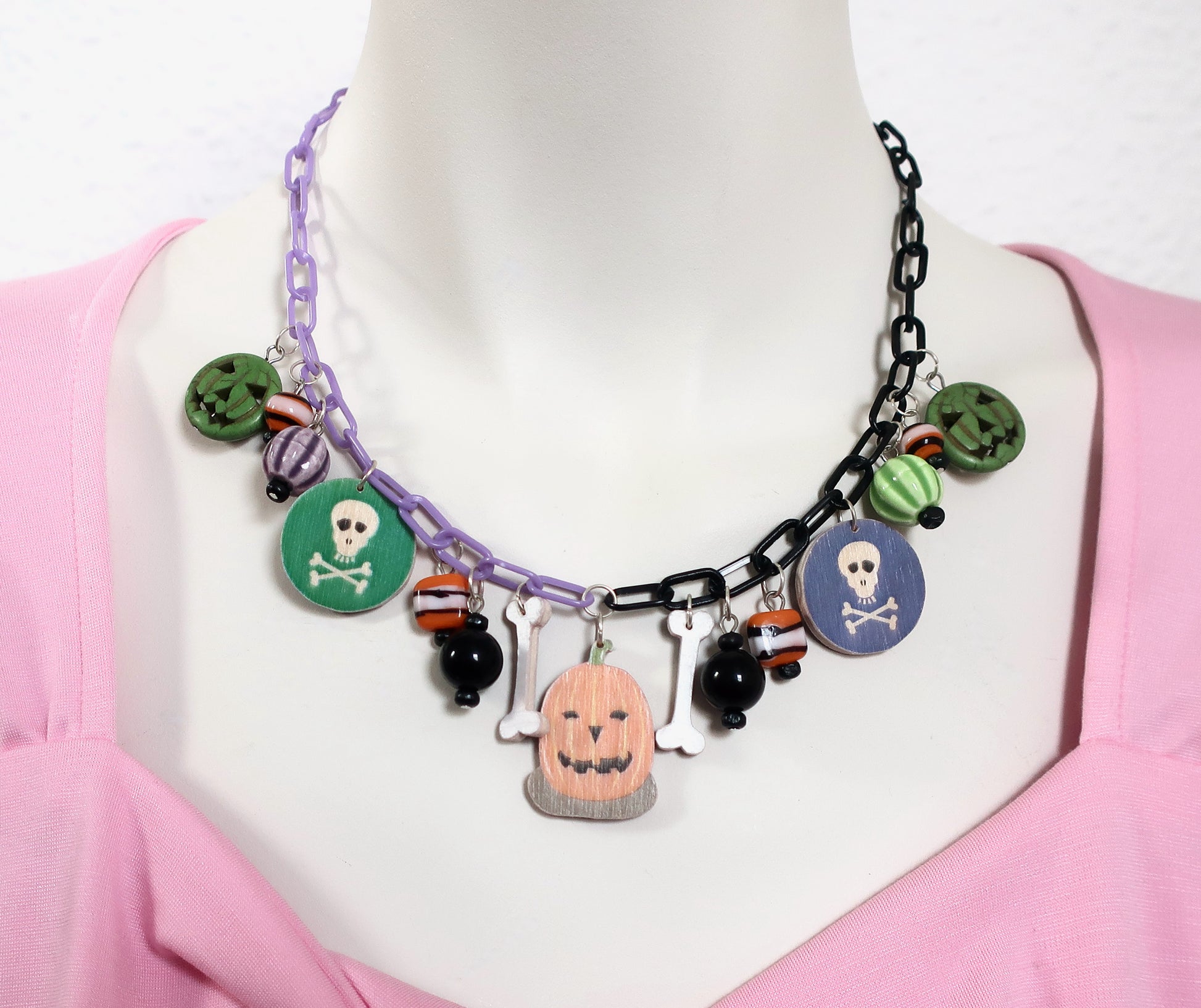 Für die Anänger dieser Kette habe ich Zeichnungen am Computer erstellt, die ich anschließend manuell auf Birkenholz übertragen und dann mit einer Dekupiersäge ausgesägt habe. Um die Haltbarkeit zu verbessern wurde eine Schicht matter Lack aufgetragen. Die handgemachten Anhänger und einige halloweenmäßige Glasperlen wurden dann an einer Plastikkette befestigt.