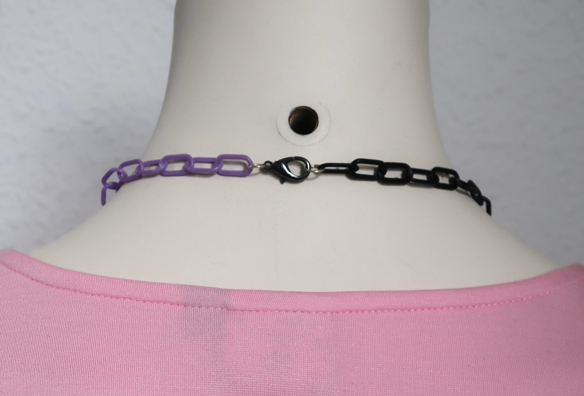 Die Plastikkette ist ungefähr 43,2 cm lang und hat einen Karabinerverschluss. Die gesamte Kettenlänge (mitsamt Verschluss) beträgt ungefähr 45,5 cm.