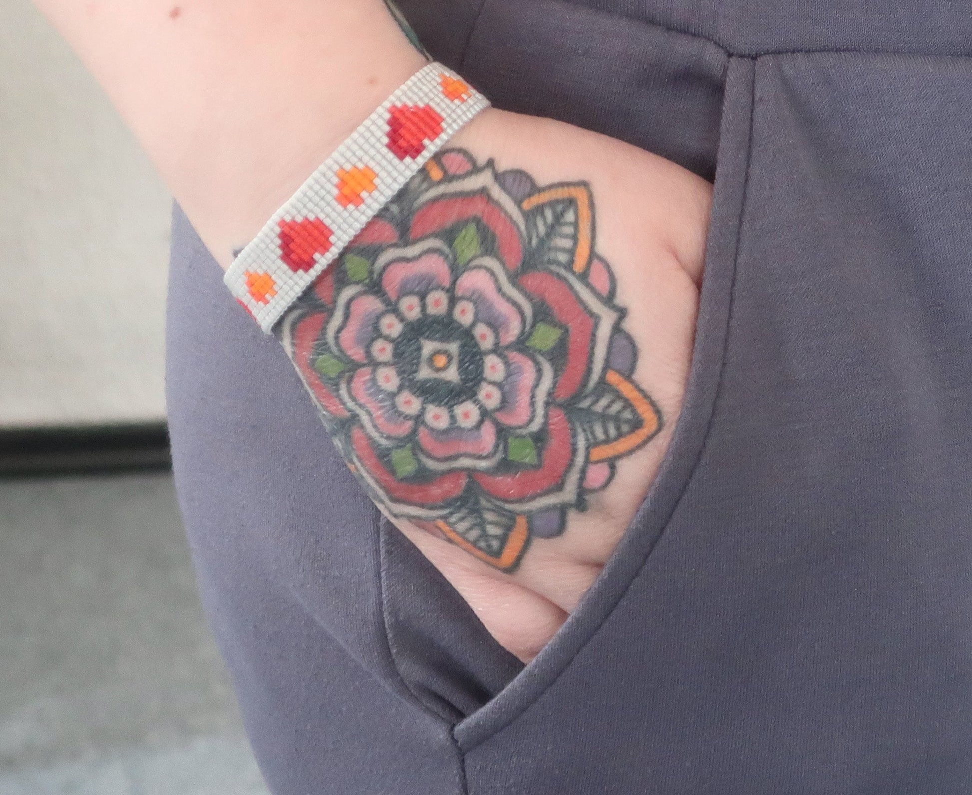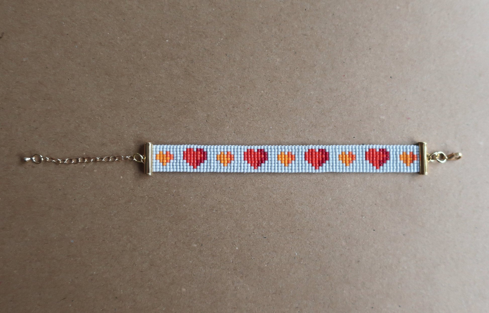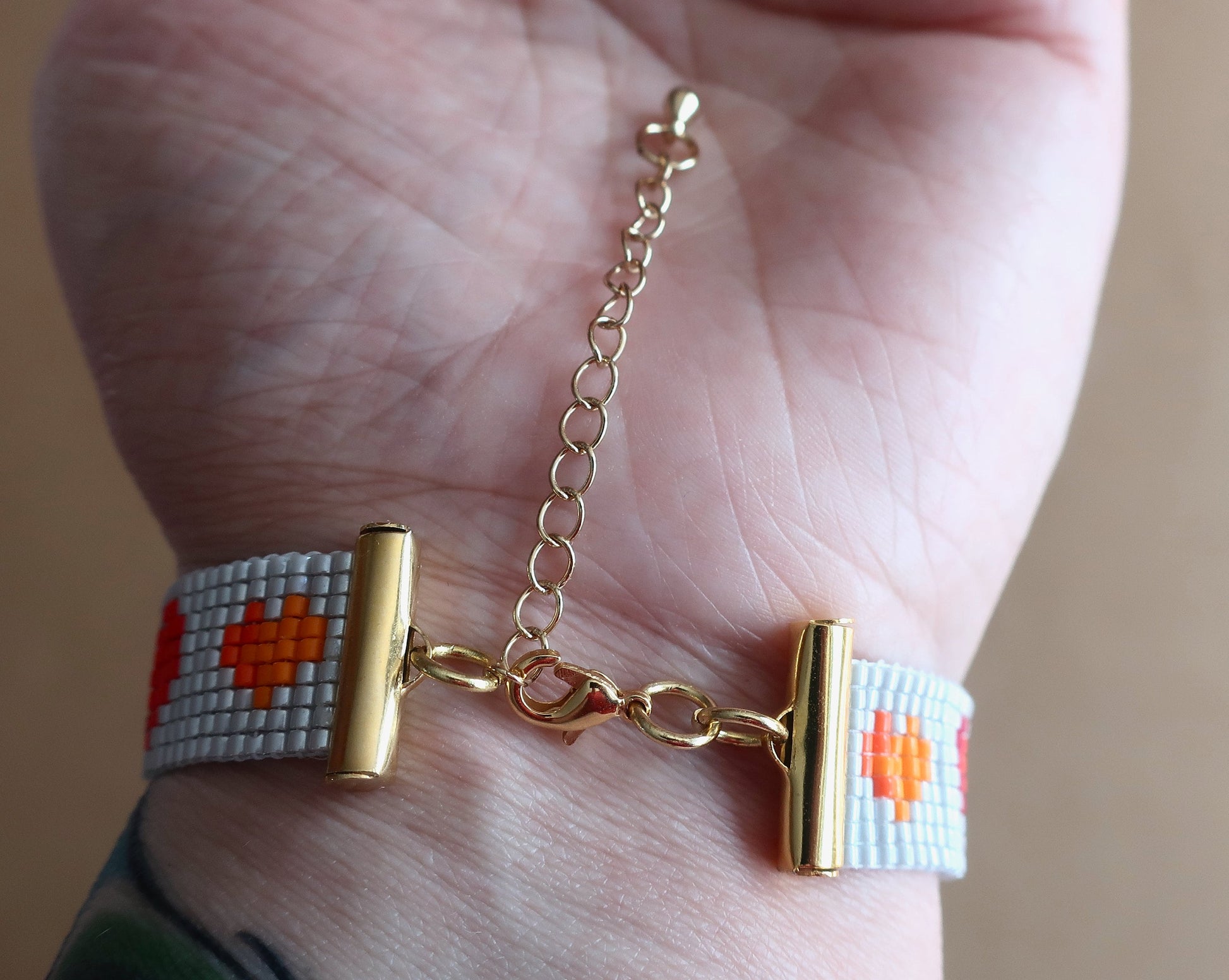 Dies ist ein handgewebtes Armband aus hochwertigen japanischen Miyuki-Perlen. Es hat goldfarbene Röhrenenden, einen Karabinerhaken als Verschluss und eine 5,5 cm lange Verlängerungskette. Es ist 1,4 cm breit.