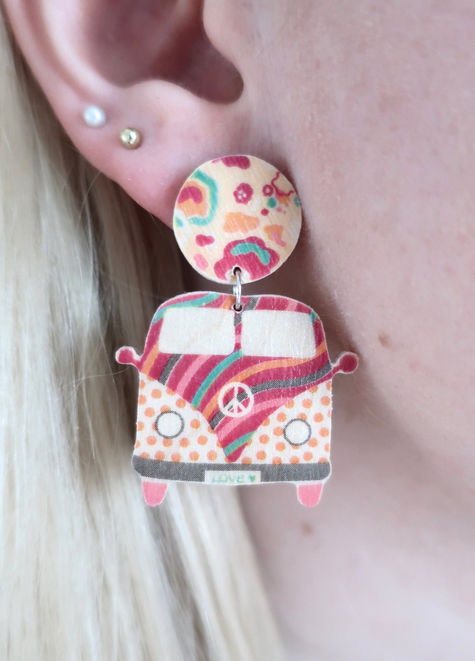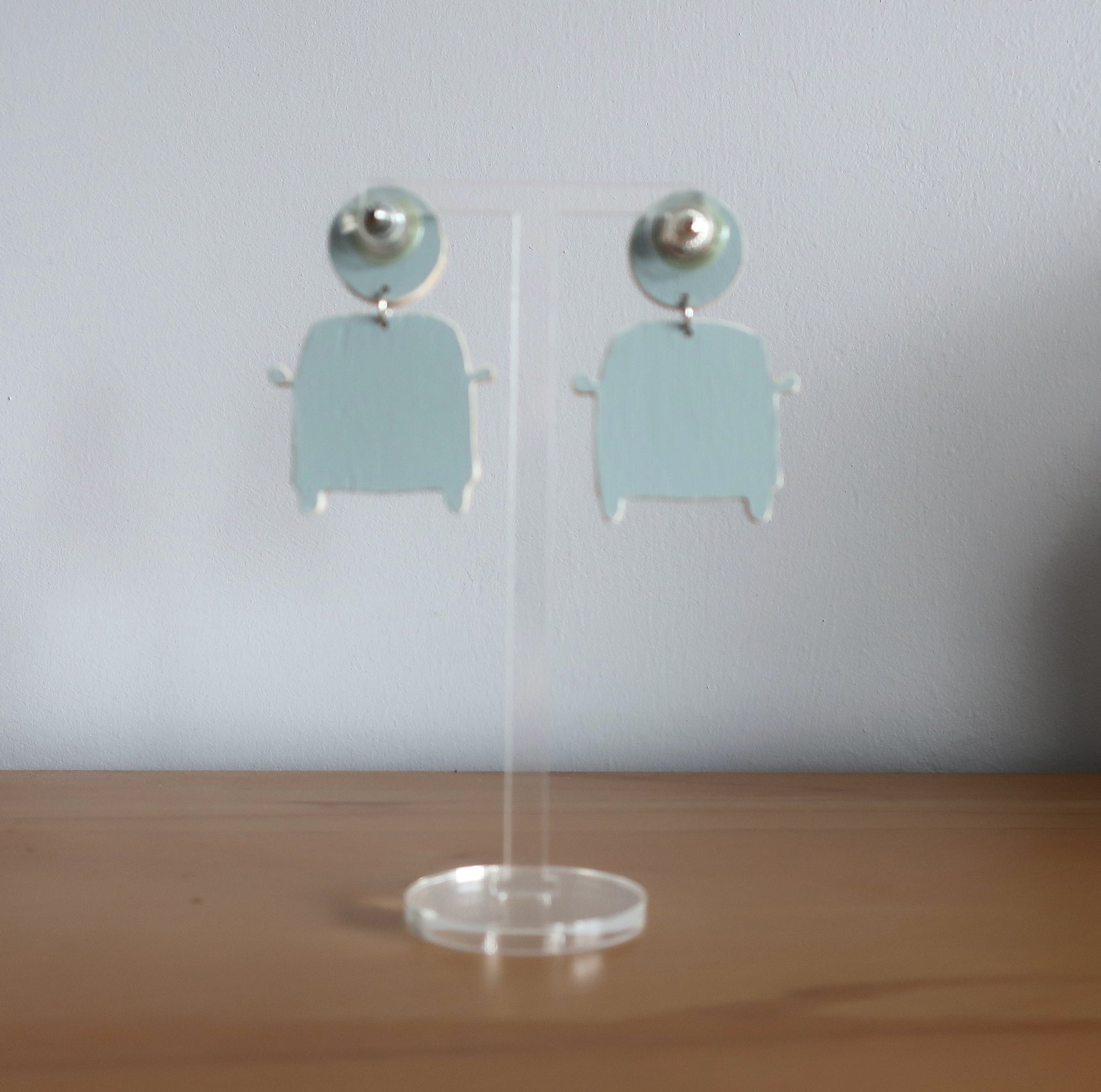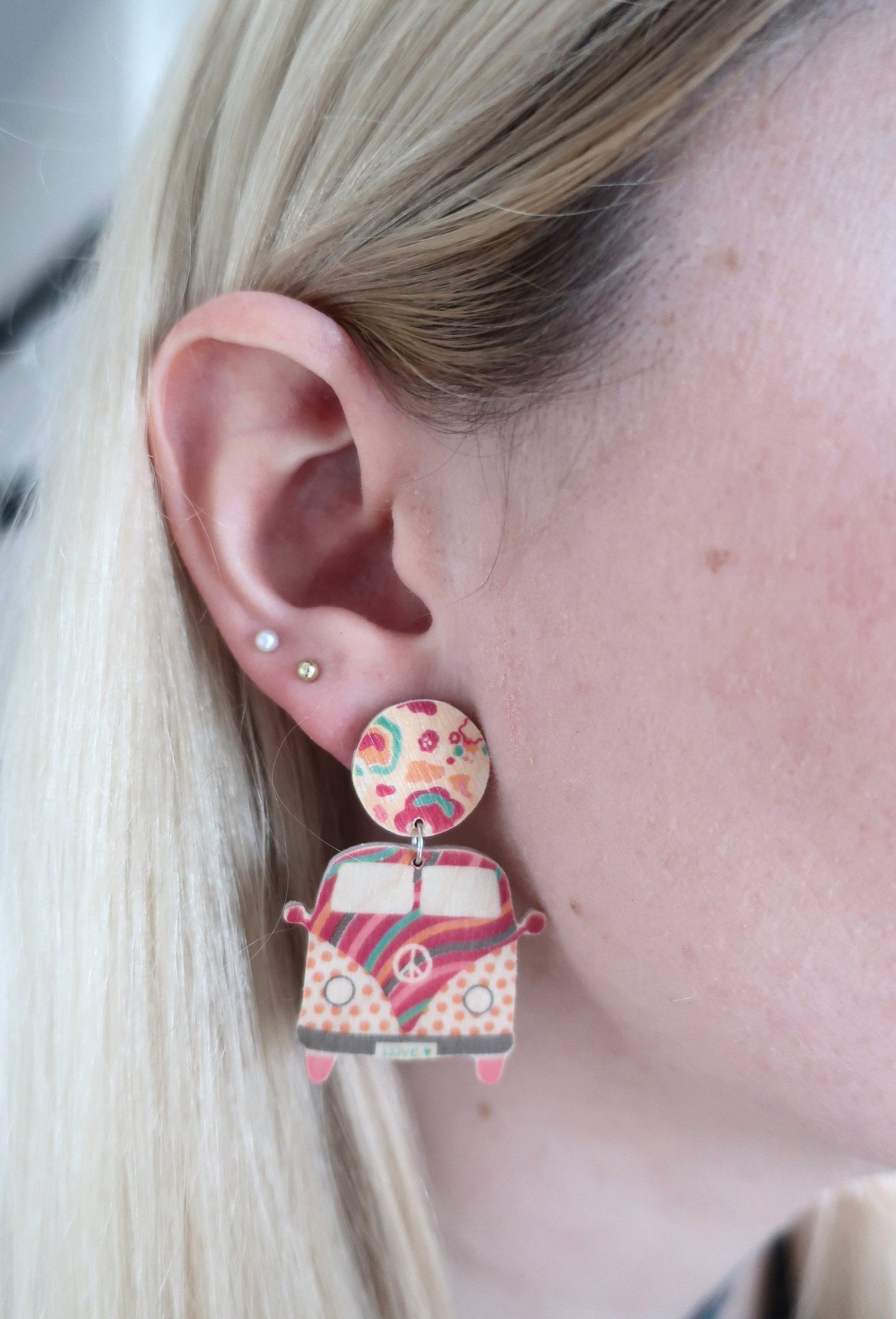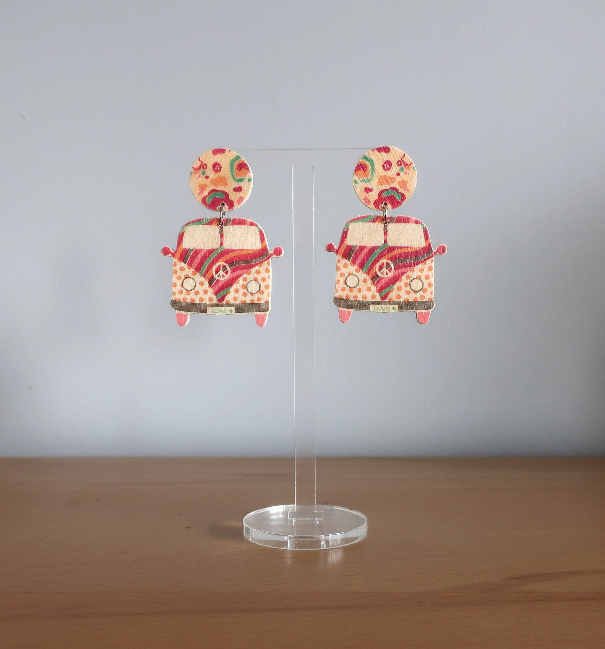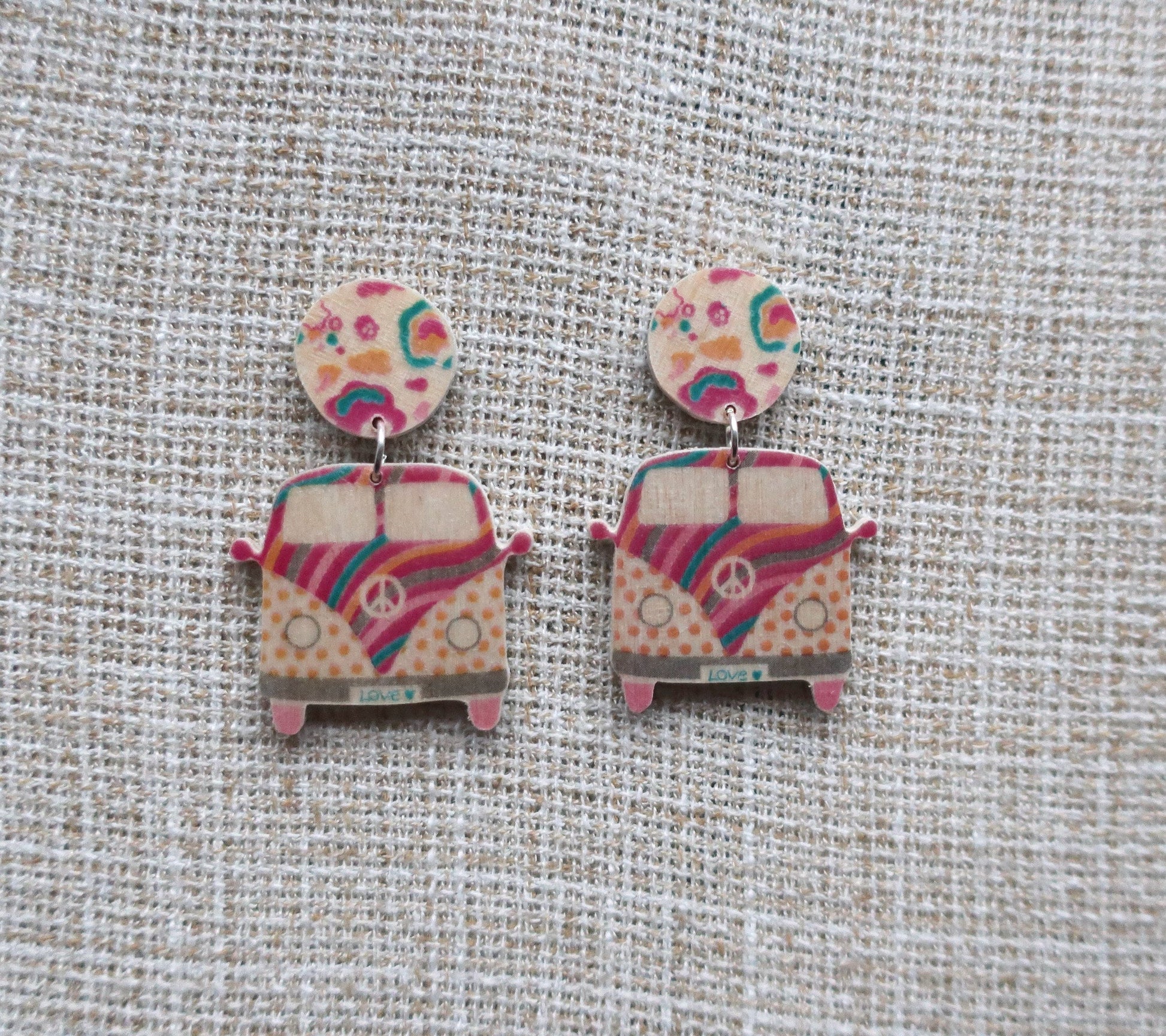 Für diese Ohrringe habe ich eine Zeichnung am Computer erstellt, die ich anschließend manuell auf Birkenholz übertragen und dann mit einer Dekupiersäge ausgesägt habe. Um die Haltbarkeit zu verbessern wurde eine Schicht matter Lack aufgetragen.