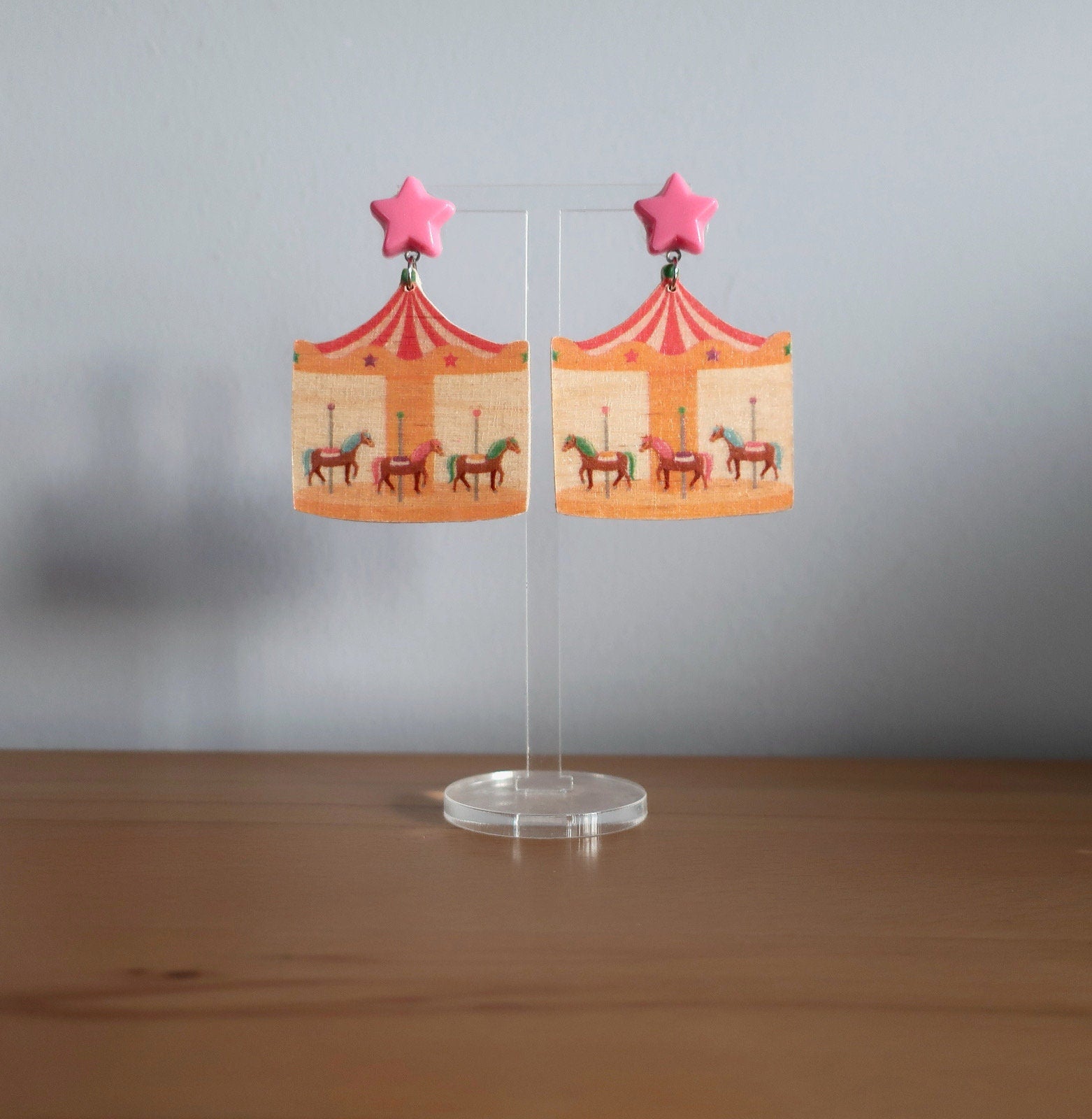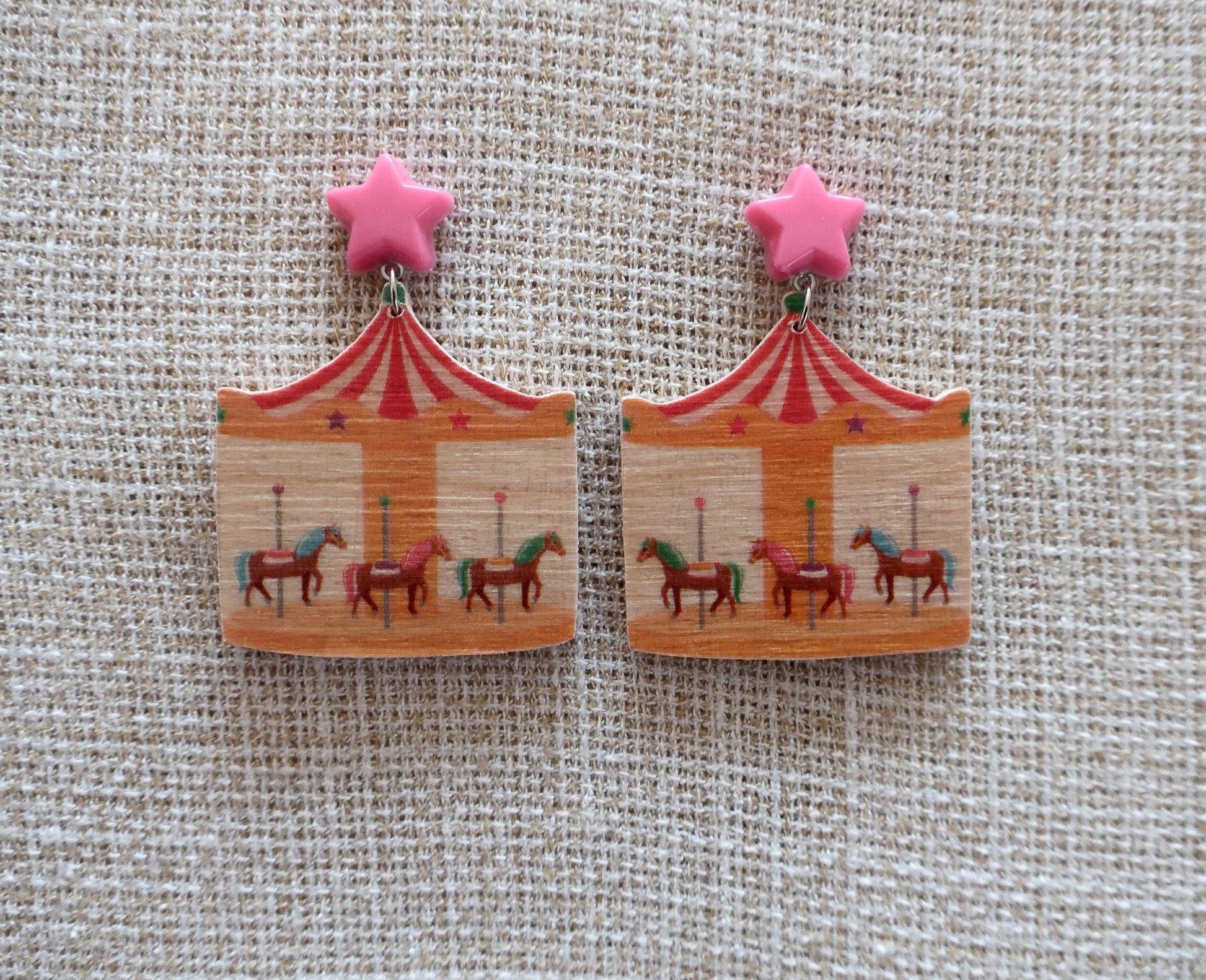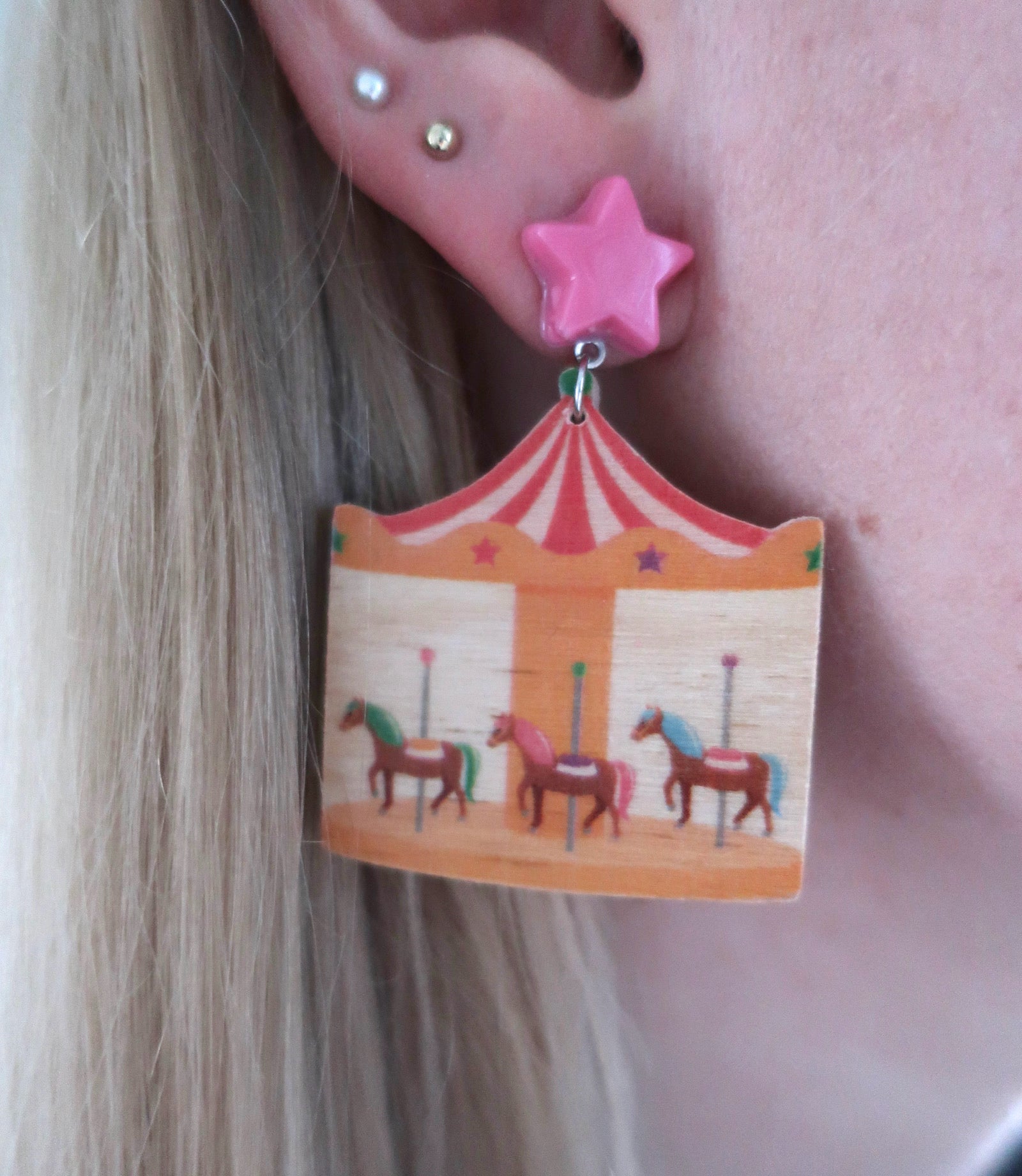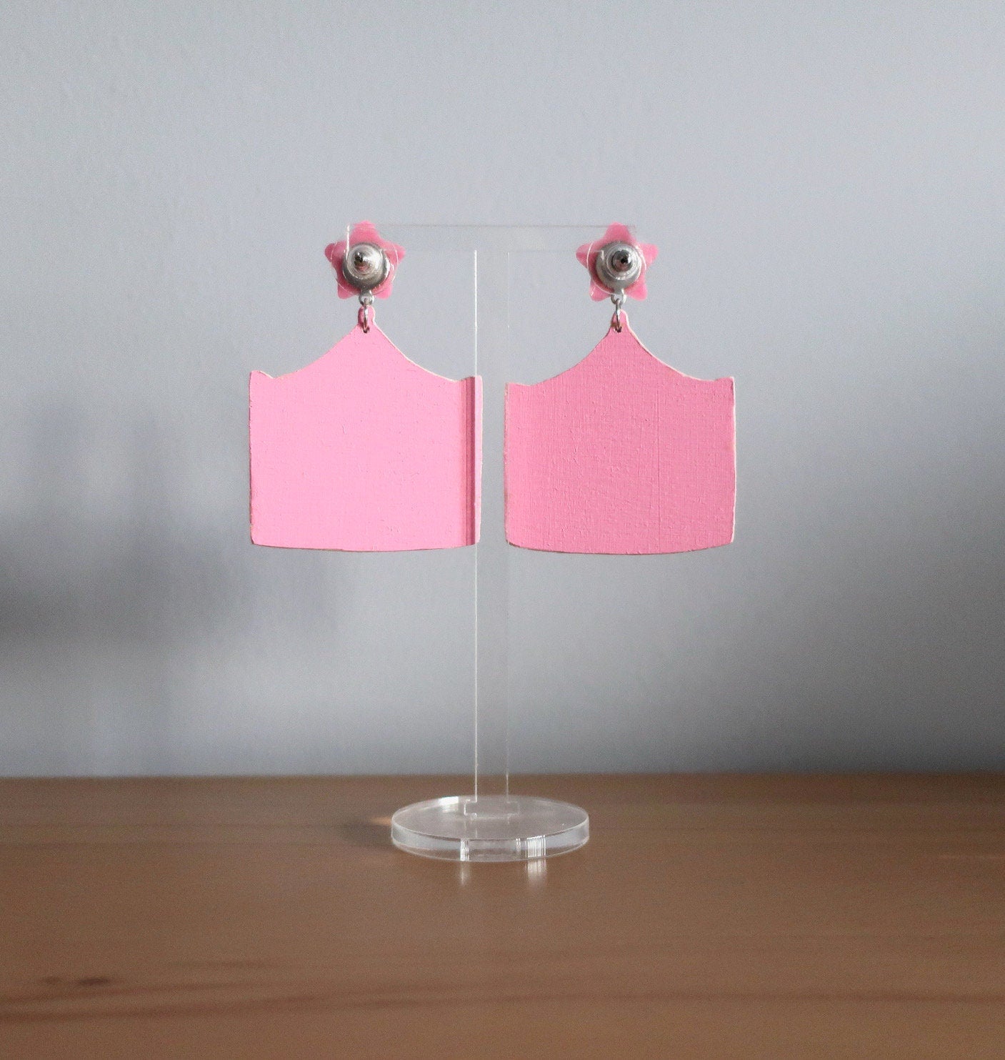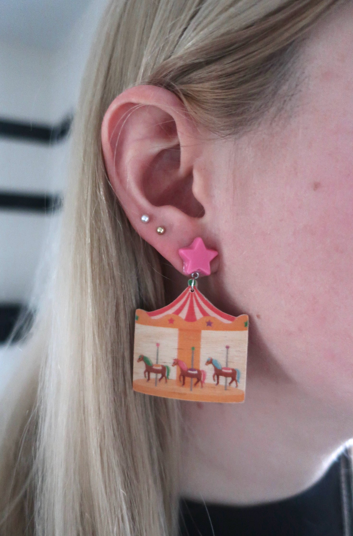 Für diese Ohrringe habe ich eine Zeichnung am Computer erstellt, die ich anschließend manuell auf Birkenholz übertragen und dann mit einer Dekupiersäge ausgesägt habe. Um die Haltbarkeit zu verbessern wurde eine Schicht matter Lack aufgetragen.