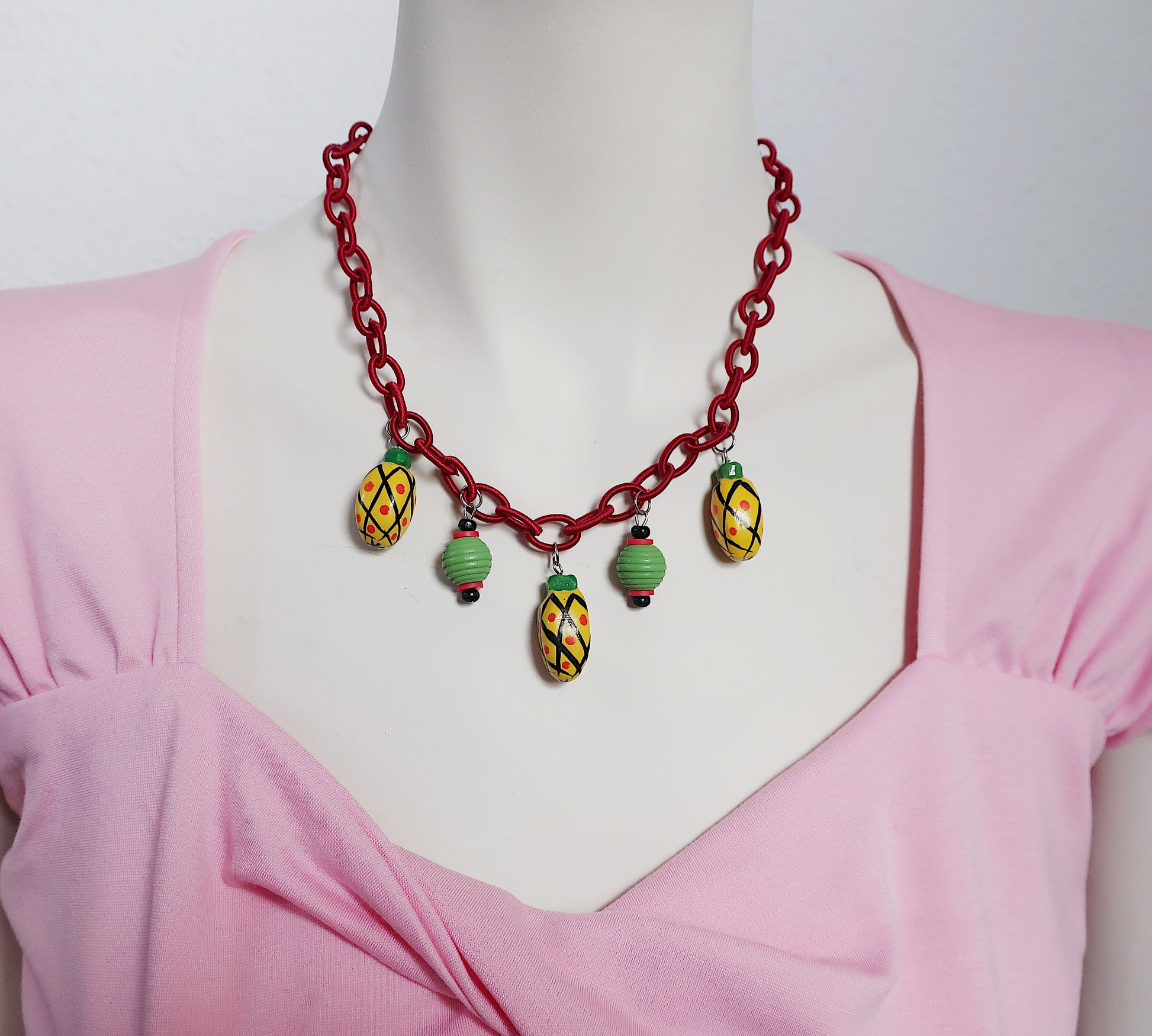 Kette mit Vintage-Lampionanhängern und Anhängern aus Holz-und Katsukiperlen. Die Lampions sind ungefähr 3 cm lang.