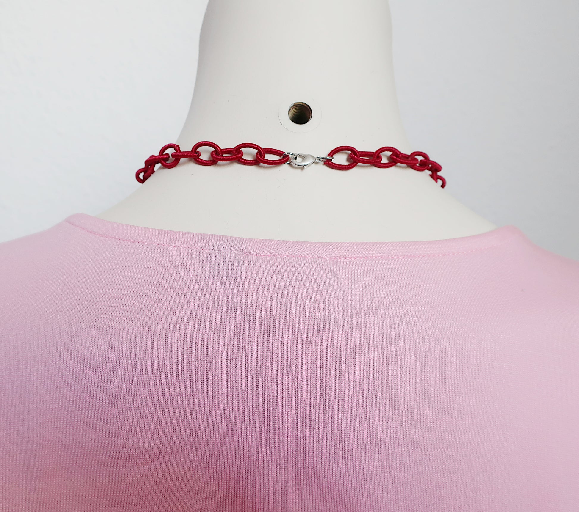 Die Textilkette ist ungefähr 44 cm lang und hat einen Karabinerverschluss. Die gesamte Kettenlänge (mitsamt Verschluss) beträgt ungefähr 46,5 cm.
